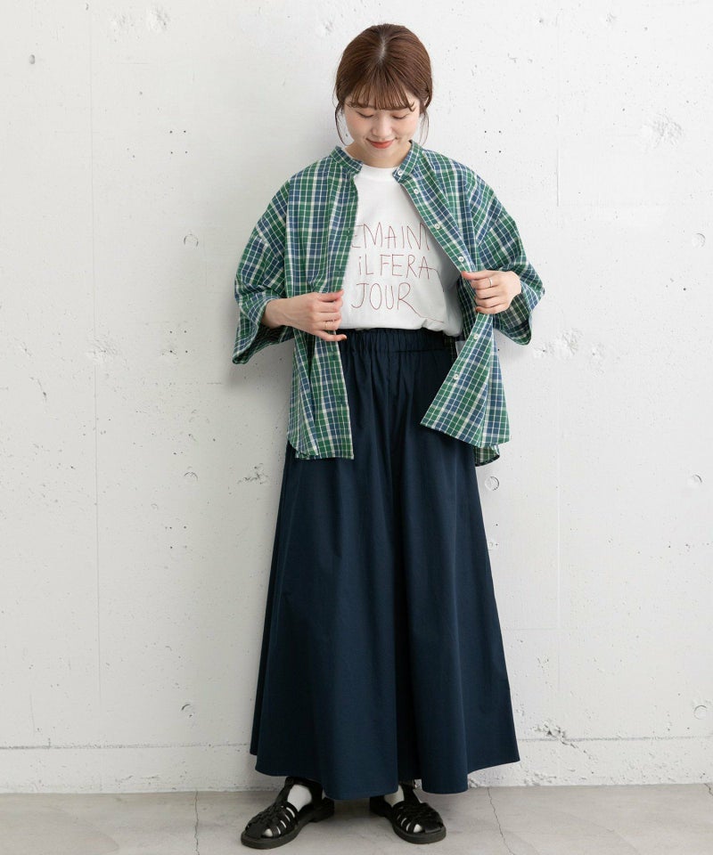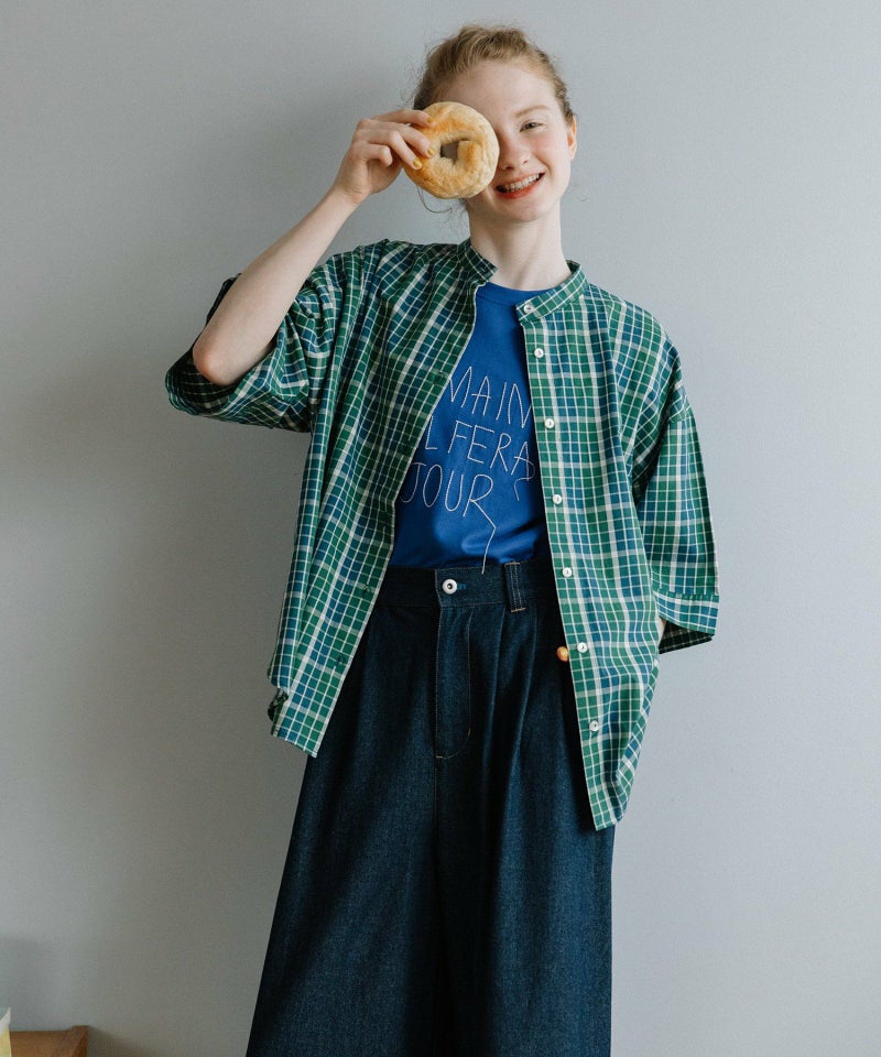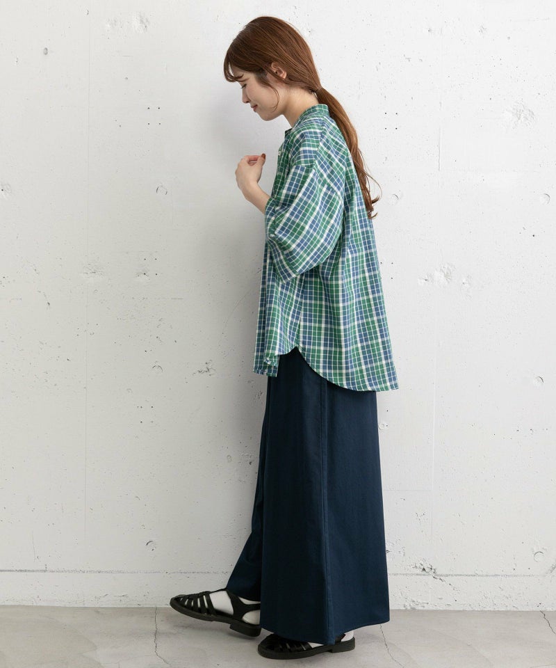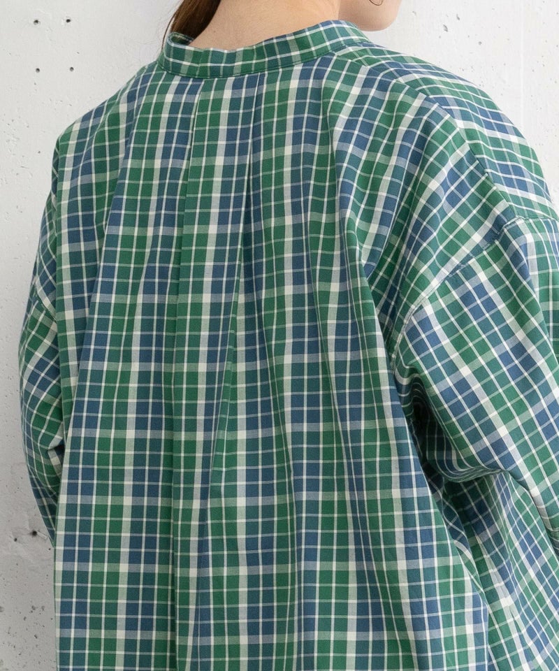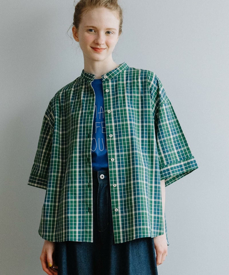 落ち着いた配色で組んだオリジナルのマドラスチェック。身巾と袖巾をゆったりと取ったワイドシルエットのブラウス。1枚で着ても羽織りとしても使えます。丸みのあるラウンドテールもポイント。