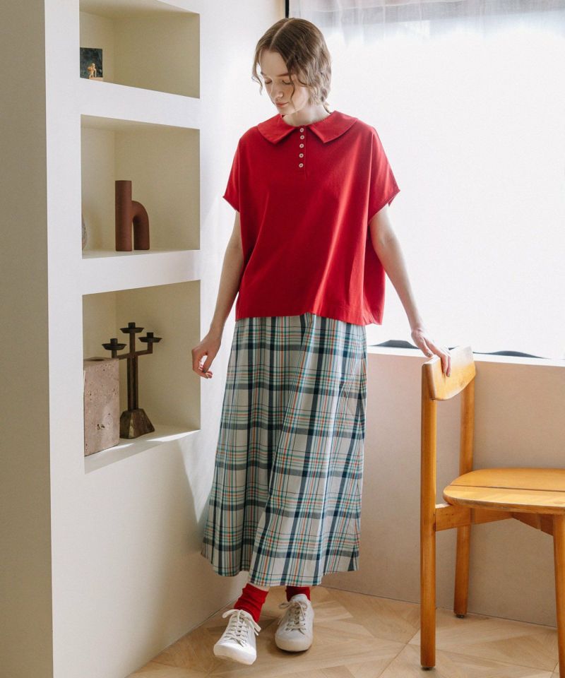 同素材の2511146965 フリル衿付きマドラスチェックブラウスとのセットアップコーディネートもおすすめです。