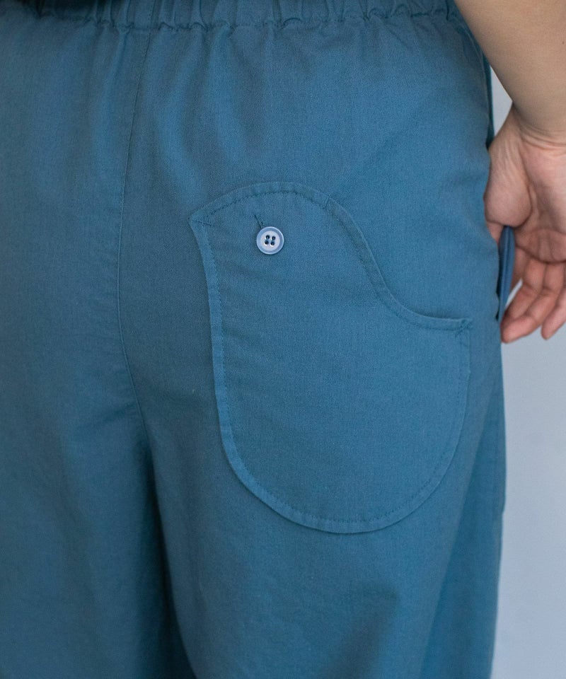 とり型のポケットがついたPOU DOU DOU定番人気のパンツ。ナチュラルな風合いのコットンキャンバスと通年着られるデニム生地を使用しました。セミワイドのストレートシルエットで、着回しの利くデザイン。ウエストはゴム仕様、内紐でサイズ感の調節ができます。両サイドポケットつき。