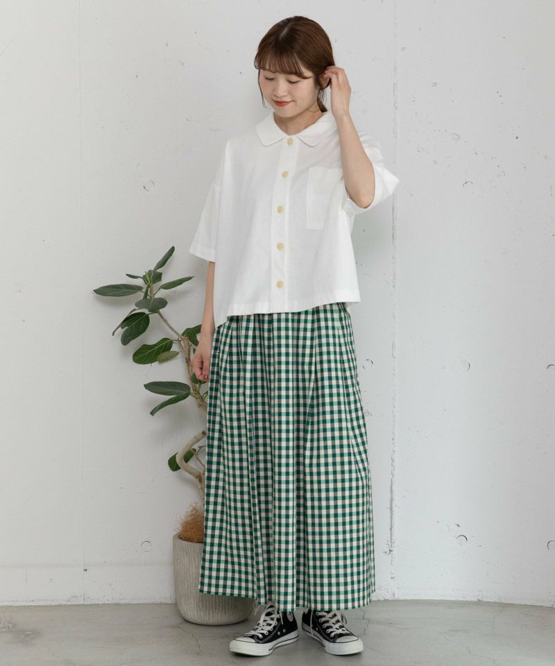 落ち着いた配色で組んだオリジナルのマドラスチェック。程よいボリューム感ですっきり見えし、スカートのように見えて活動しやすいシルエットです。シンプルなトップス合わせも着映えします。ウエストはゴム仕様、内紐でサイズ感の調節も可能です。両サイドポケット付き。