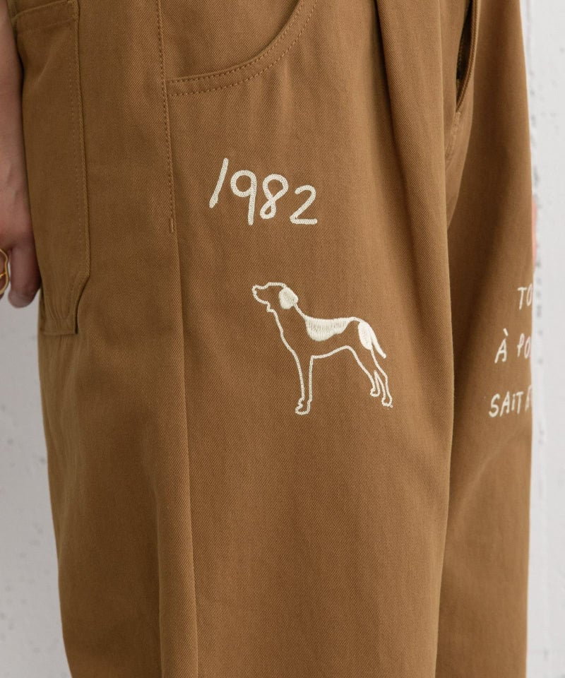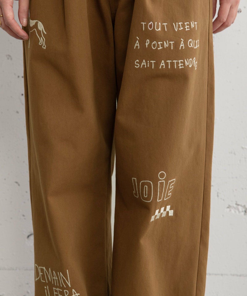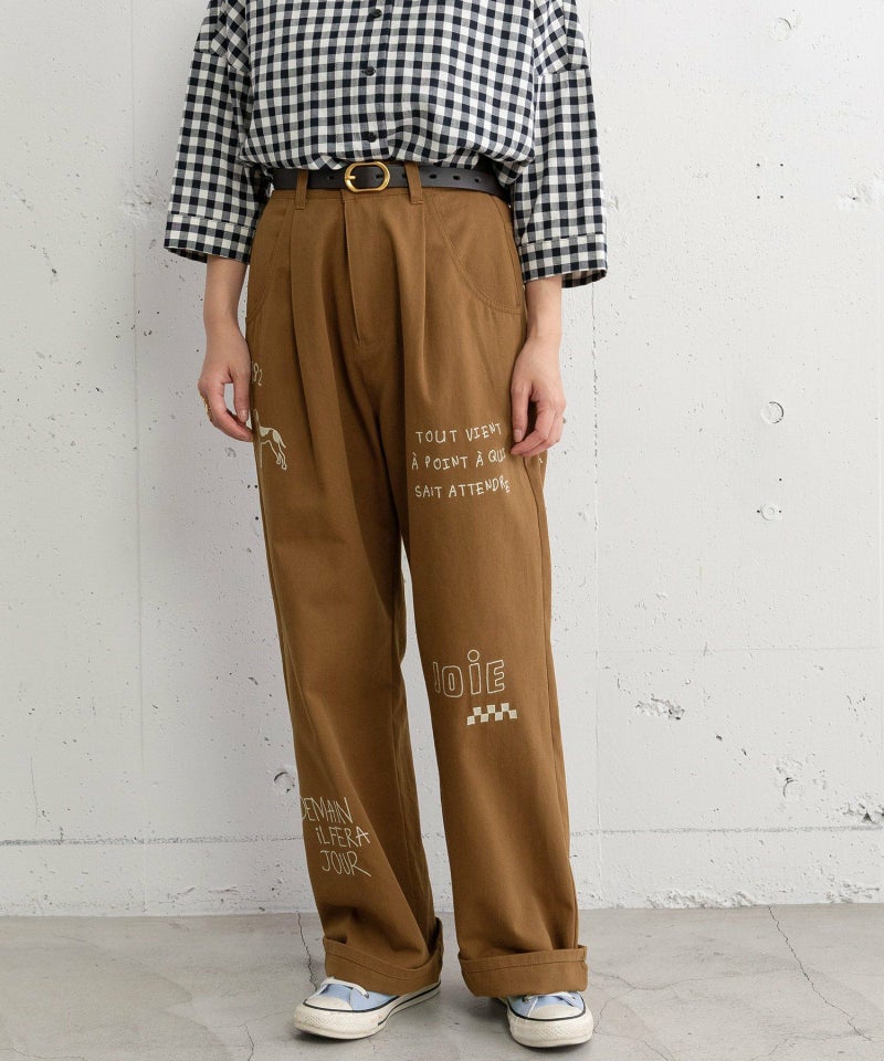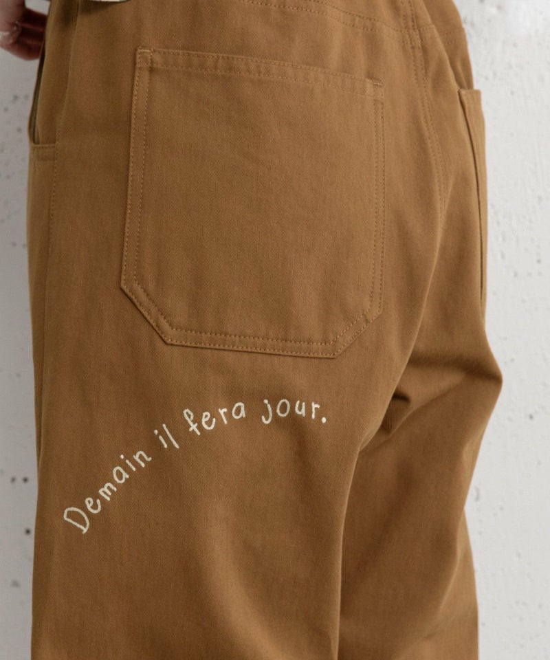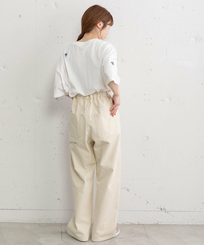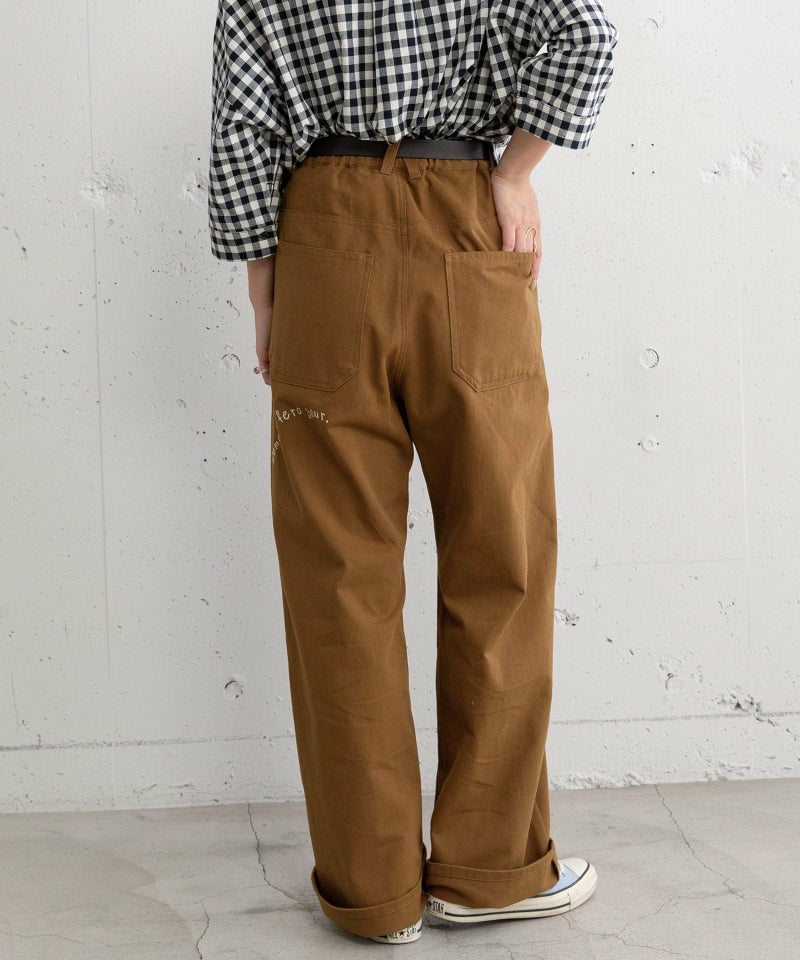 「ちょうどよく」キャッチーな大人の刺繍パンツ。フロントにあしらった手描きタッチの刺繍がアイコニックなデザイン。すっきりとしたストレートシルエットで、合わせやすさも抜群です。コットンツイルのラフな風合いが、大人のカジュアルコーデにマッチします。後ろウエストにのみゴムを入れたバックゴム仕様で、フロントはすっきりと見えつつ、楽な履き心地になっています。両サイド・ヒップにポケット付き。