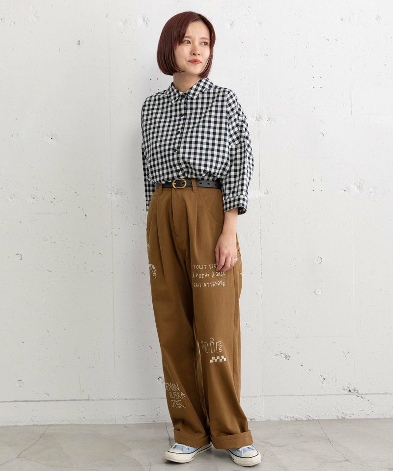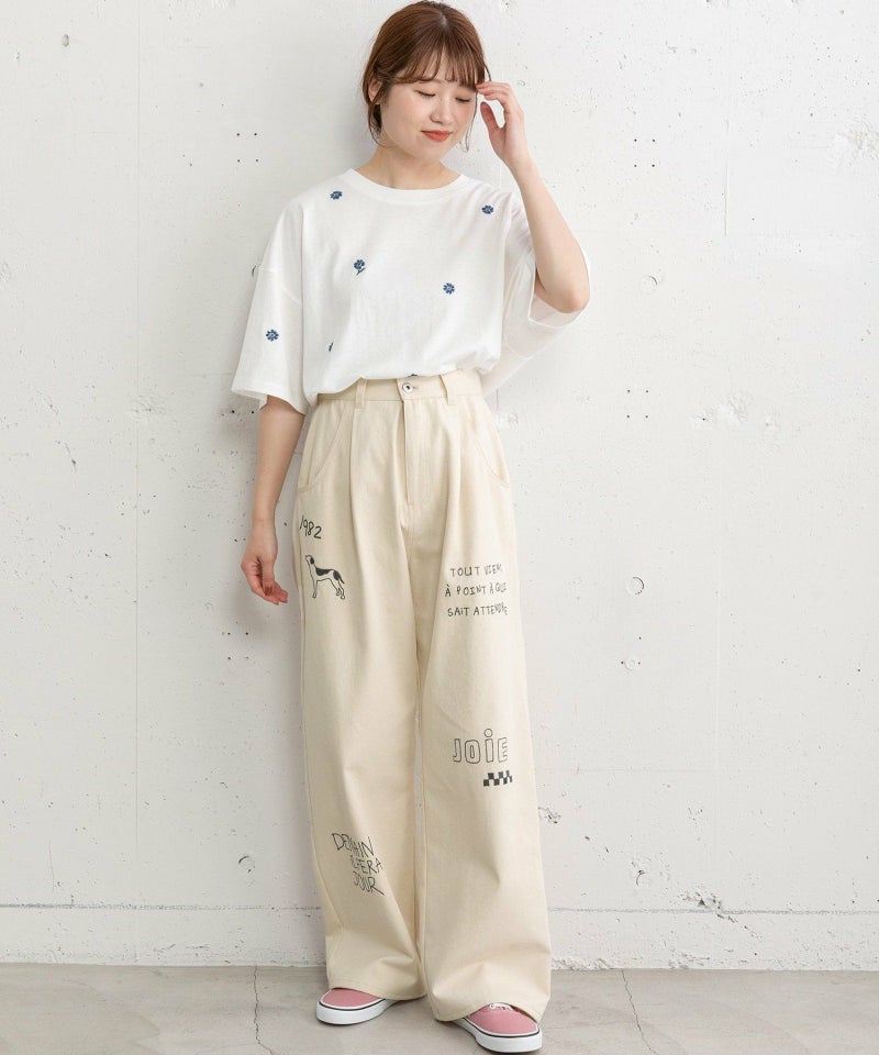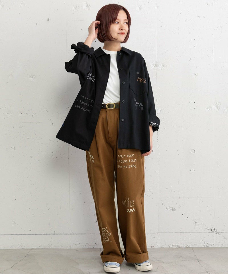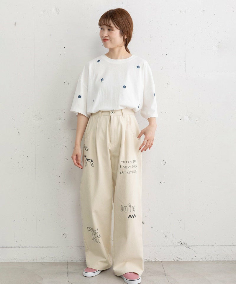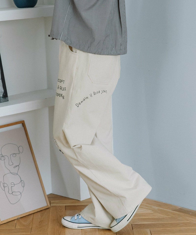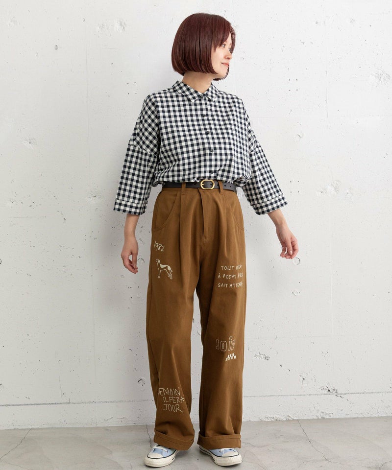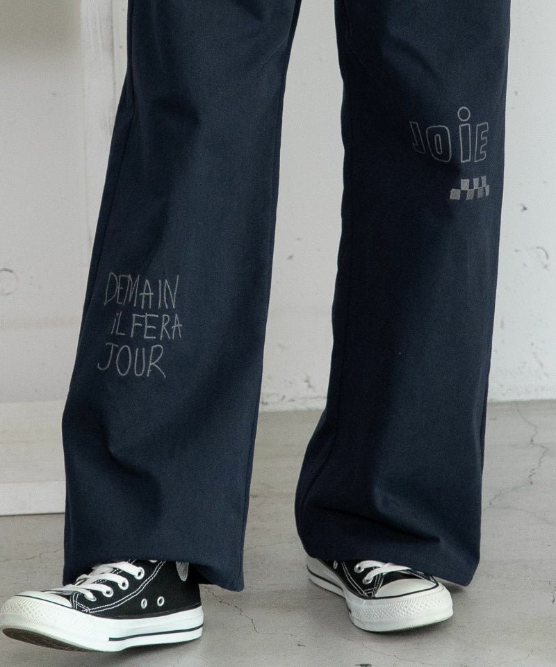 「ちょうどよく」キャッチーな大人の刺繍パンツ。フロントにあしらった手描きタッチの刺繍がアイコニックなデザイン。すっきりとしたストレートシルエットで、合わせやすさも抜群です。コットンツイルのラフな風合いが、大人のカジュアルコーデにマッチします。後ろウエストにのみゴムを入れたバックゴム仕様で、フロントはすっきりと見えつつ、楽な履き心地になっています。両サイド・ヒップにポケット付き。