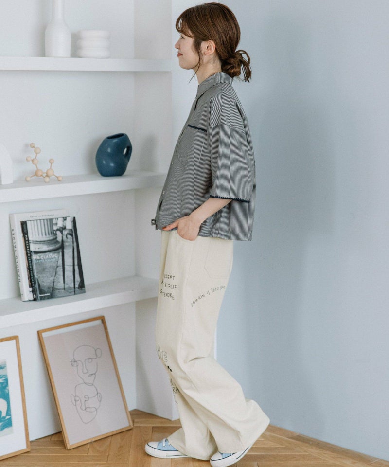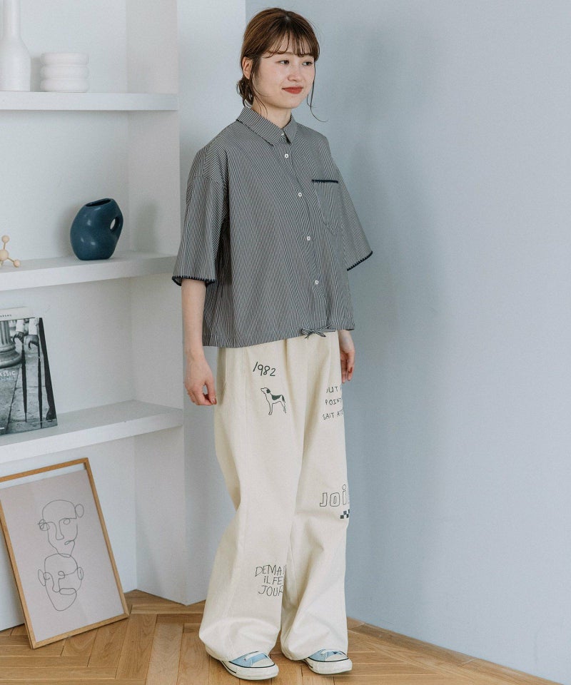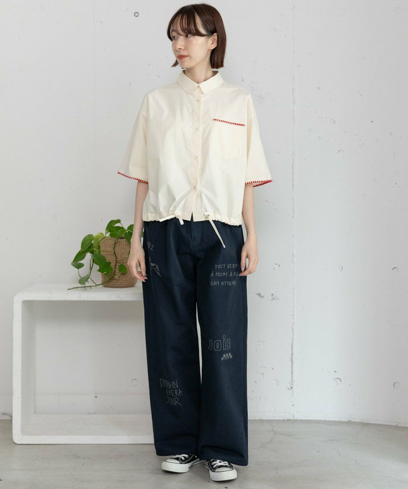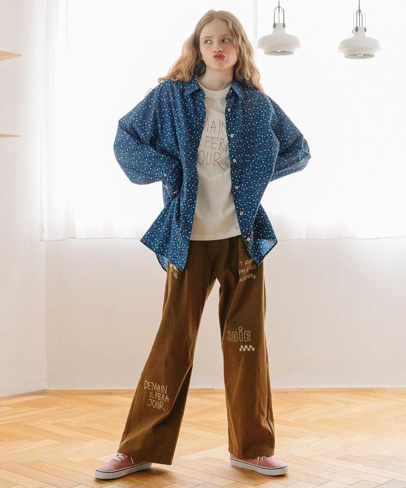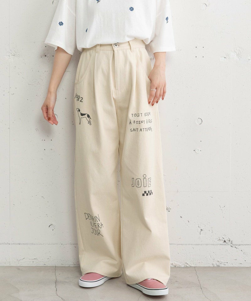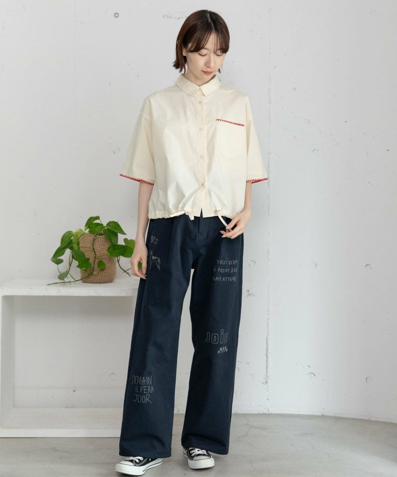 「ちょうどよく」キャッチーな大人の刺繍パンツ。フロントにあしらった手描きタッチの刺繍がアイコニックなデザイン。すっきりとしたストレートシルエットで、合わせやすさも抜群です。コットンツイルのラフな風合いが、大人のカジュアルコーデにマッチします。後ろウエストにのみゴムを入れたバックゴム仕様で、フロントはすっきりと見えつつ、楽な履き心地になっています。両サイド・ヒップにポケット付き。