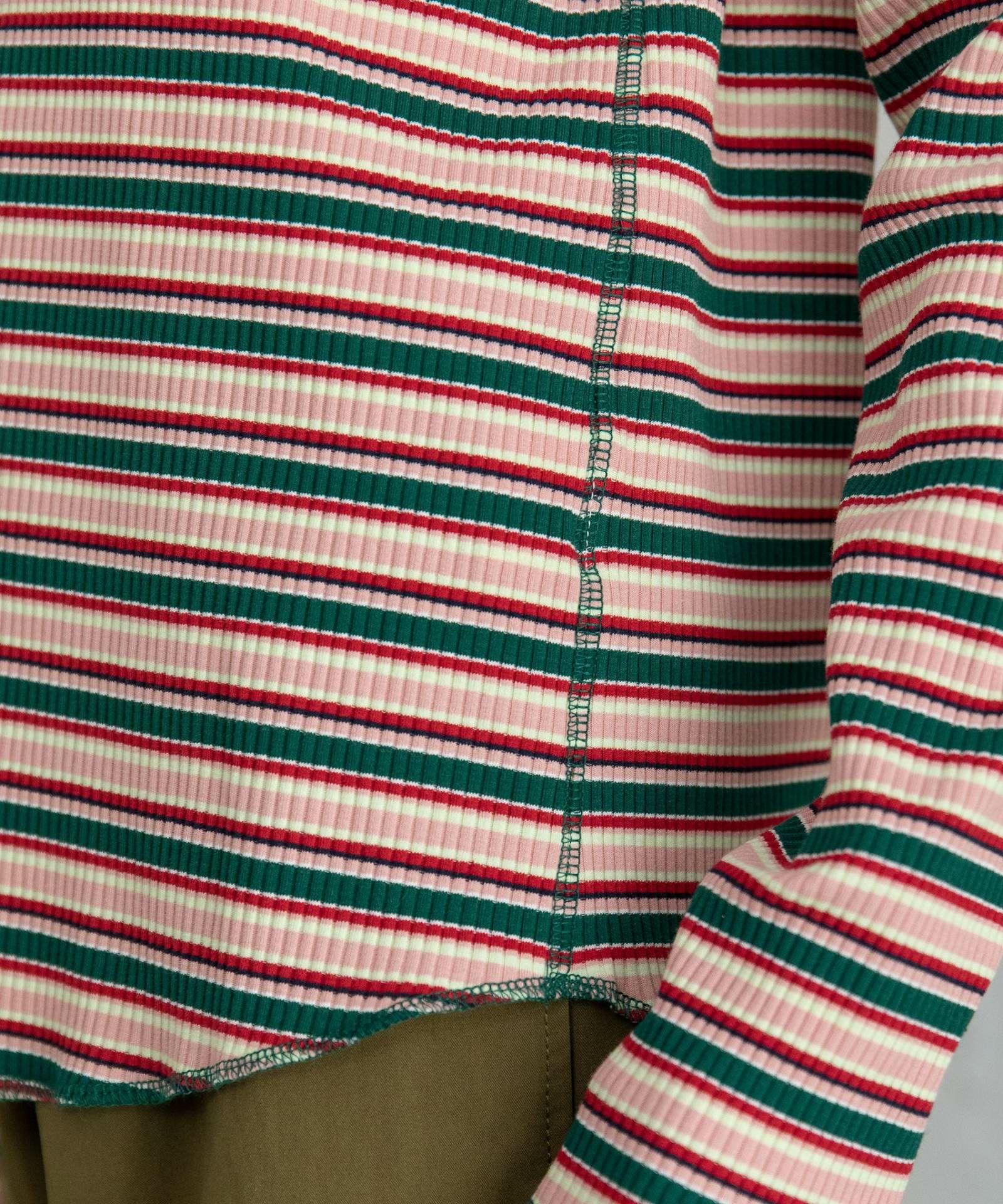 程よく首に沿うモックネックのトップス。タートルネックに比べて短めのネックなので、リラックスして着られます。配色のロックステッチがさりげないアクセント。アイボリー・ブラックは小花柄の天竺素材、ピンク・ブルーはマルチボーダーのリブ素材です。身体のラインを拾いすぎない程よくゆとりのあるサイジングです。