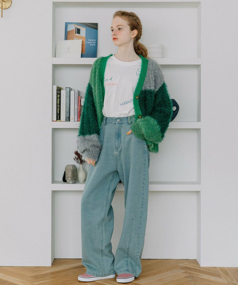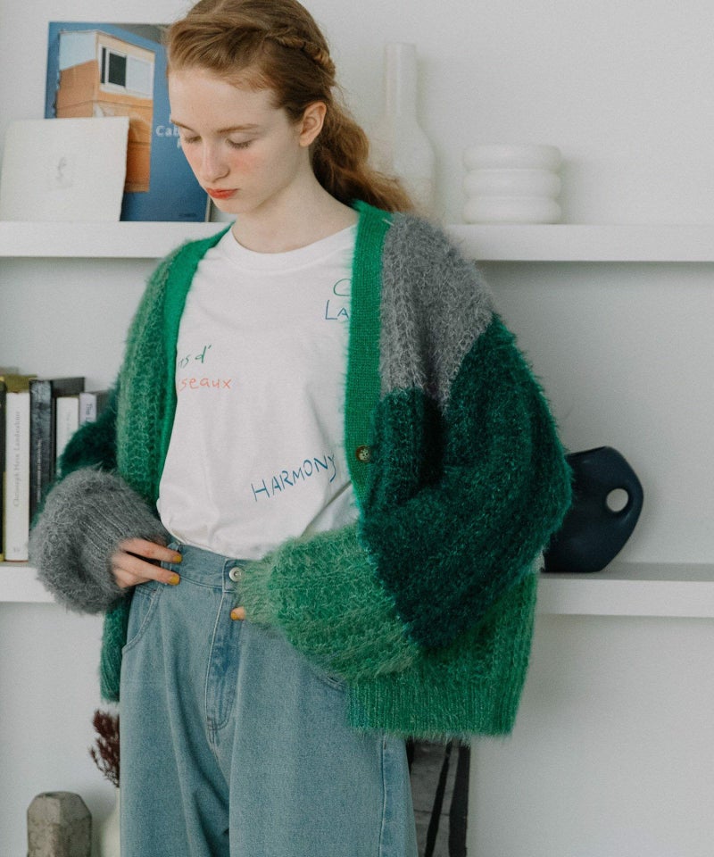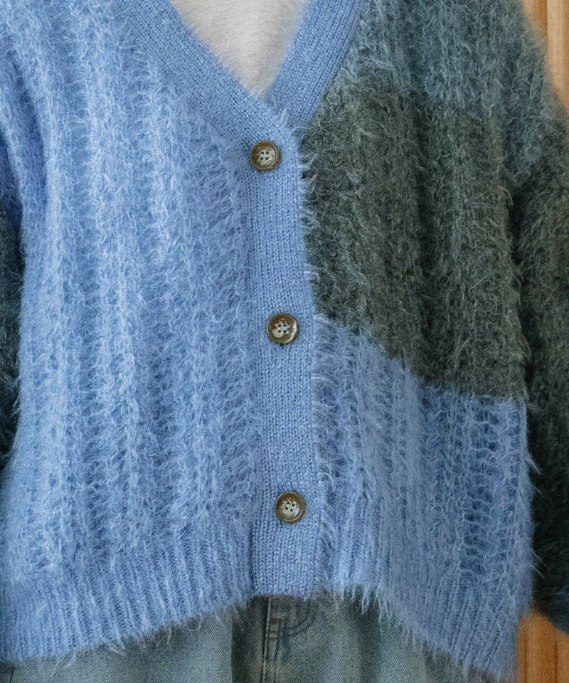 ふんわりと起毛感のある糸で編み立てた、あたたかみたっぷりのバイカラーニットカーディガン。ゆったりしたサイズ感とVネックデザインで、ラフに羽織るだけで旬な雰囲気に。暗くなりがちな秋冬のスタイリングに、彩りを添えてくれるアイキャッチな一枚です。