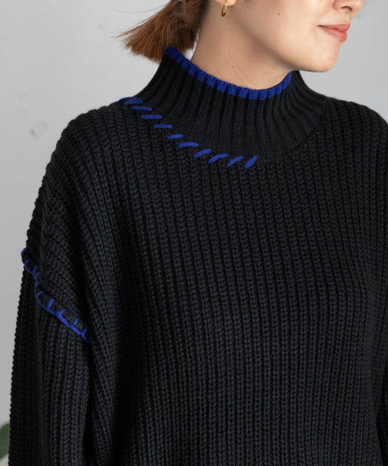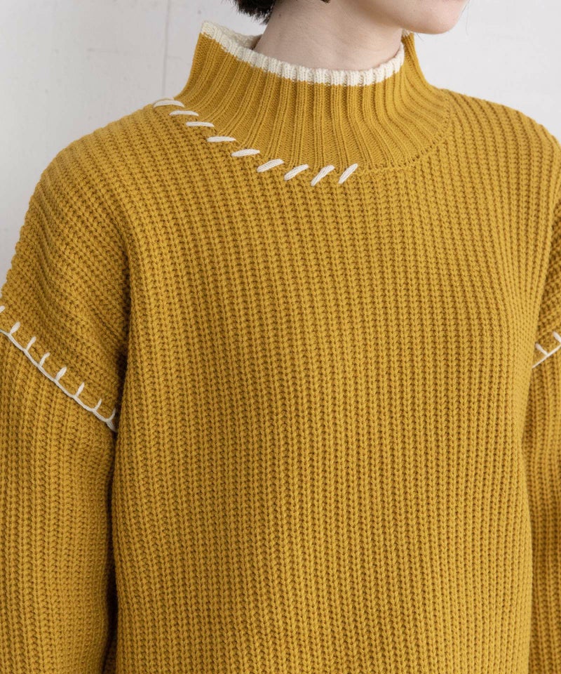 ざっくりとした編み目と、ゆったり着られるラグランスリーブが魅力の、毎日着たくなるベーシックニット。首元まで暖かいハイネックで、配色デザインがさりげないアクセントに。ハンドステッチ刺繍がポイントです。柄ボトムやカラーパンツなど、ちょっと遊び心のあるアイテムとも相性抜群!