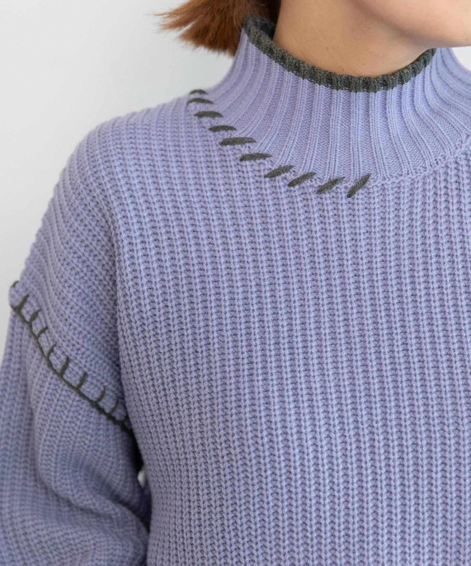 ざっくりとした編み目と、ゆったり着られるラグランスリーブが魅力の、毎日着たくなるベーシックニット。首元まで暖かいハイネックで、配色デザインがさりげないアクセントに。ハンドステッチ刺繍がポイントです。柄ボトムやカラーパンツなど、ちょっと遊び心のあるアイテムとも相性抜群!