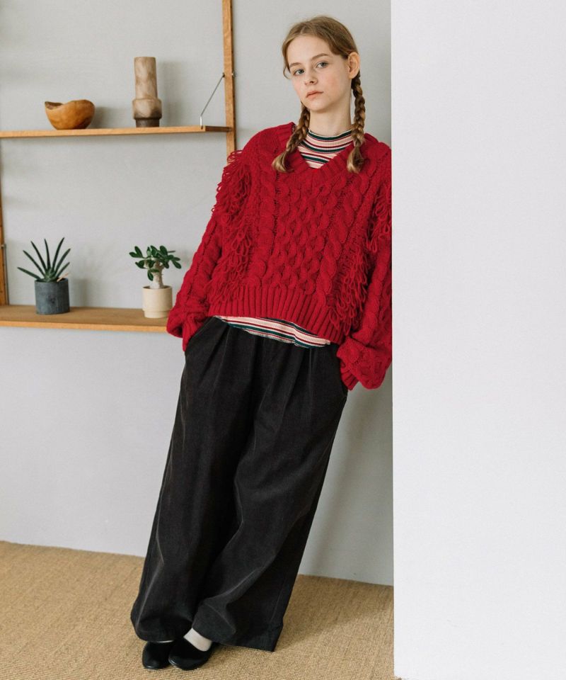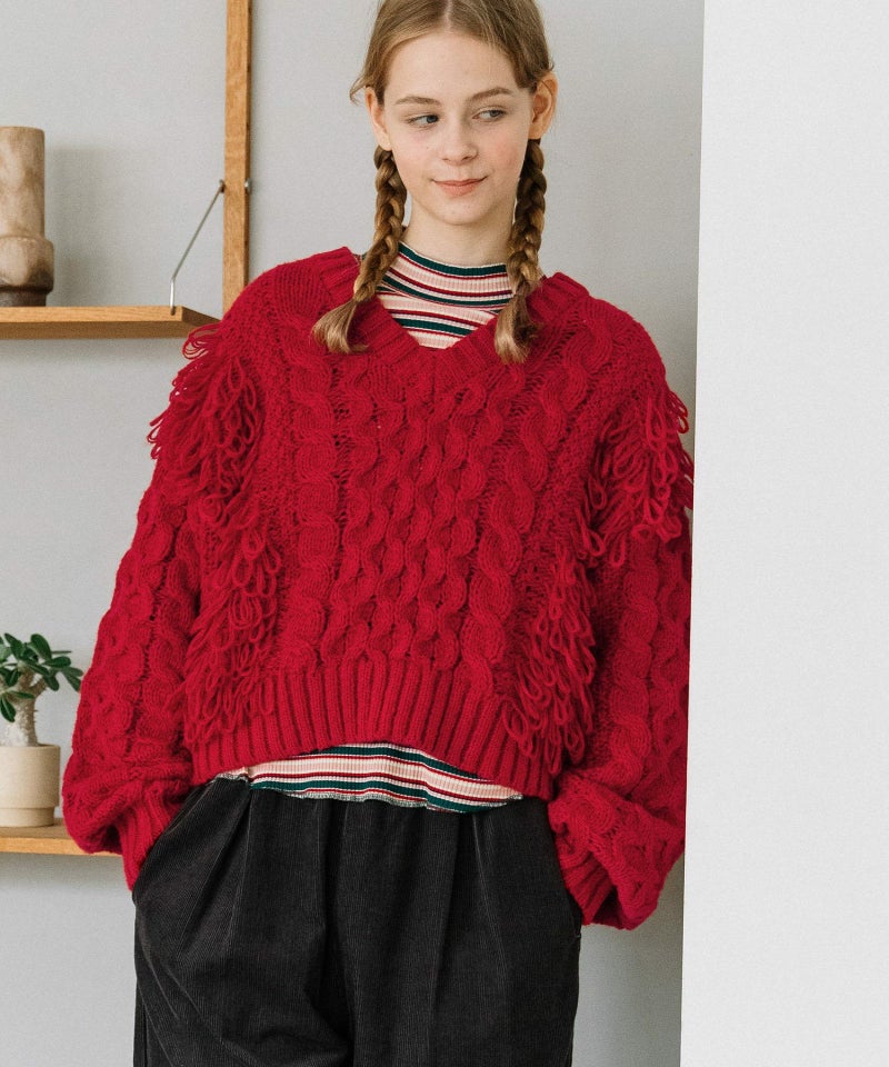 フリンジのようなループ編み×ケーブル編みをミックスした、動きのある1枚。すっきりとした着丈とVネックの抜け感が、ラフな大人カジュアルスタイルを叶えてくれます。