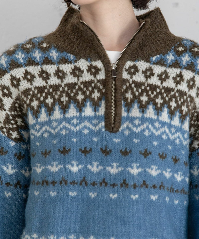ノルディックな柄をモダンに落とし込んだジャガードニット。トレンドのハーフジップ仕様で、程よく抜け感を演出できます。カラーによって雰囲気が変わるのもポイント。すっきり丈でバランスも取りやすく、冬の定番にちょっと新しさを加えてくれます。スカートやワイドパンツと合わせて、ゆるっと大人の休日スタイルに◎