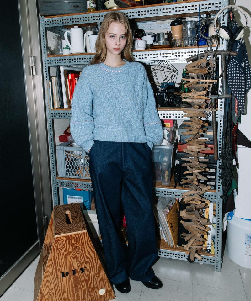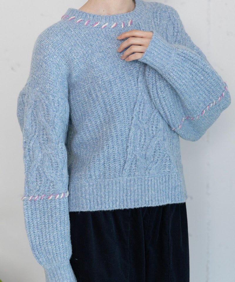 ハンドステッチ刺繍とななめに入ったケーブル柄。ほっこり感と遊び心を散りばめたニットです。リラクシーなオーバーサイズで、着るだけでこなれた雰囲気に。パンツ合わせでラフに着るのが今っぽくおすすめです◎