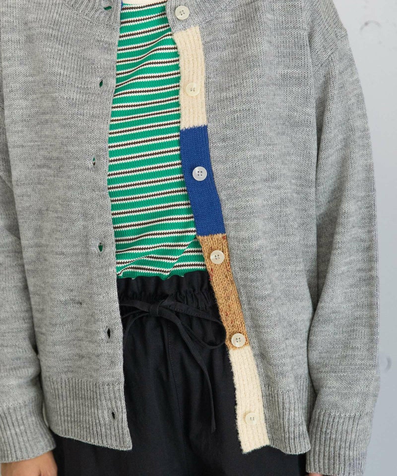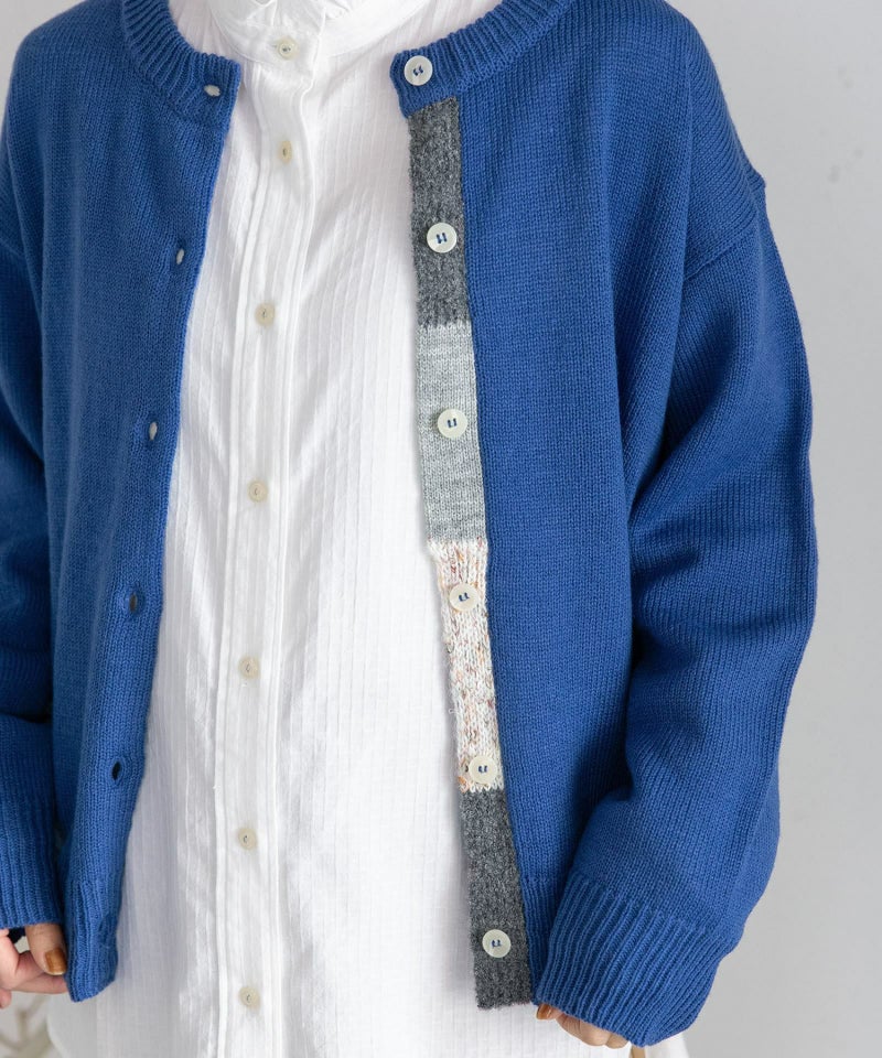 ボタンを開けた時に見える下前立てに異素材を組み合わせ、遊び心を利かせたデザインのPOU DOU DOU定番カーディガン。ウールブレンドの暖かみのある糸で編み立てました。ドロップショルダーにゆとりのある袖巾で、重ね着しやすく重宝する1枚です。