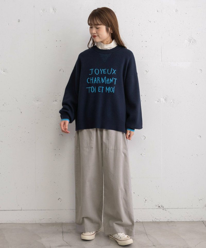 フロントに手描き風のロゴデザインを施したトレンド感のあるニット。程よいオーバーサイズシルエットでリラックス感を持たせながら、リブの切り替えでメリハリをつけスッキリとした印象に仕上げています。汗止め見えするデザインを加え、スウェットのようなカジュアルさがあるアイテムです。