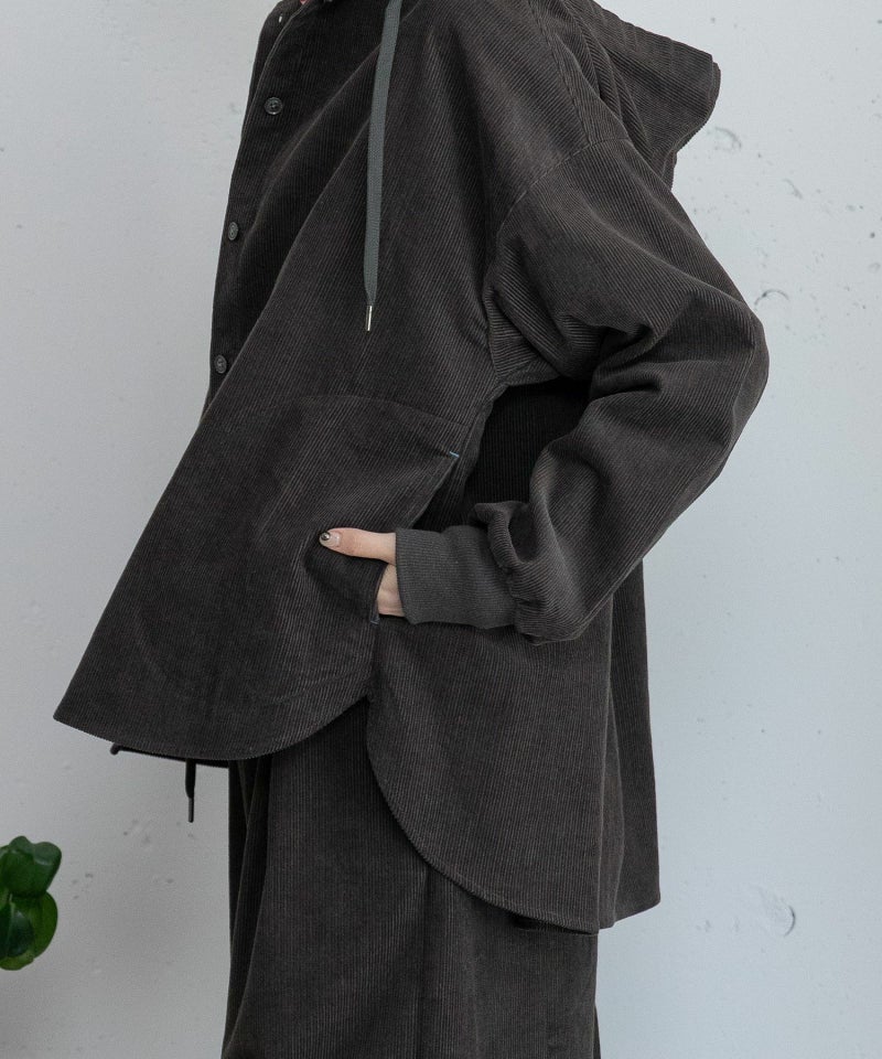 程よいカジュアル感のあるコーデュロイ生地仕立てのフードシャツ。暖かみがあり秋冬の装いにぴったりです。袖口をリブの仕様にし、ジャケットのようにも羽織りやすくしました。両サイドポケット付き。