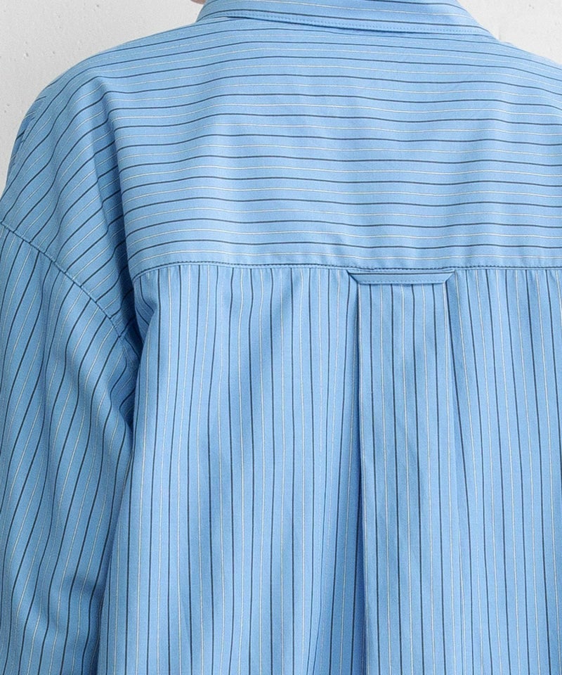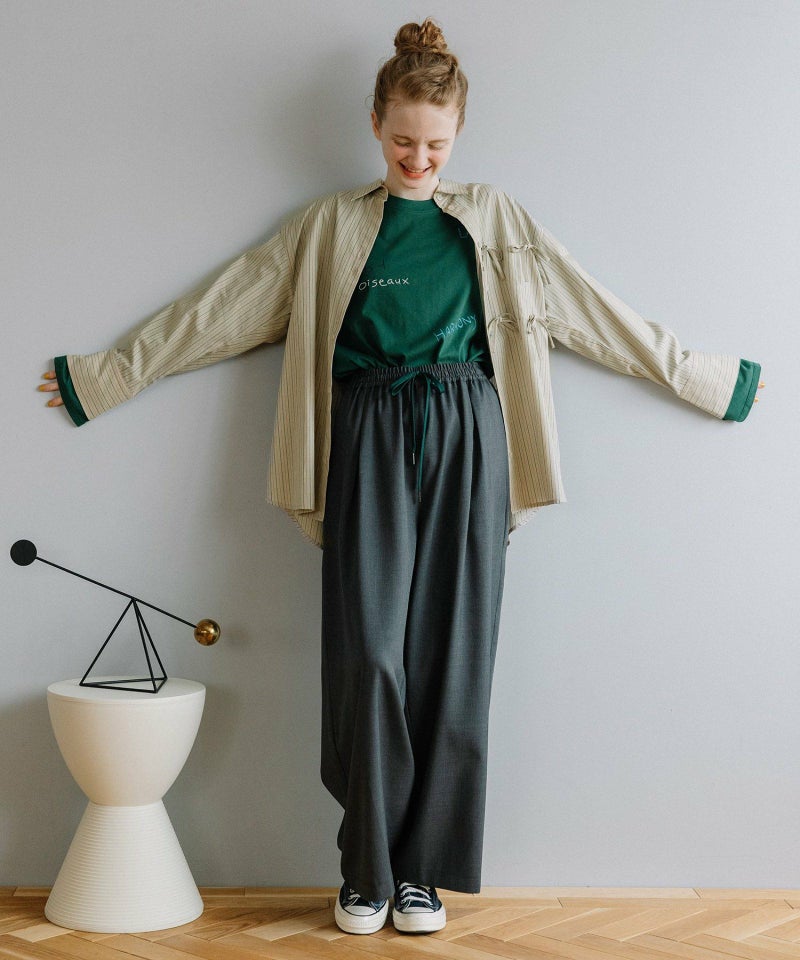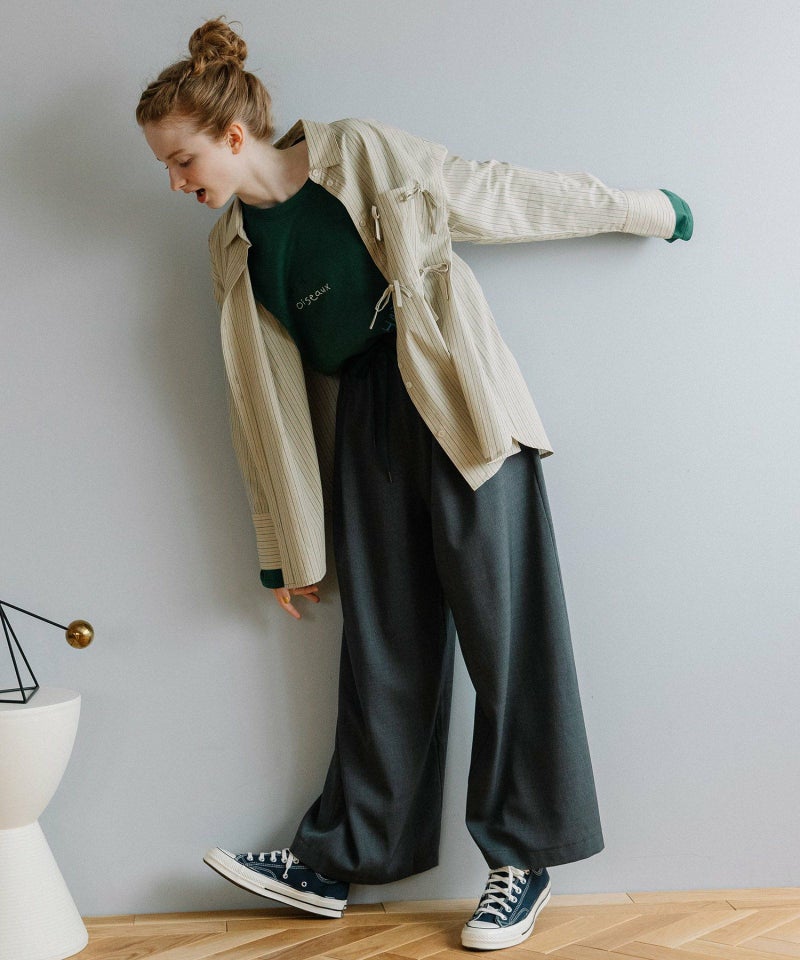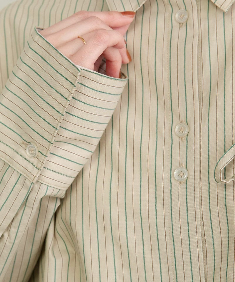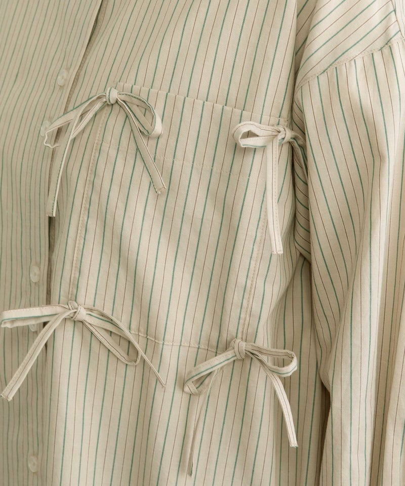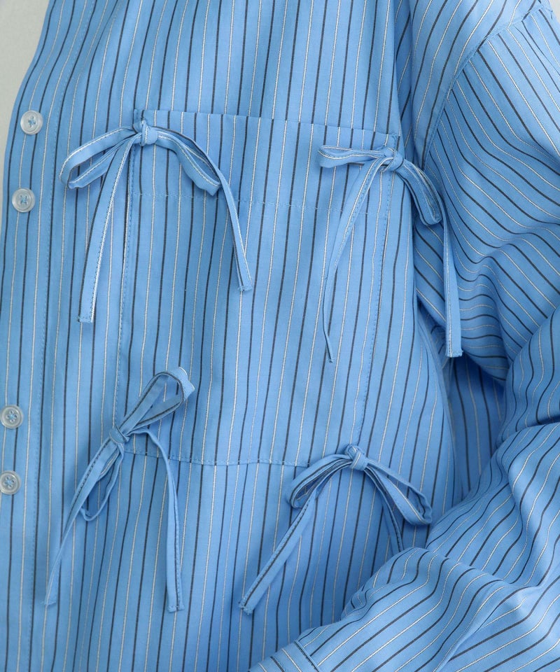 ポケットにたくさんついたリボンデザインが遊び心あるシャツ。かっちりしたストライプシャツを、ゆるっとしたサイズ感で今っぽくアレンジしました。甘さときちんと感をバランスよく楽しめる万能シャツです。フルオープンで羽織としての着用もこなれた印象になり、おすすめです。