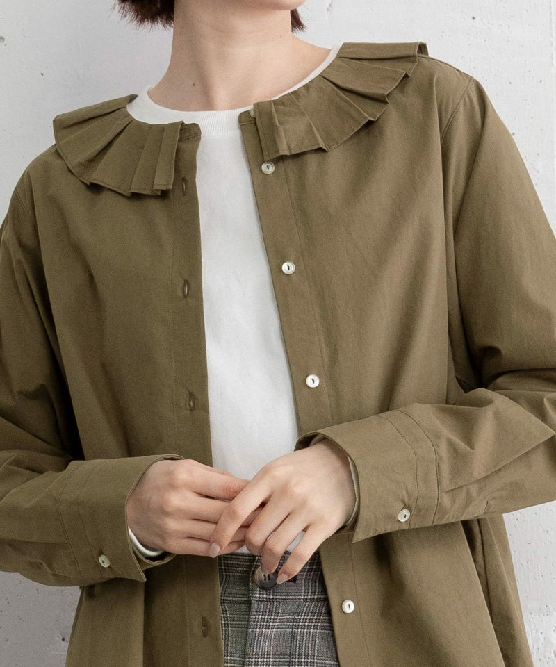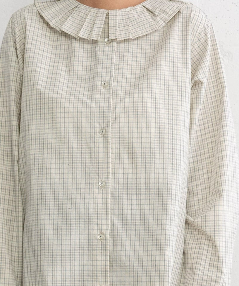 メンズライクなオーバーサイズをベースに、程よい甘さのプリーツ衿をのせたシャツ。ニットやスウェットにも重ねやすく、通年着られるコットン素材を使用しました。腰まわりが隠れる長さの丸みのあるラウンドヘム仕様で、トップスの裾からちらりと出すのもオススメ。無地のオフホワイトとダークブラウン、チェックの3色展開です。