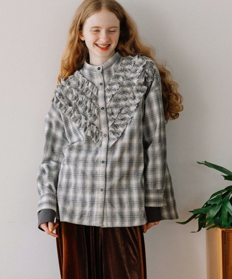 V字にあしらったフリルデザインが印象的な、甘さと辛さを掛け合わせた主役級シャツ。やわらかい起毛感のあるチェック生地で仕立てました。ゆったりとしたオーバーサイズで、羽織ってもインしてもバランスが良いです◎デニム合わせでカジュアルに、スカート合わせで甘辛ミックスな着こなしもおすすめ。