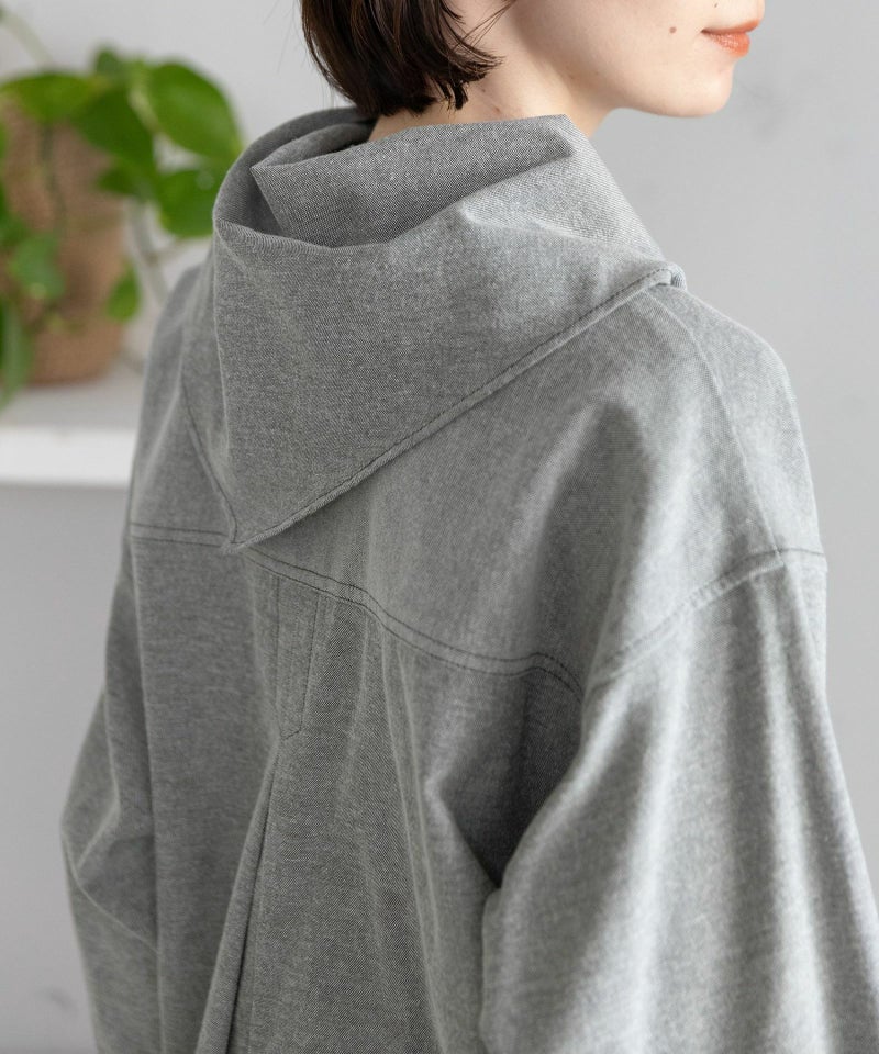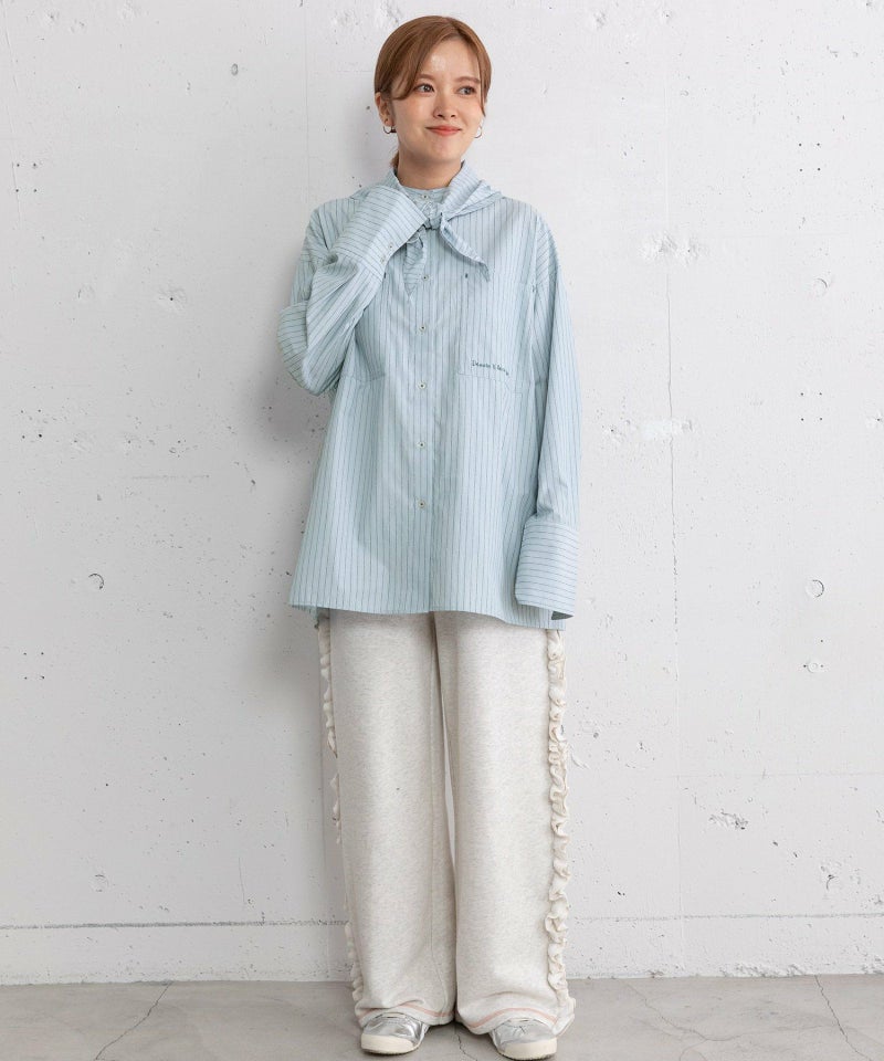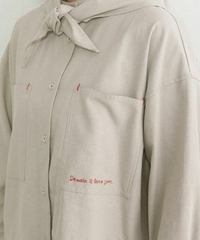 シャツと同素材のスカーフがセットになったアイテム。スカーフは首に巻いたり、ヘアアクセとしてお使いいただいたり、様々なアレンジが楽しめます。シャツは両胸のポケットとロングカフスが特徴的。胸ポケットの文字刺繍もアクセント。シンプルなオーバーサイズのボックスシルエットに、すっきりとしたバンドカラーでハンサムな雰囲気に仕立てました。バックスタイルは、ボックスタックが入った動きのある仕様。衿を抜いたり、羽織にしたりと1枚で様々な着こなしを楽しめるアイテムです。