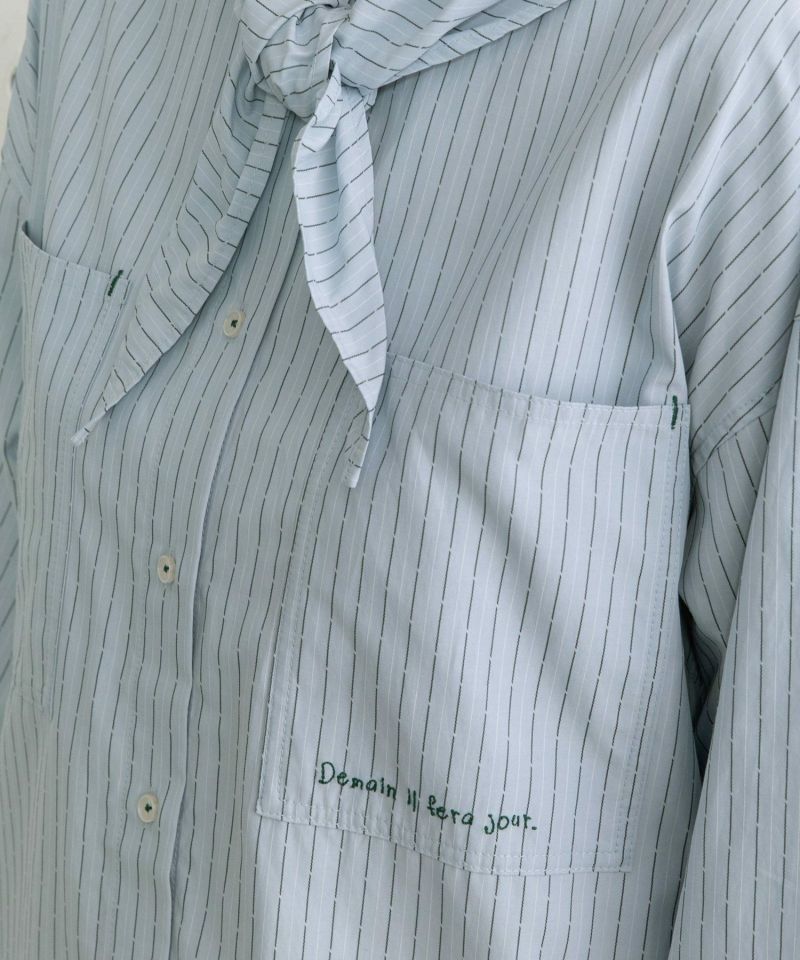 シャツと同素材のスカーフがセットになったアイテム。スカーフは首に巻いたり、ヘアアクセとしてお使いいただいたり、様々なアレンジが楽しめます。シャツは両胸のポケットとロングカフスが特徴的。胸ポケットの文字刺繍もアクセント。シンプルなオーバーサイズのボックスシルエットに、すっきりとしたバンドカラーでハンサムな雰囲気に仕立てました。バックスタイルは、ボックスタックが入った動きのある仕様。衿を抜いたり、羽織にしたりと1枚で様々な着こなしを楽しめるアイテムです。