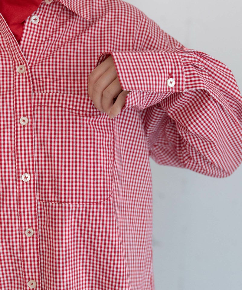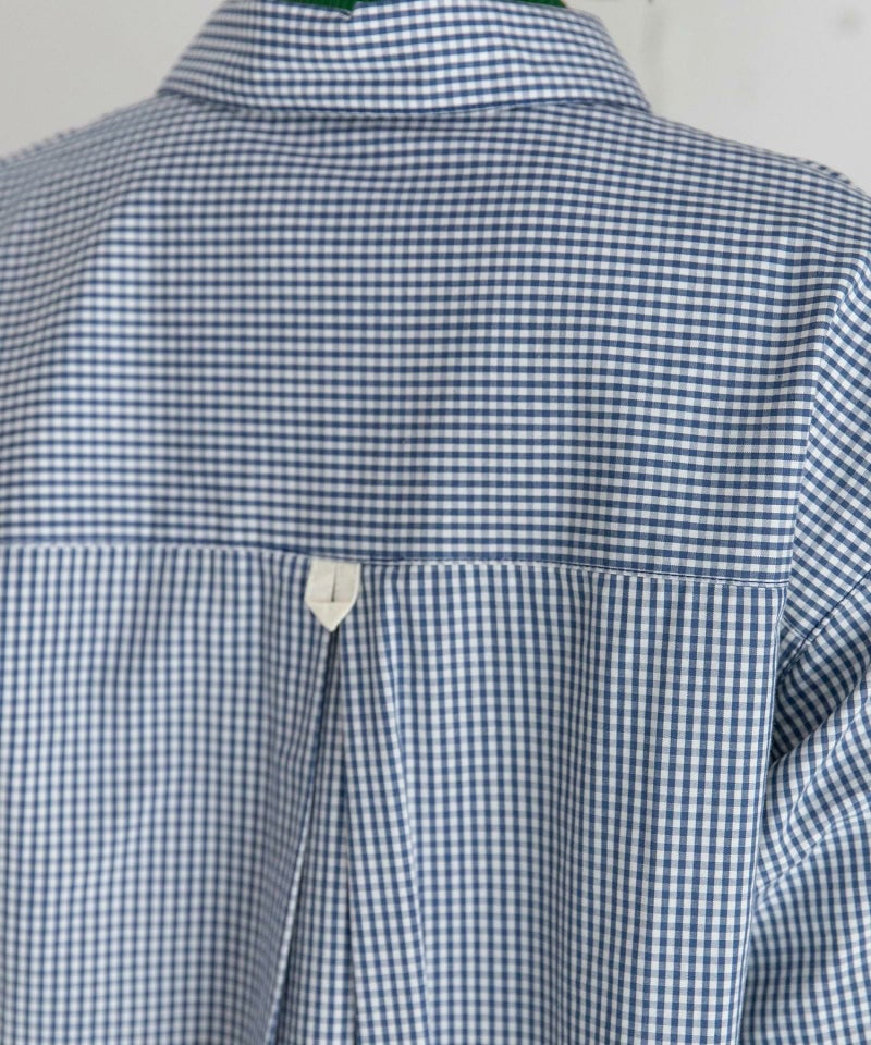 軽やかでサラッとした肌触りのコットン素材を使用したギンガムチェックのシャツ。オーバーサイズのシルエットに前立てにポケットをくっつけたデザインです。寒い時期にはニットのインナーとして、春から夏にかけては一枚で活躍してくれます。前を開けて羽織としても使えます。バックスタイルはヨークに配色のタブをつけてアクセントに。