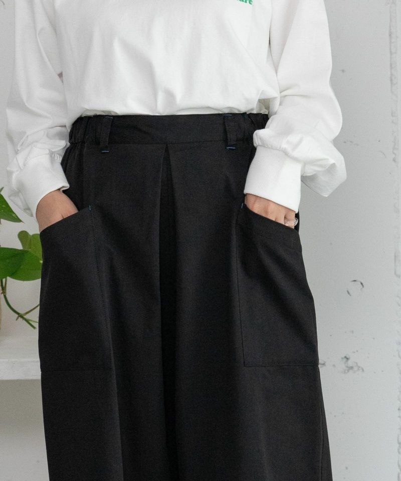 イージーシルエットが魅力のワイドパンツ。フロントのタックと両サイドの大きなポケットがポイントです。前中心のベルトはすっきりと、脇から後身にはゴムを通しています。ボリュームのあるボトムなので、トップスはタイトにするとバランスを取りやすいです。あえてビックサイズのカットソーと合わせてリラクシーな雰囲気を出すのもおすすめ。ブラックドットをプリントしたワンウォッシュデニムとコットンツイルのブラック無地の展開です。