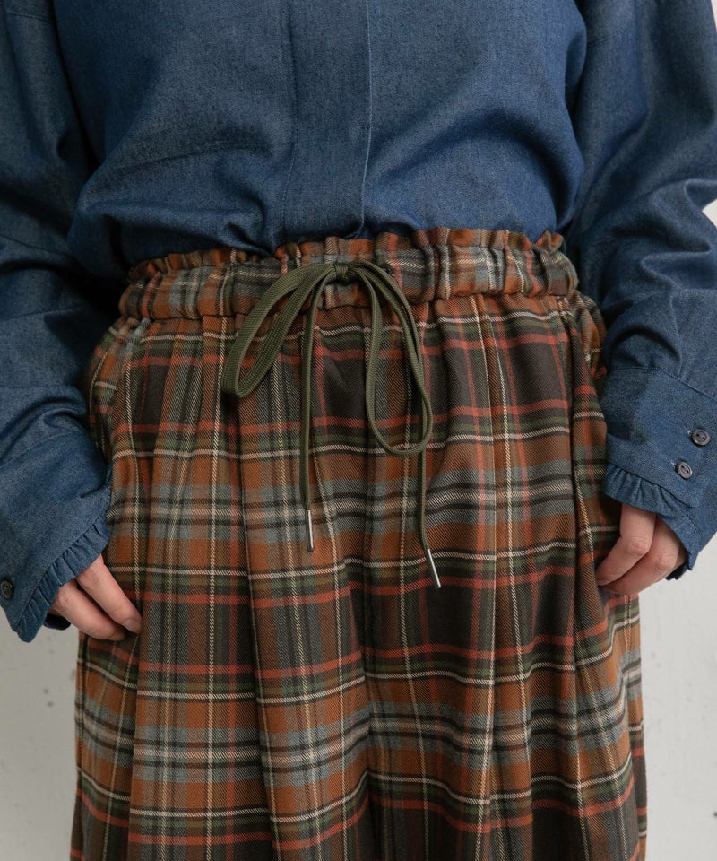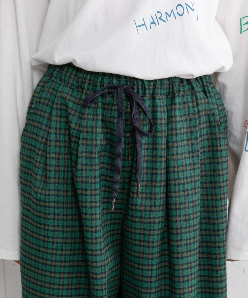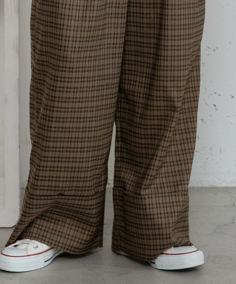 ロールアップしたような裾のデザインが目を引くチェックパンツ。ワイドなストレートなシルエット。カジュアルながらも大人っぽく決まるアイテムです。程よい厚みと落ち感のある素材で、秋冬のスタイリングにぴったり。ロンTやトレーナーとのラフなコーデもサマになる1本。ウエストゴム仕様でラクな履き心地。両サイドポケット付き。