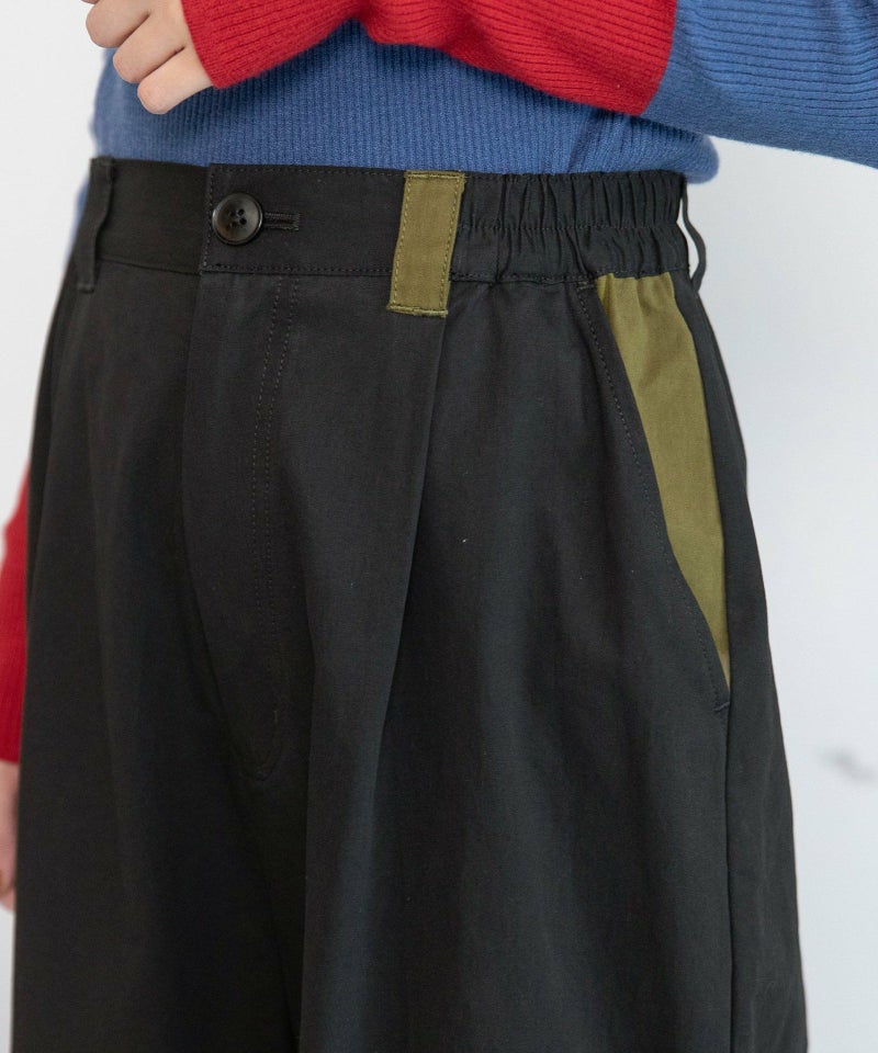 少し低い位置につけたサイドのカーゴポケットで遊び心をプラスしたミリタリーパンツ。程よい厚みのコットンツイル仕立て。裾には紐を通し、シルエットの調節ができるようにしました。ベルトループを太めの巾にしているので、ベルトを使ってトップスインスタイルも楽しめます。バックゴムの仕様でリラクシーな履き心地の大人のカジュアルスタイルにぴったりのアイテムです。ベルトループやポケットの配色もさりげないアクセントに。
