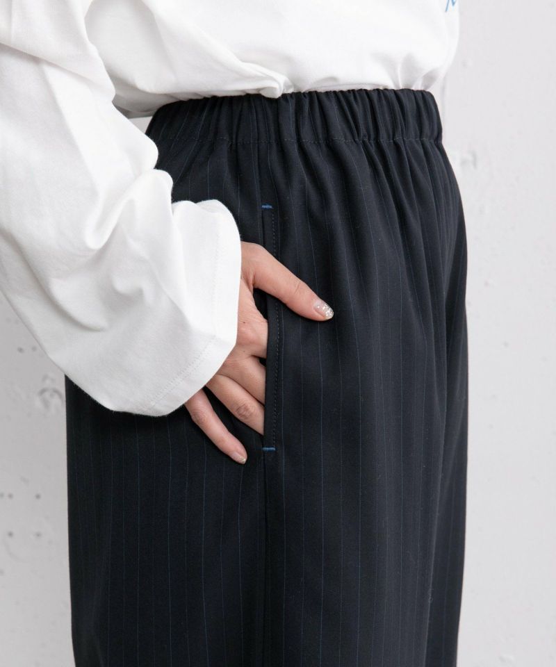 きれいめ素材で仕立てたPOU DOU DOUらしいスカラップディテールのパンツ。ニットや冬素材のトップス合わせも野暮ったくなりません。ウエストはぐるりゴムの仕様で楽な履き心地です。ひもでサイズ感の調整も可能。両サイドポケット付き。