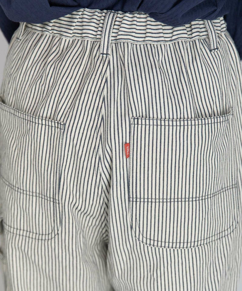 ルーズなシルエットとメンズライクな雰囲気が魅力のペインターパンツ。深めの股上とゆとりあるストレートシルエットが今っぽいデザイン。スケールポケットやハンマーループなど本格的なディテールをのせました。POUDOUDOUロゴ入りのオリジナルのネオバボタンを使用しています。後ろウエストはゴム使用で伸縮性あり。ダークブラウンはコットンツイル生地、デニムとヒッコリーのアソート素材で仕立てました。ダークブラウンとヒッコリーはネイビーのステッチカラー、デニムは古着ライクにブルーのステッチカラーにしています。両サイドポケットつき。