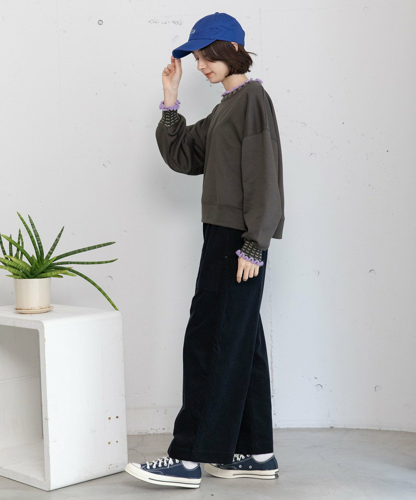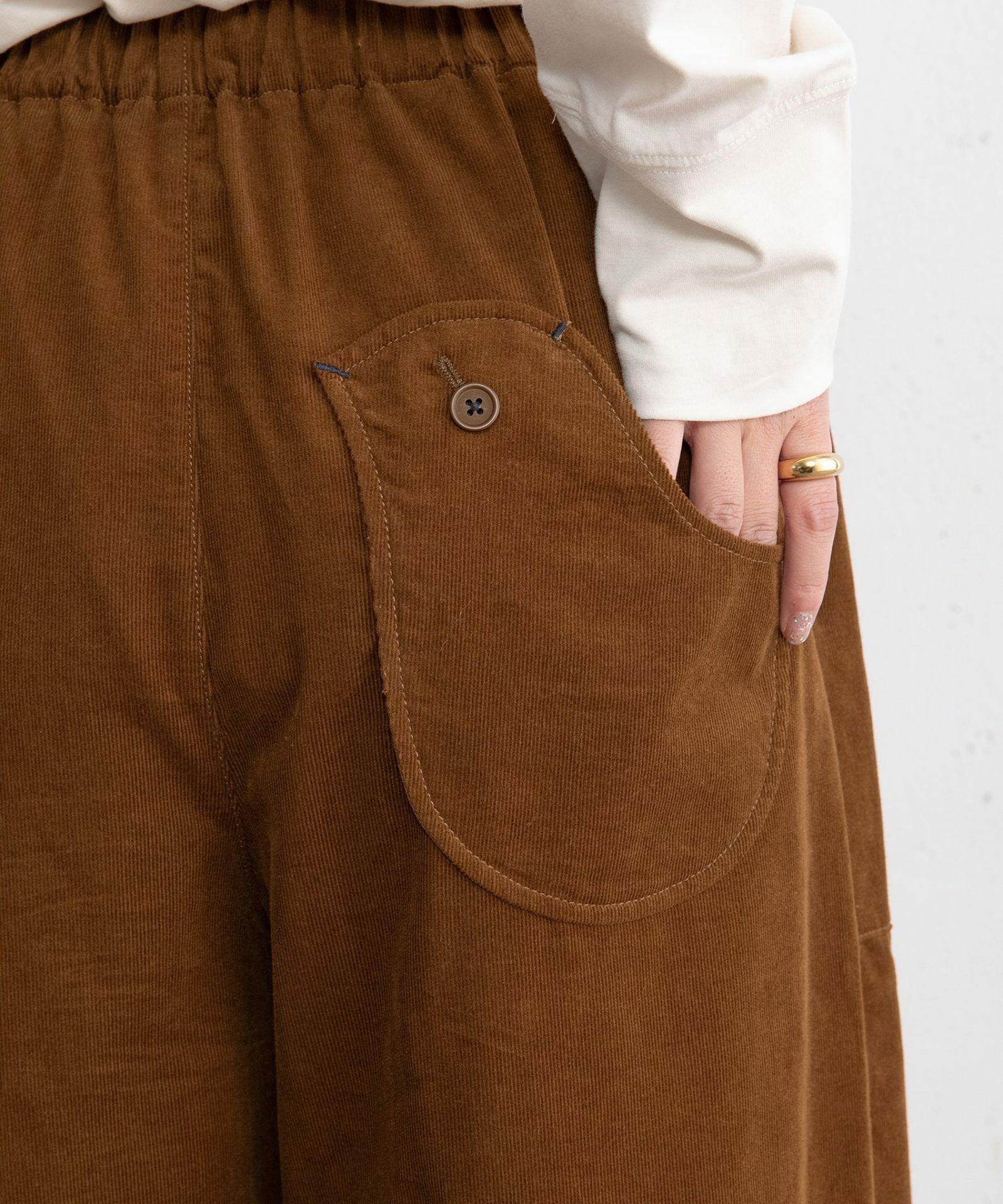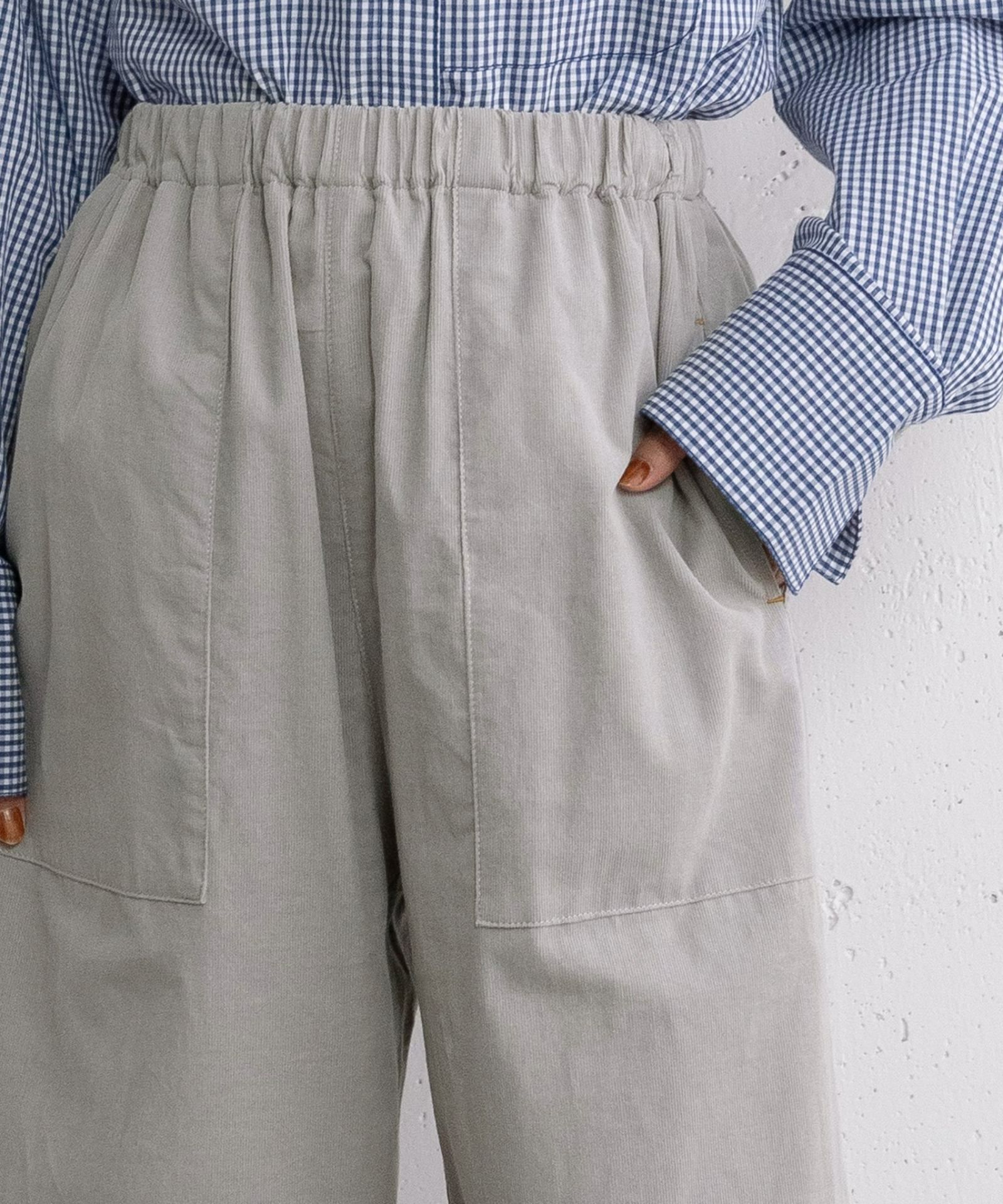 POU DOU DOU定番人気のとりポケットパンツにコーデュロイ素材が登場です。畝が細く薄手で柔らかいシャツコール素材を使用しています。細やかな起毛感があるので寒い春先まで着用していただけます。セミワイドのストレートシルエットで、着回しの利くデザイン。ウエストはゴム仕様、内紐でサイズ感の調節ができます。さりげないとり型のポケットがポイント。両サイドにポケット付き。
