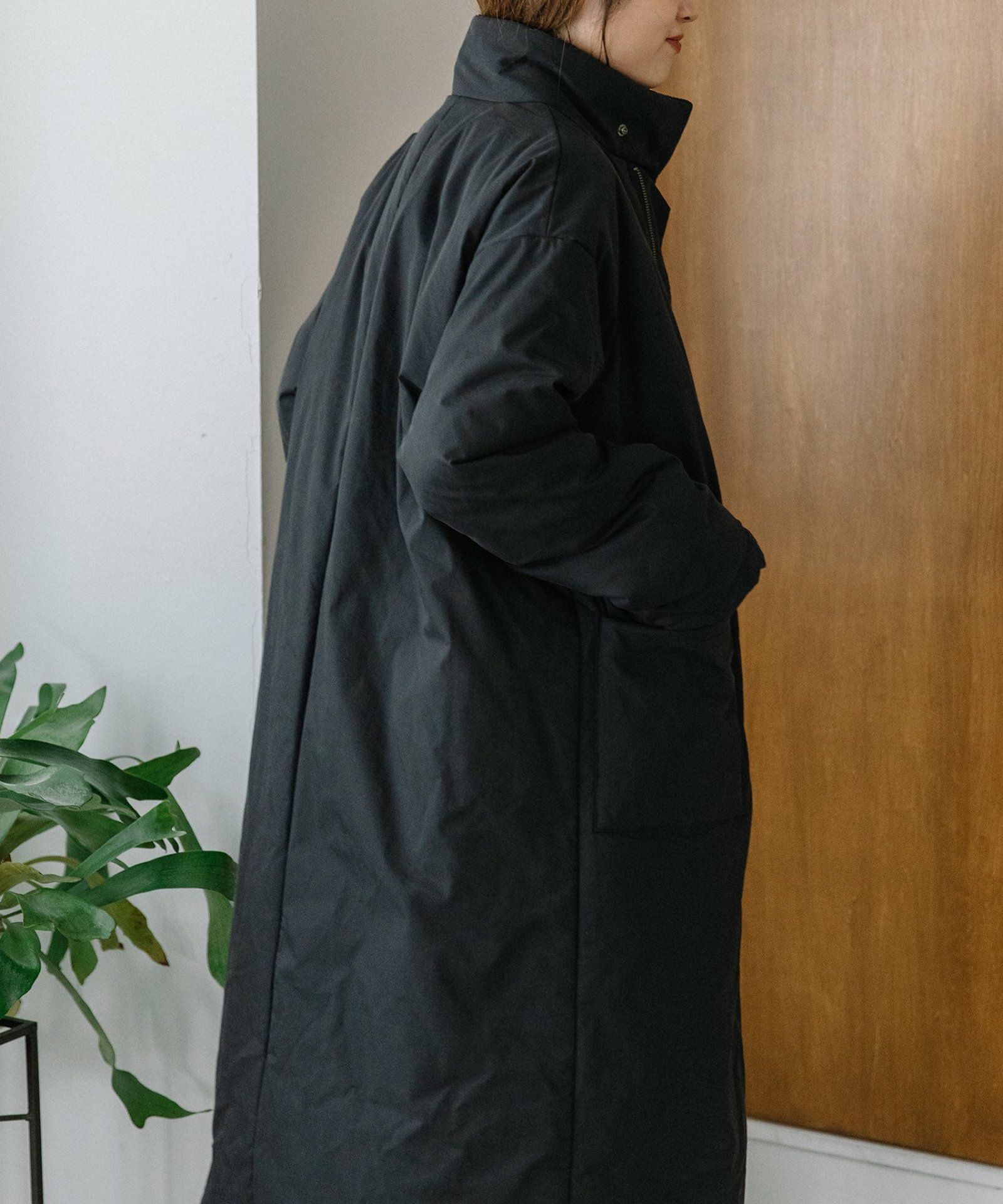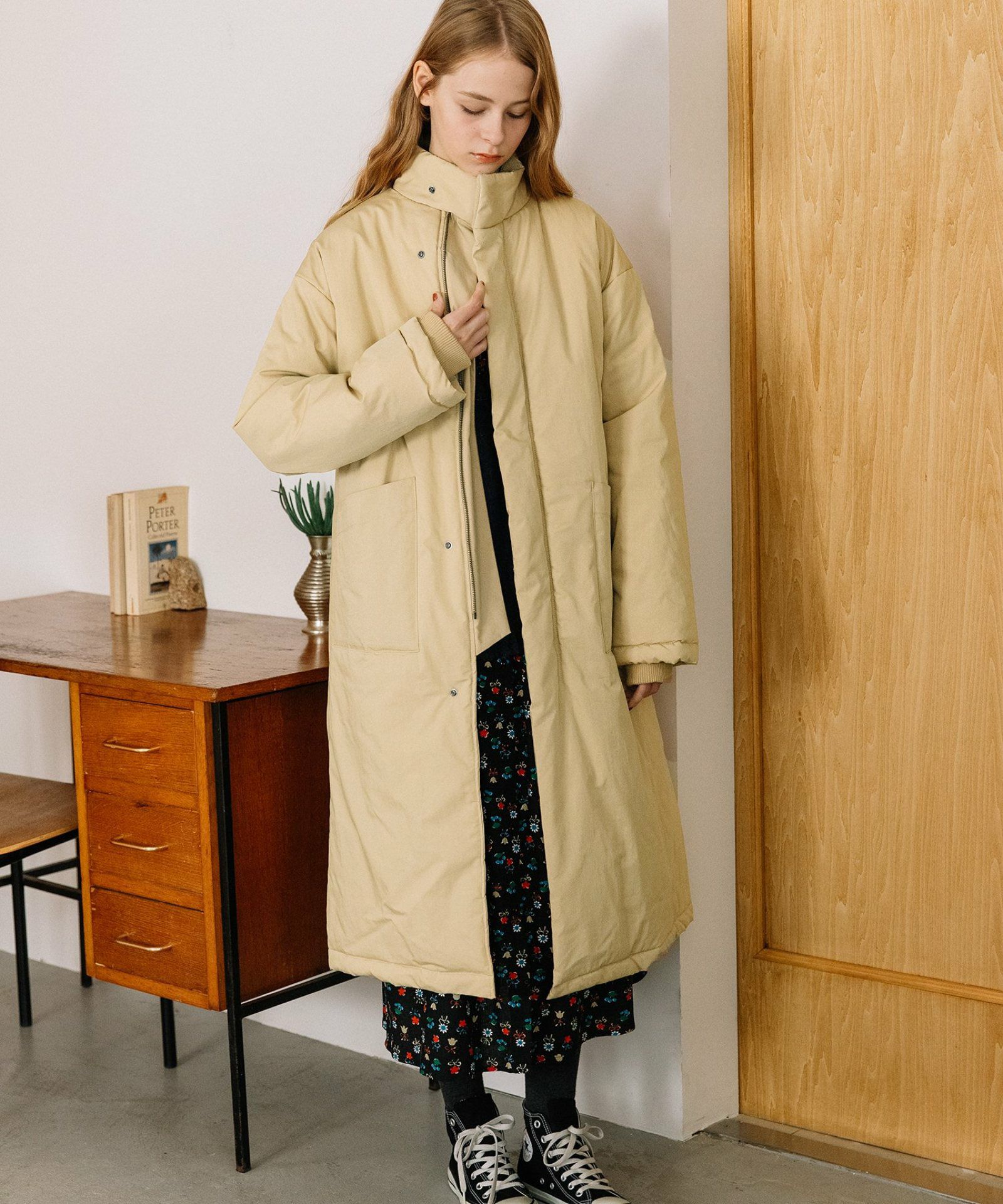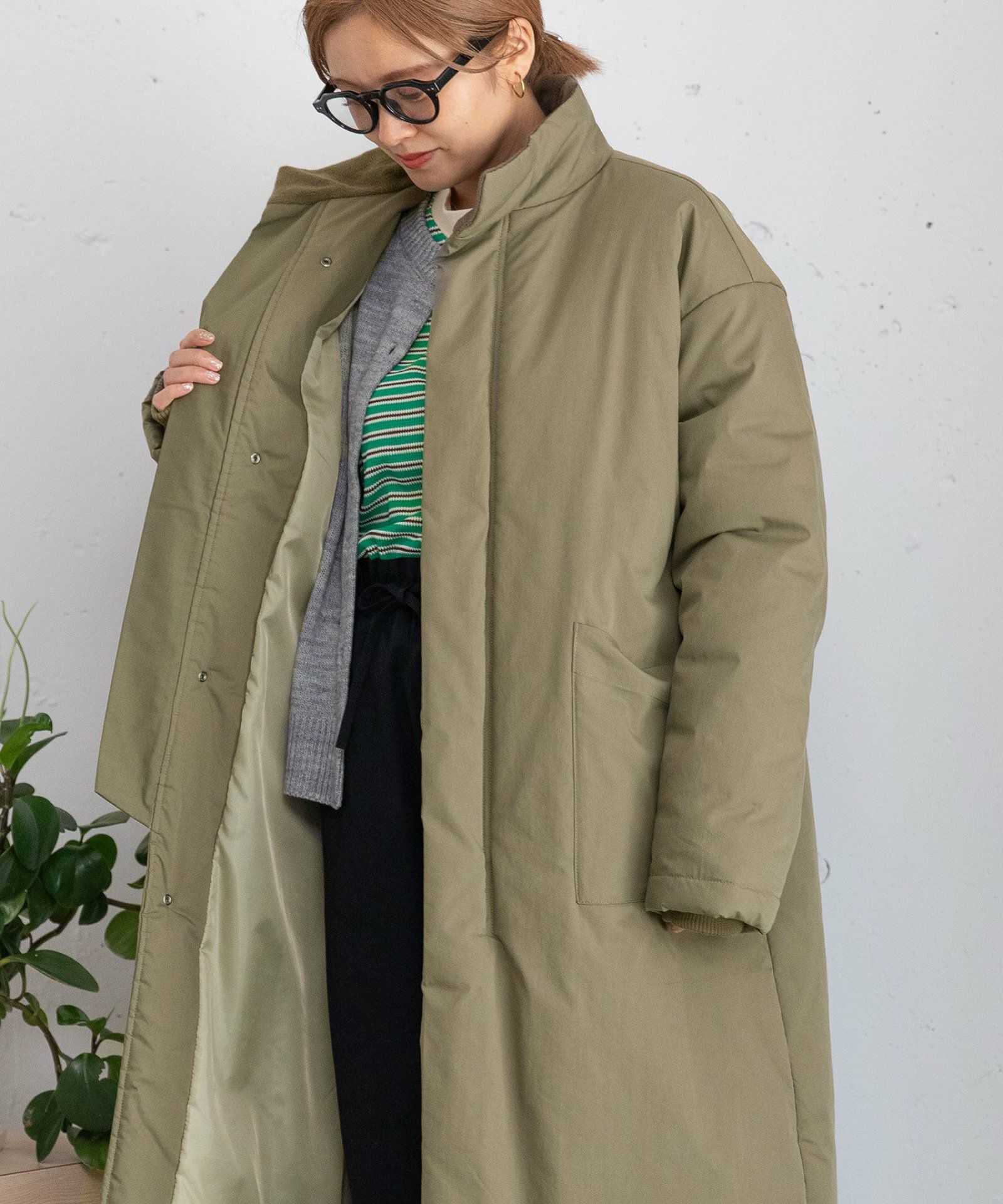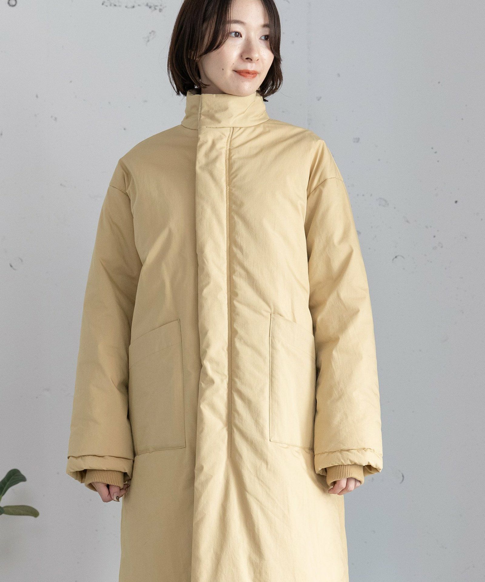 首元を包むハイネックの衿元が暖かな印象のパデット(中綿)コート。衿の裏側にフリース生地を使用しているので肌あたりも優しいです。肩を少し落としたドロップショルダーとすとんと落ちる裾までのシルエットがキレイ。身巾をゆったり取っているので、ニットなども着込みやすいです。袖口をリブにしているので防寒性もあります。コットン見えするので春先の寒い時期にも使いやすいです。