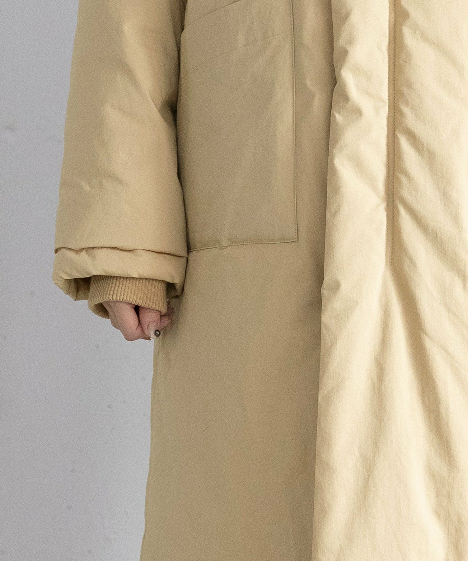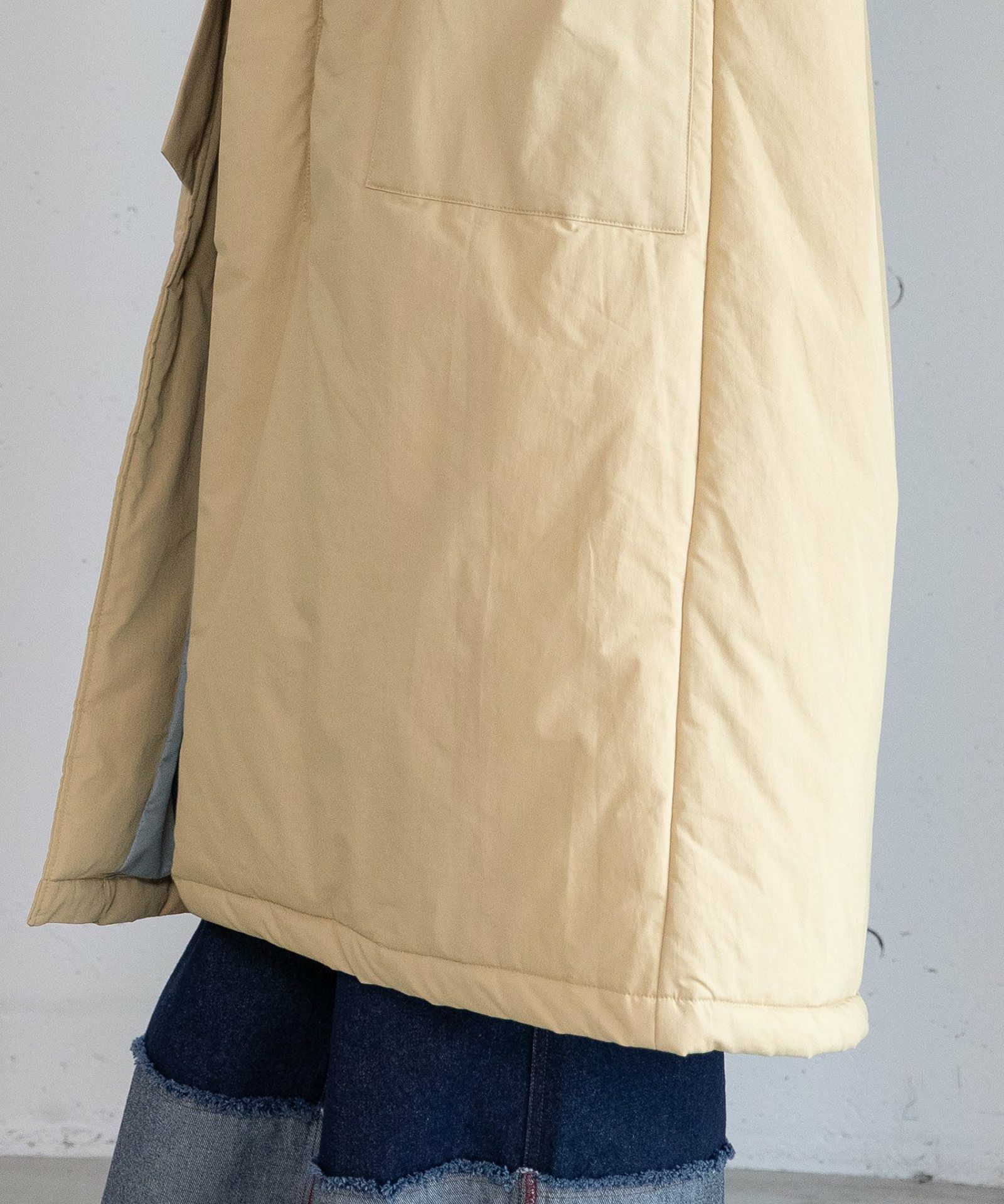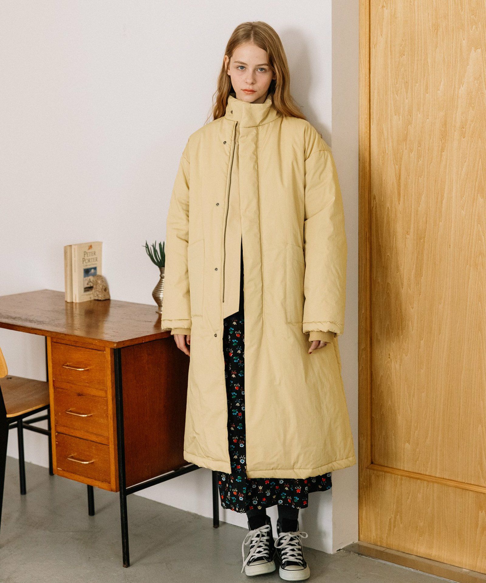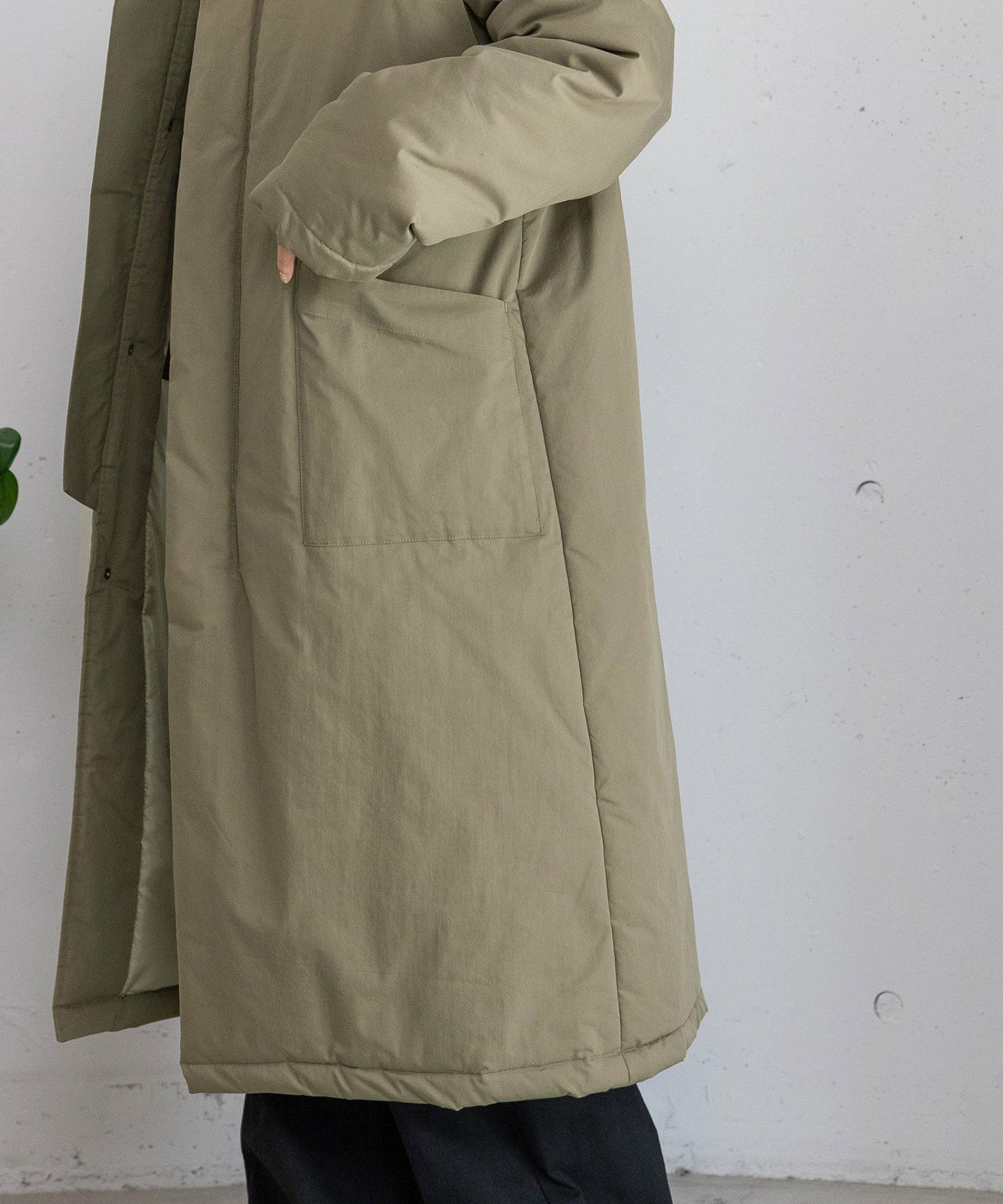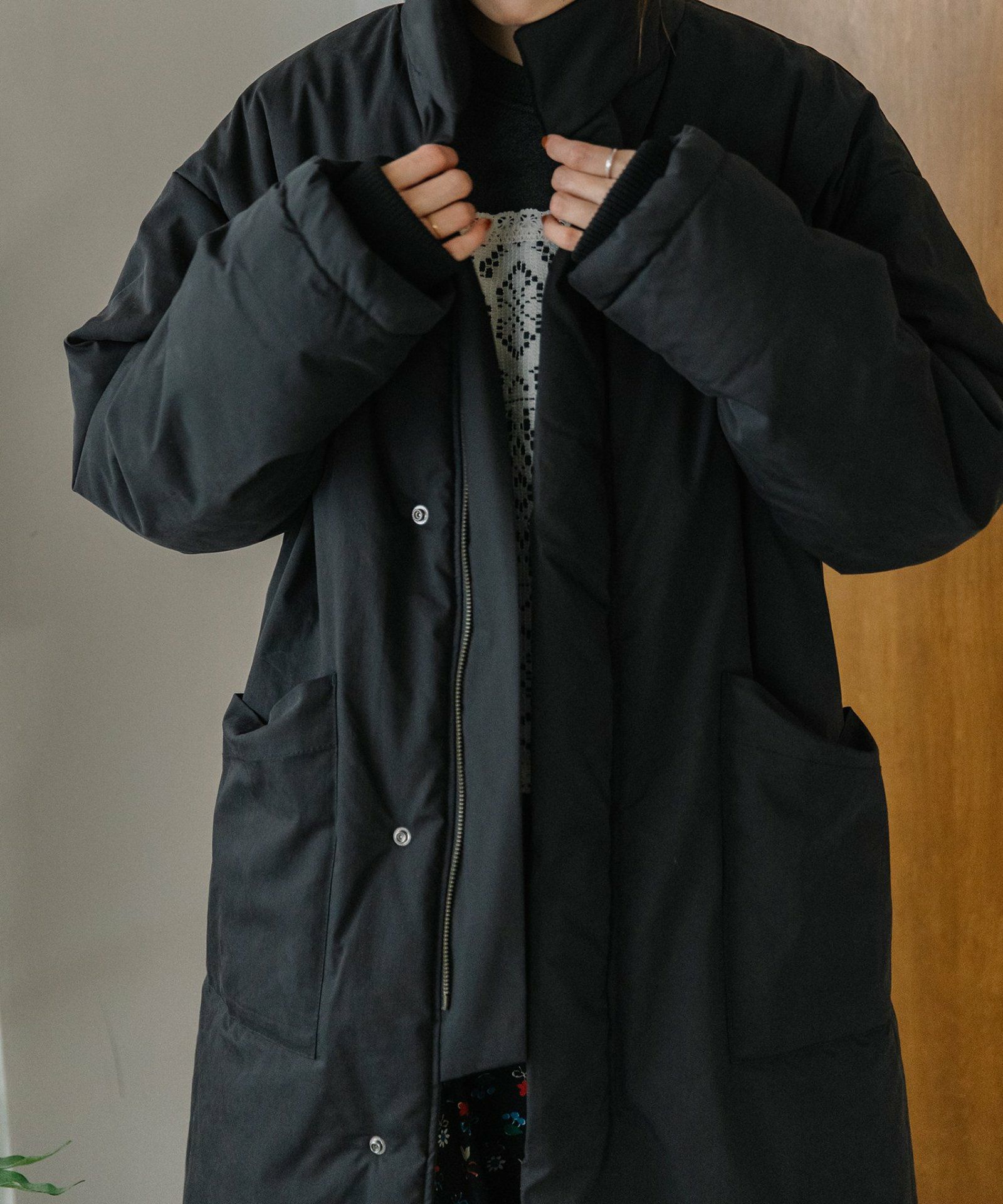 首元を包むハイネックの衿元が暖かな印象のパデット(中綿)コート。衿の裏側にフリース生地を使用しているので肌あたりも優しいです。肩を少し落としたドロップショルダーとすとんと落ちる裾までのシルエットがキレイ。身巾をゆったり取っているので、ニットなども着込みやすいです。袖口をリブにしているので防寒性もあります。コットン見えするので春先の寒い時期にも使いやすいです。