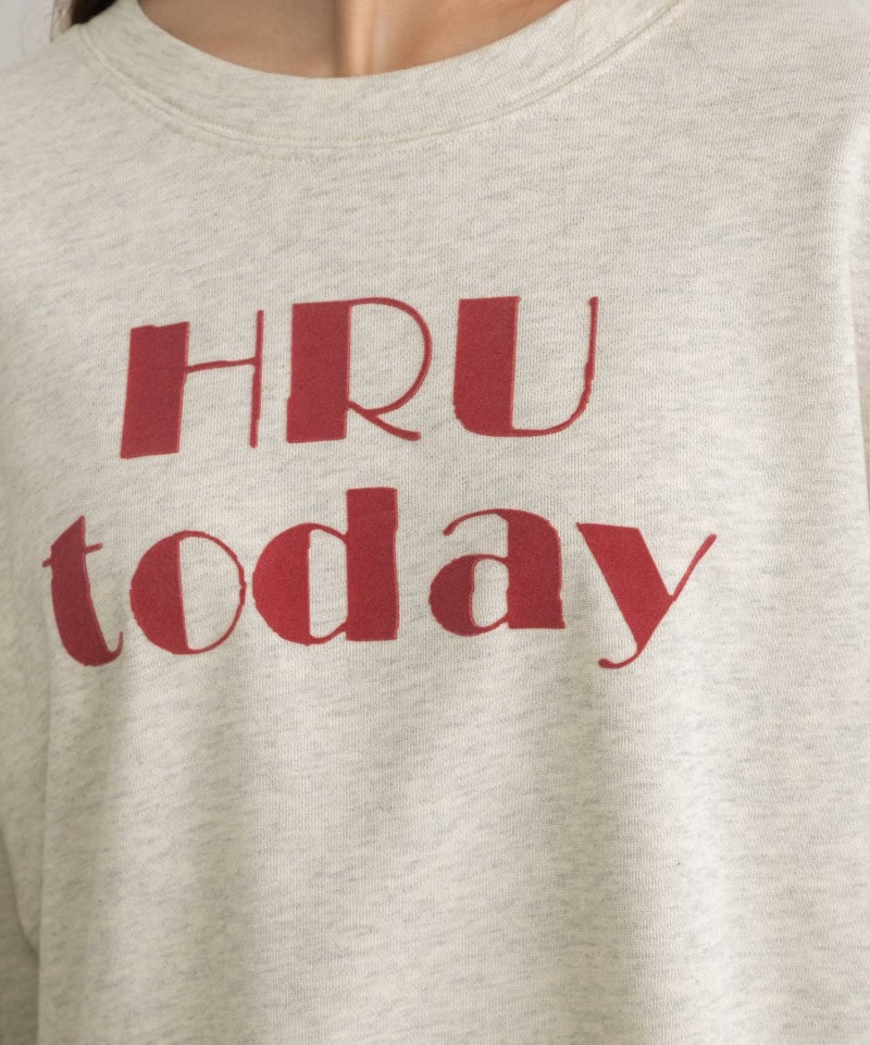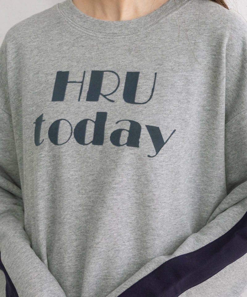 「HRU(How are you?)」とカジュアルな挨拶をプリントした、遊び心のあるデザインプルオーバー。ポリエステル混の裏毛素材を使用し、軽やかで重たくなりすぎない着心地です。ロゴは少しかすれた表情のフロッキープリント、袖の配色ラインがアクセントとなり、1枚で着映えします。すとんとしたストレートな袖は、袖口を折り返しての着用もおすすめ。裾のラウンドテールが、こなれた印象をプラスします。
