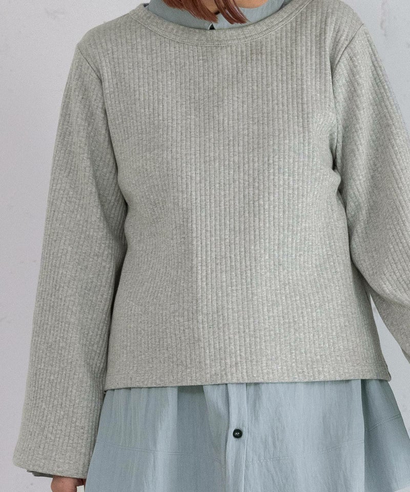 古着のミリタリーインナーのような中肉リブを使用したトップス。袖のフレアデザインがさりげないアクセントになり、1枚着としても着映えするアイテムです。長めのインナーを合わせたレイヤードスタイルもおすすめ。身頃はすっきりとしたシルエットに仕上げているため、ボリューム感のあるボトムスとも好相性です。