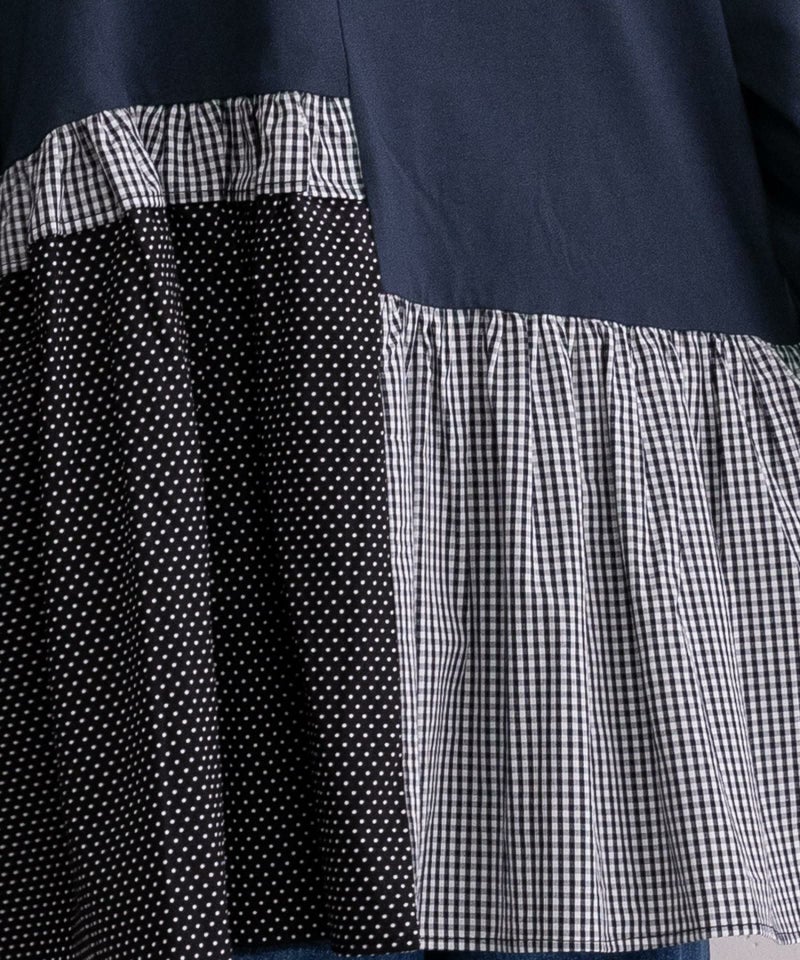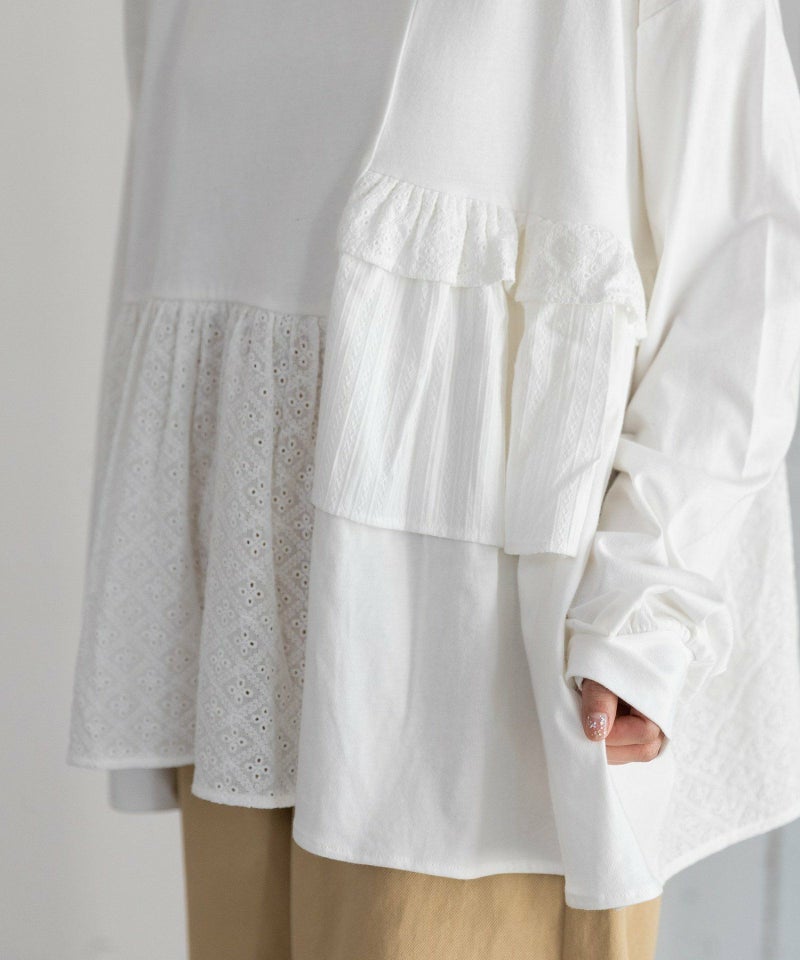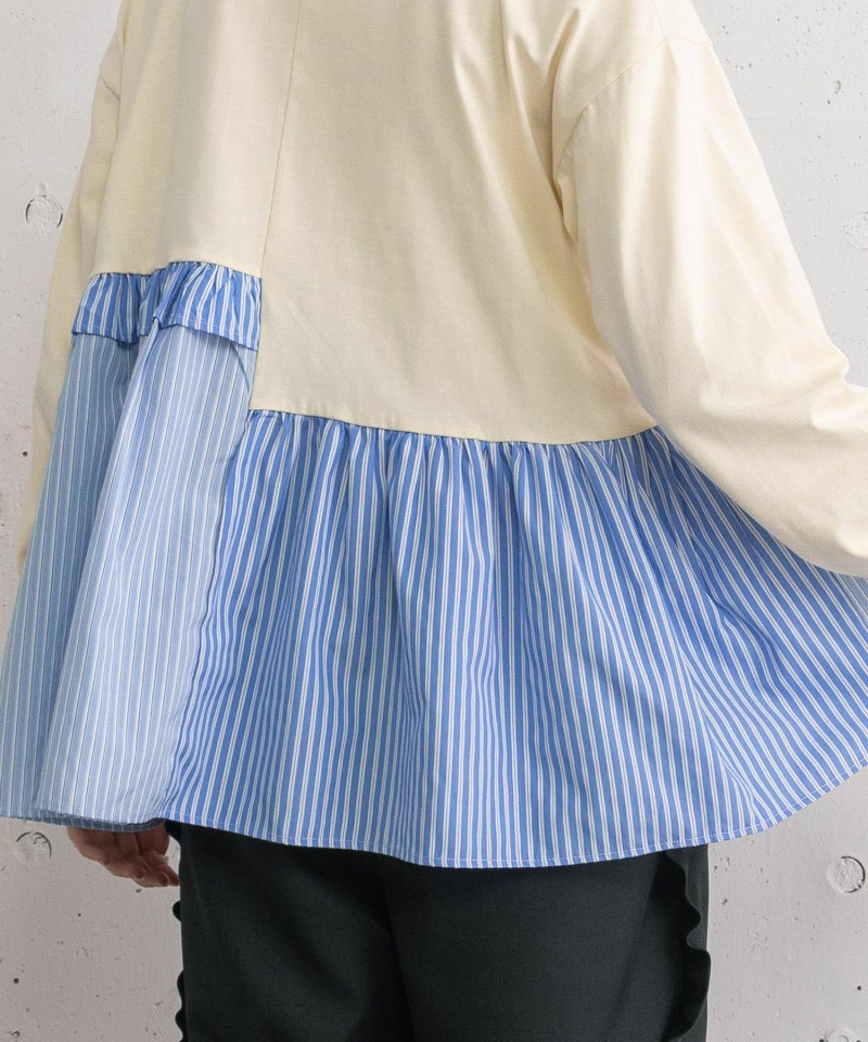 カットソー素材をベースに、布帛生地をアソートで組み合わせたデザイントップス。イレギュラーな切り替えに、たっぷりとギャザーを施したヘムが動きのある印象を与えます。伸縮性のある素材で着心地が良く、ブラウスのような雰囲気で着られるのもポイント。1枚でサマになるのはもちろん、レイヤードして裾をちらっと見せる着こなしもおすすめです。ヒップにかかる着丈で、安心感のある一着に仕上げました。