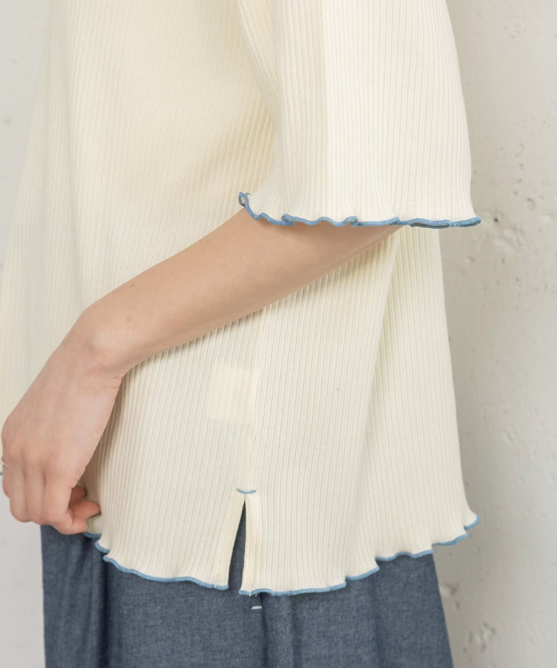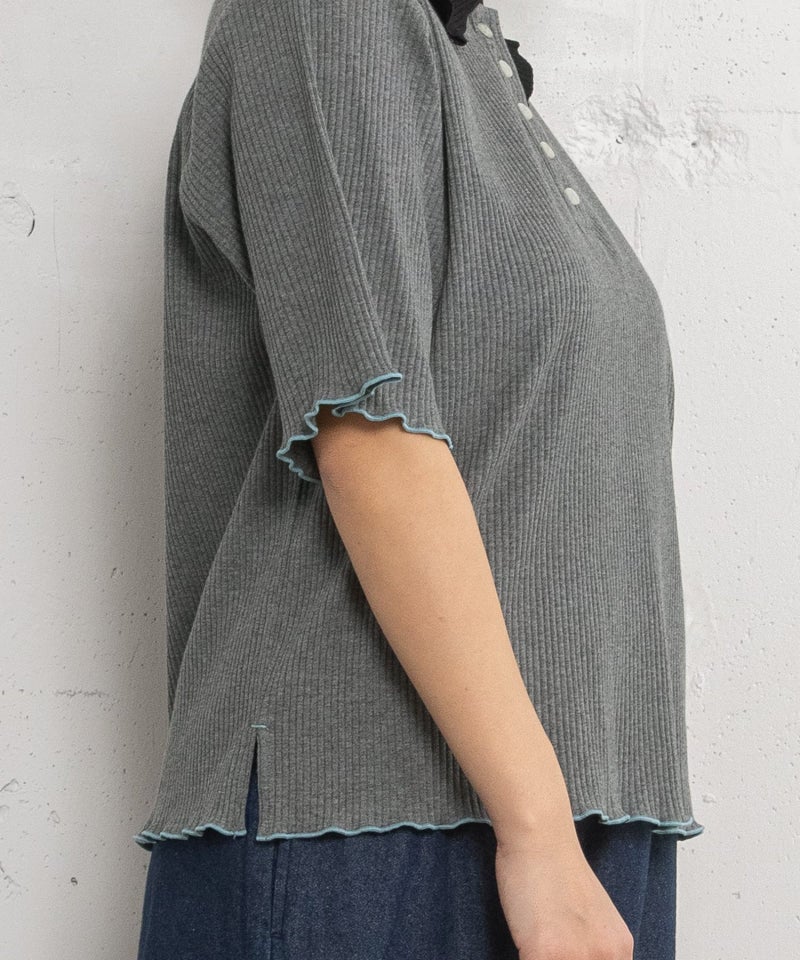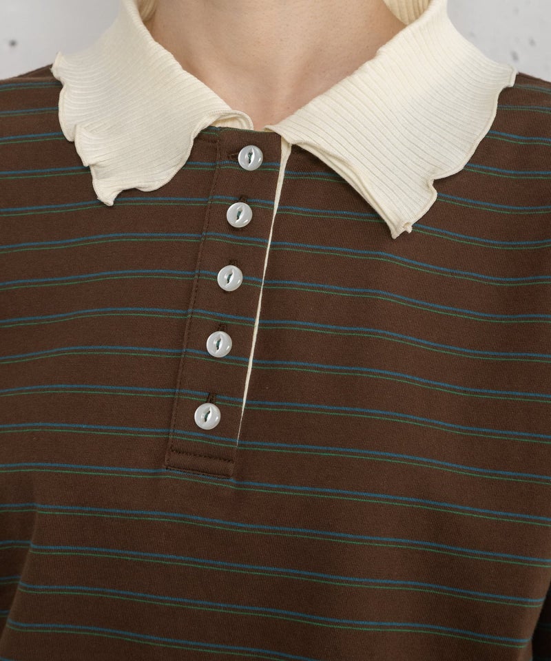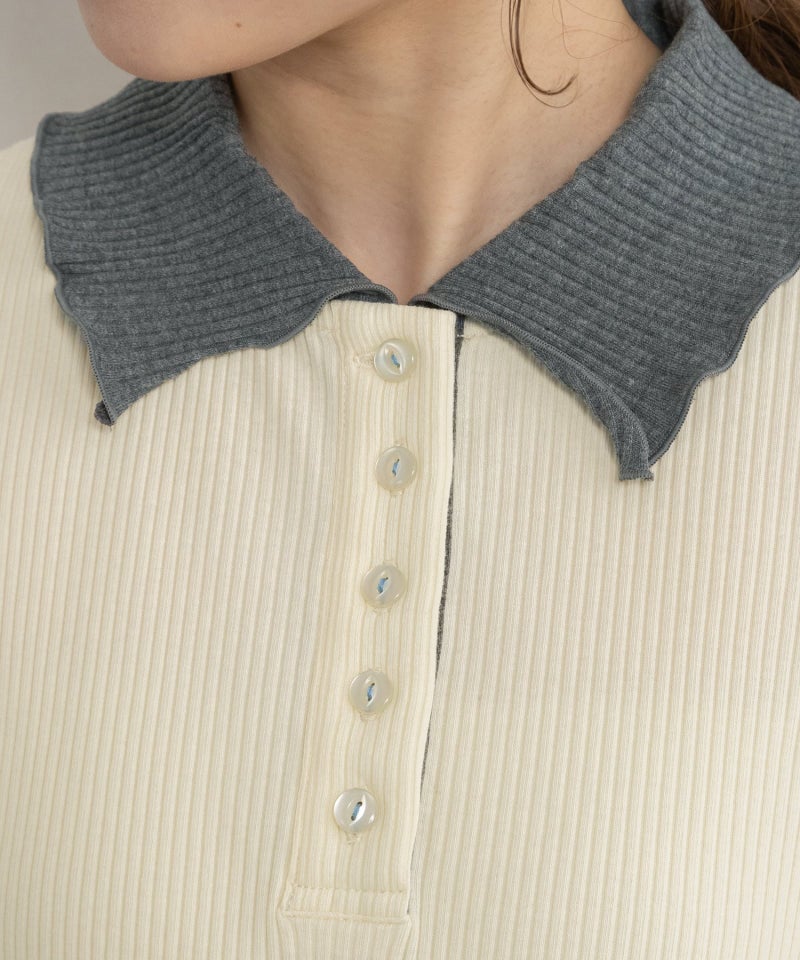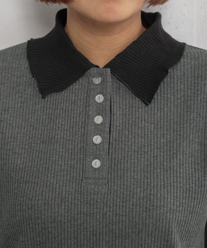 配色の衿がポイントのプルオーバートップス。並んだボタン使いもアクセント。衿周り、袖口、裾はメロー始末で軽く仕上げています。無地は柔らかい肌触りで伸縮性のあるリブ素材、ボーダーはフライス生地を使用しています。