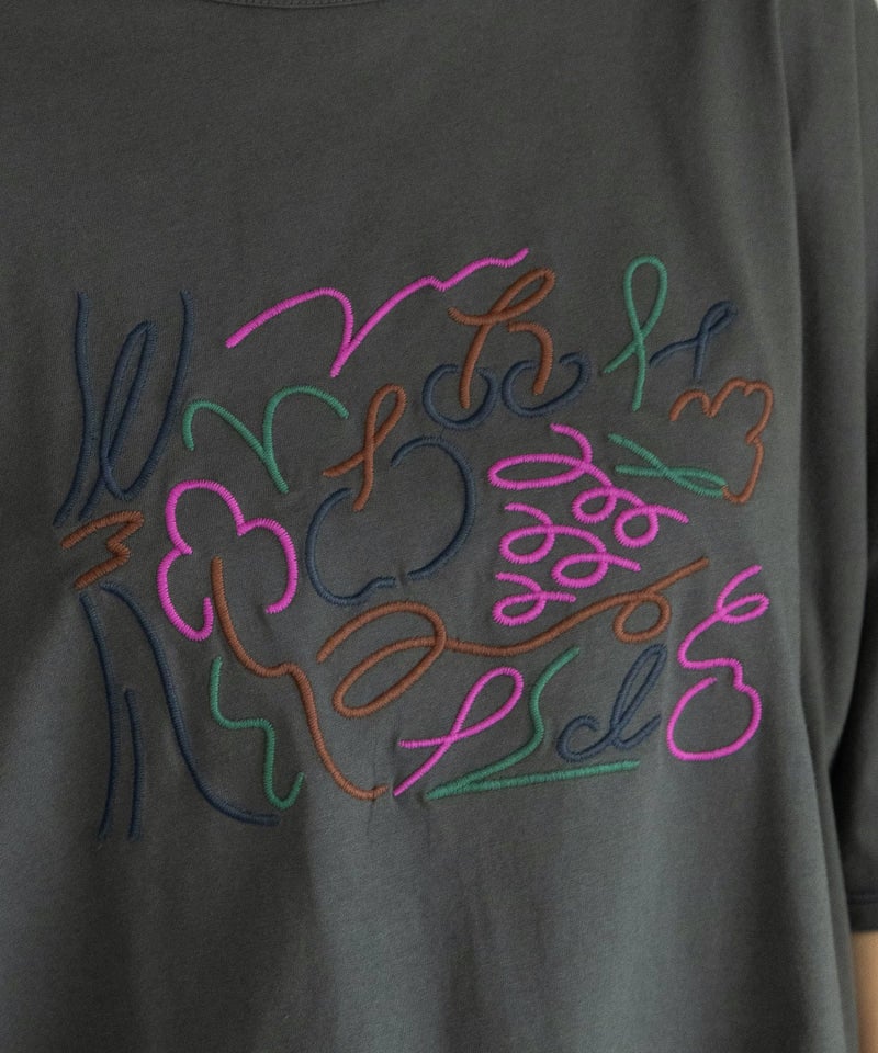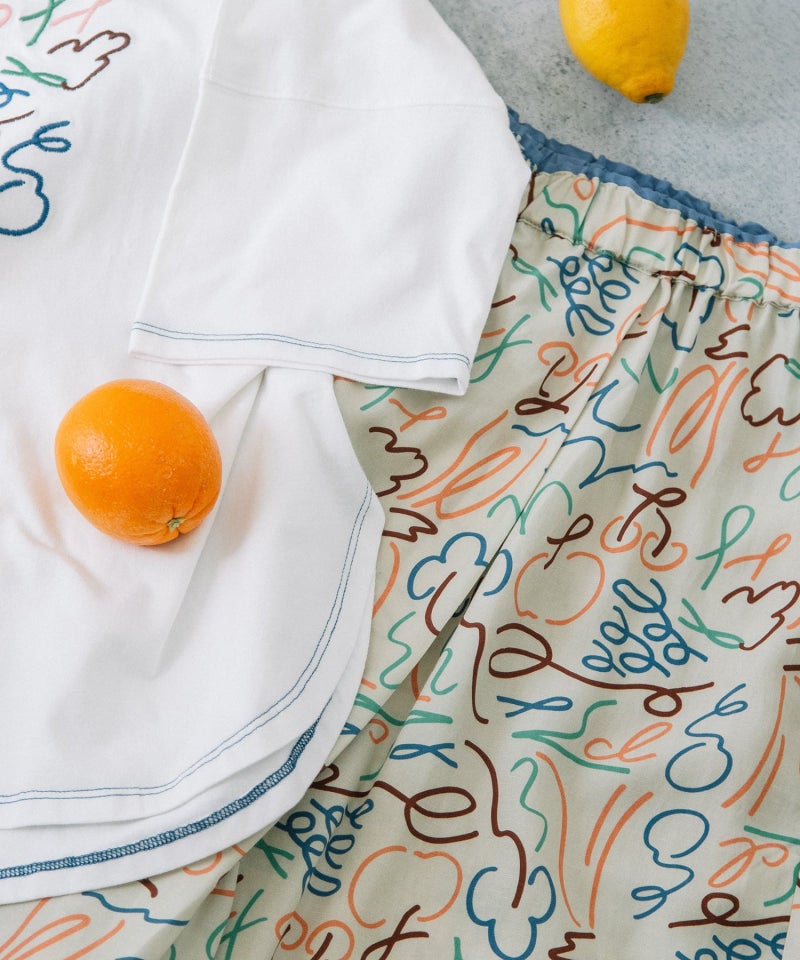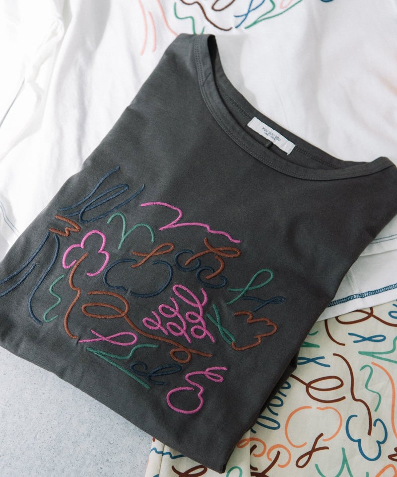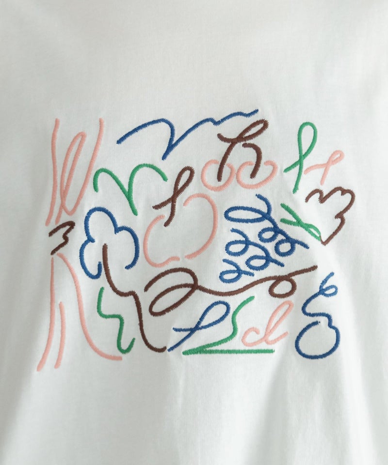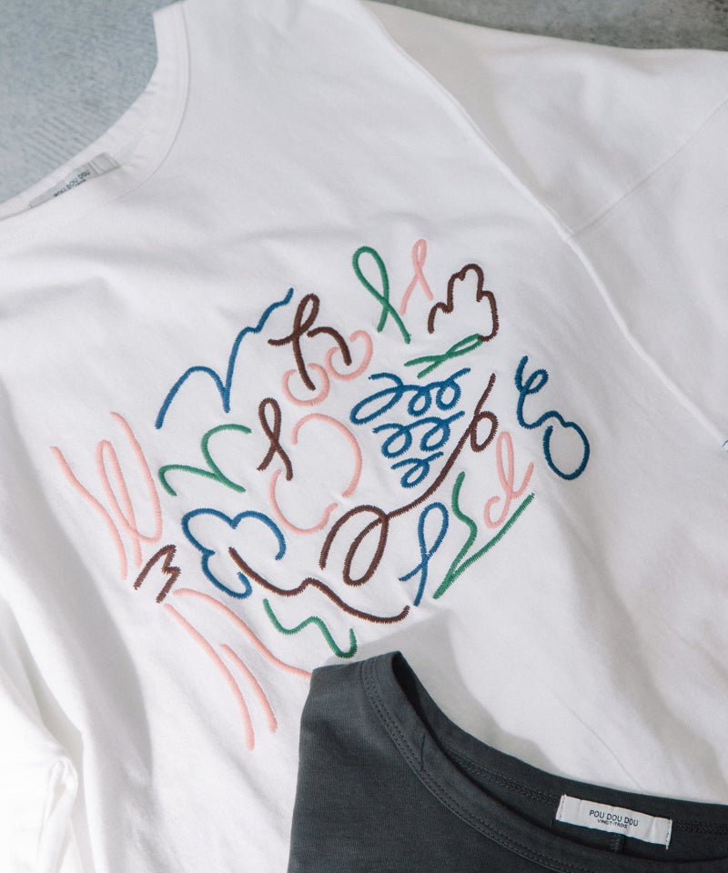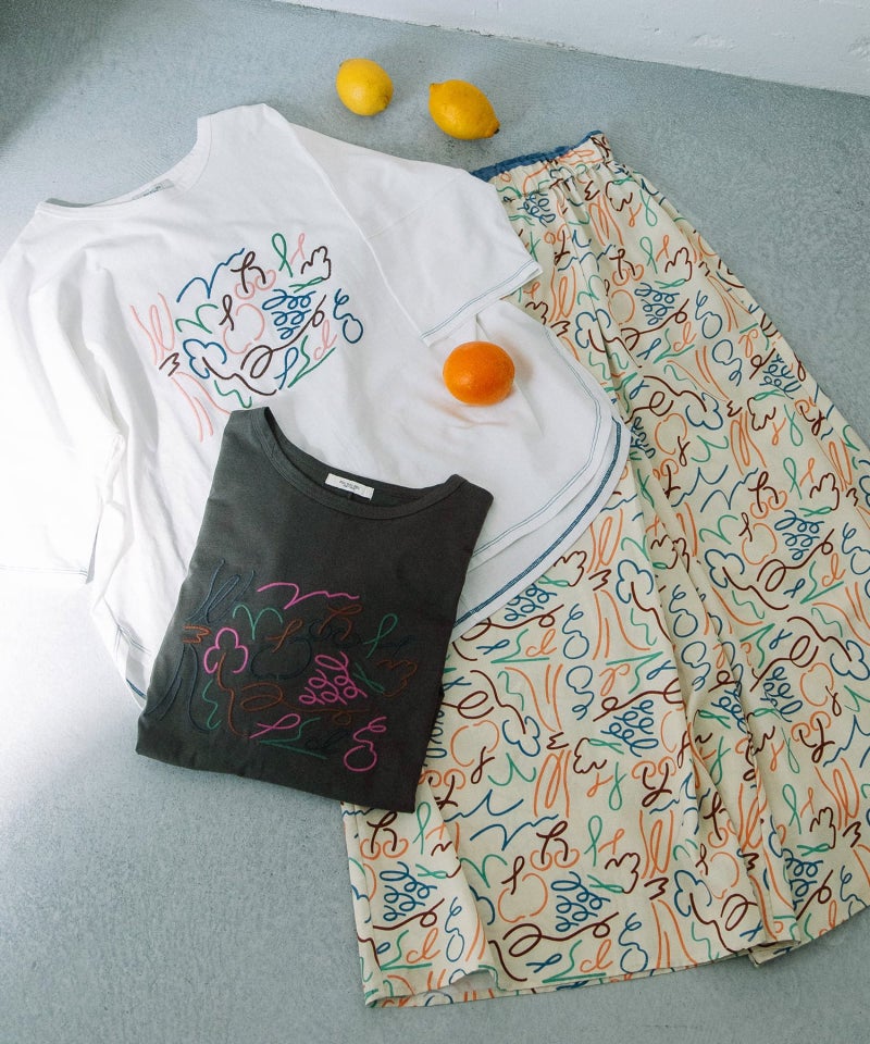 フロントの刺繍デザインがポイントのトップス。くるくるとした躍動感のあるイラストを、手描きタッチの素朴なミシン刺繍で表現しました。さくらんぼやブドウのモチーフ、ブランド名の「p」と「d」の文字をミックスしています。ゆったりとした身頃とすっきり見えする袖のコントラストに、ラウンドした裾ラインが抜け感のあるデザインです。
