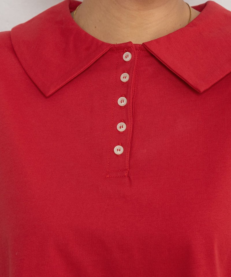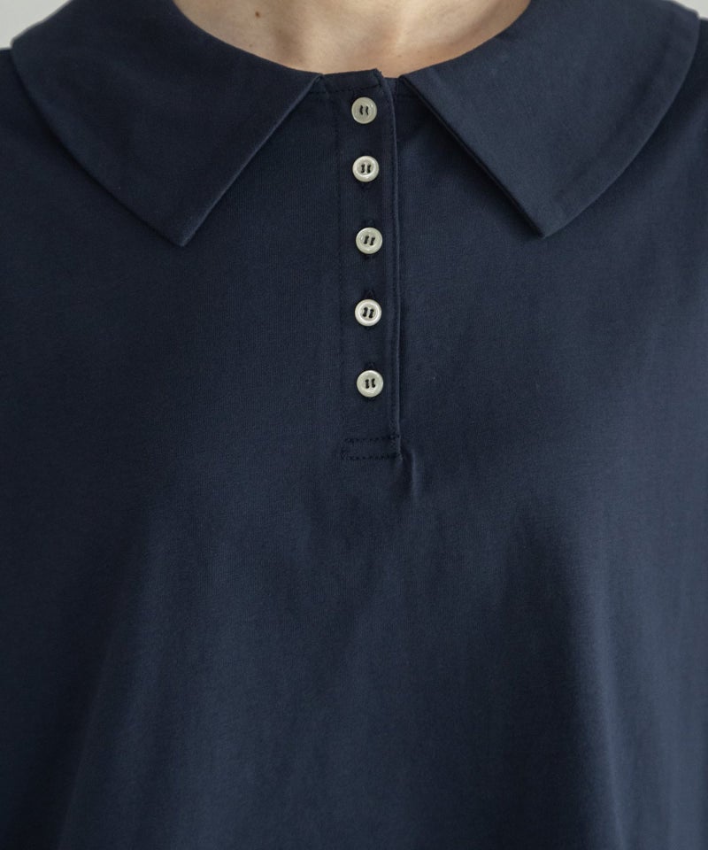 人気のデザインが今年も登場。ポロシャツをTシャツ感覚でラフに着られるようアレンジしたトップスです。身幅をたっぷりと取り、きちんと感を残しつつリラックスした着心地に仕上げました。ぎゅっと並んだボタンがアクセントに。いくつかボタンを開けて抜け感のある着こなしもおすすめです。
