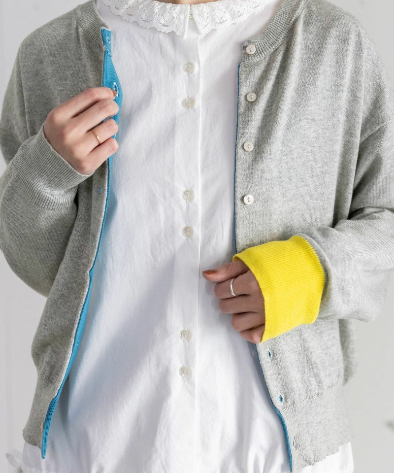 目の詰まった、きれいな表面感のハイゲージカーディガン。フロントはあえて上下半分ずつ配置したボタンとボタンホールで、でこぼこ感のある前立てを表現しています。左袖は配色にし、遊び心を効かせたほんのりモードなデザインに仕上げました。さっと羽織りやすい、ゆとりのあるサイズ感で、カジュアルシーンからオフィスまで幅広く活躍。デイリー使いにおすすめの1枚です。