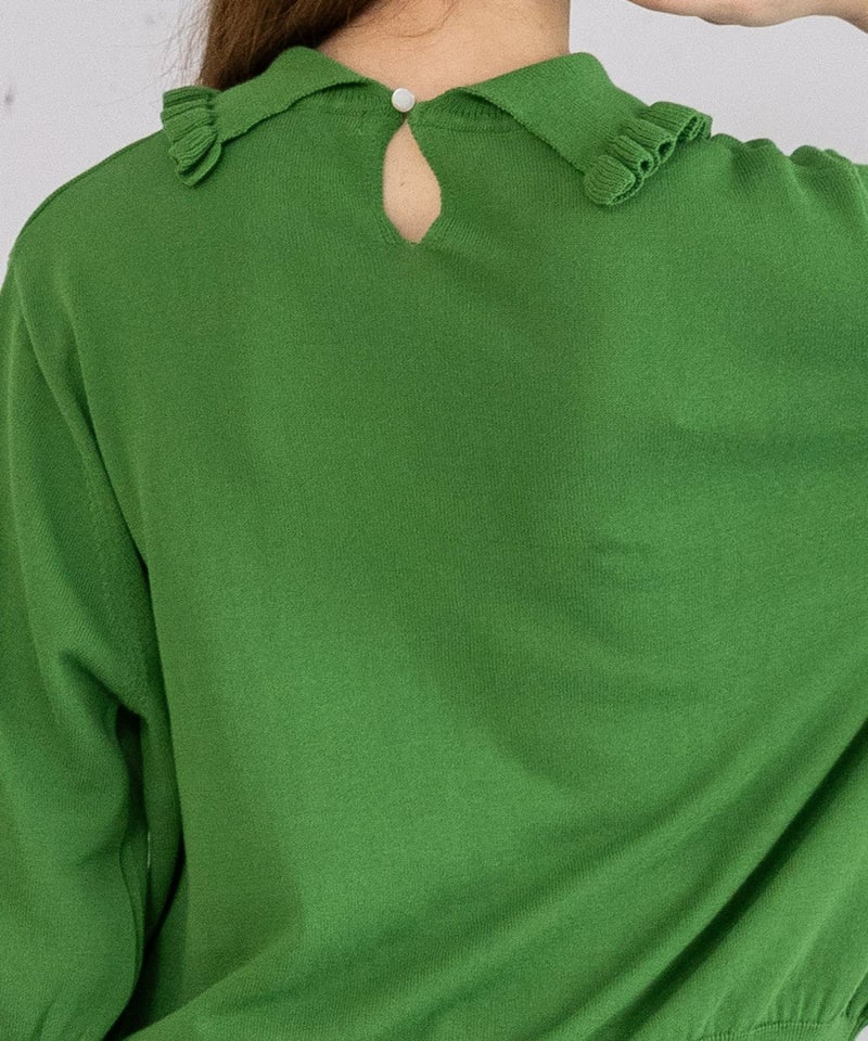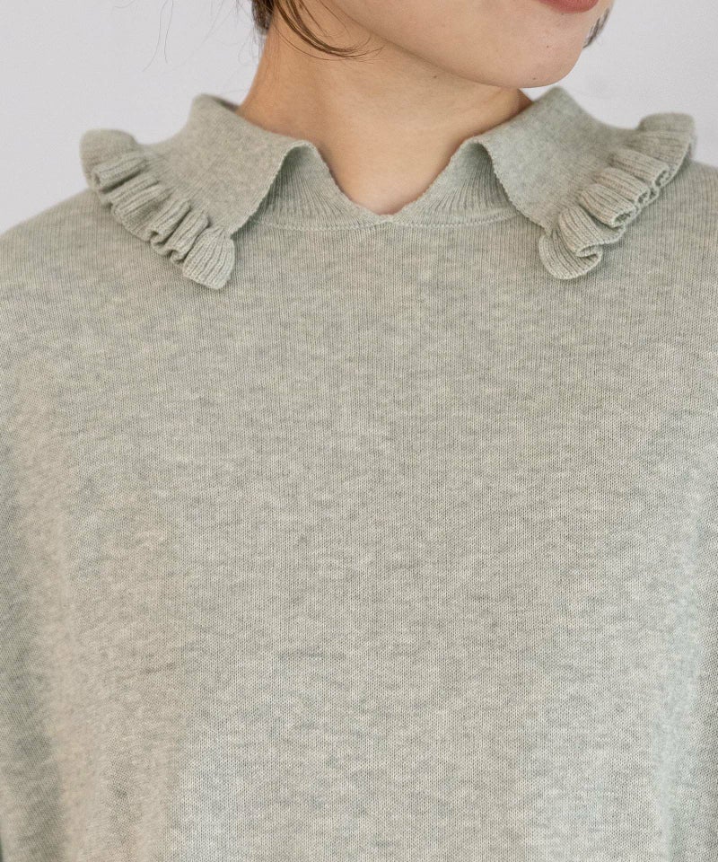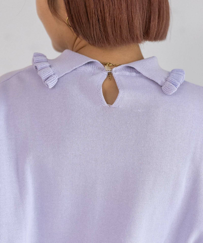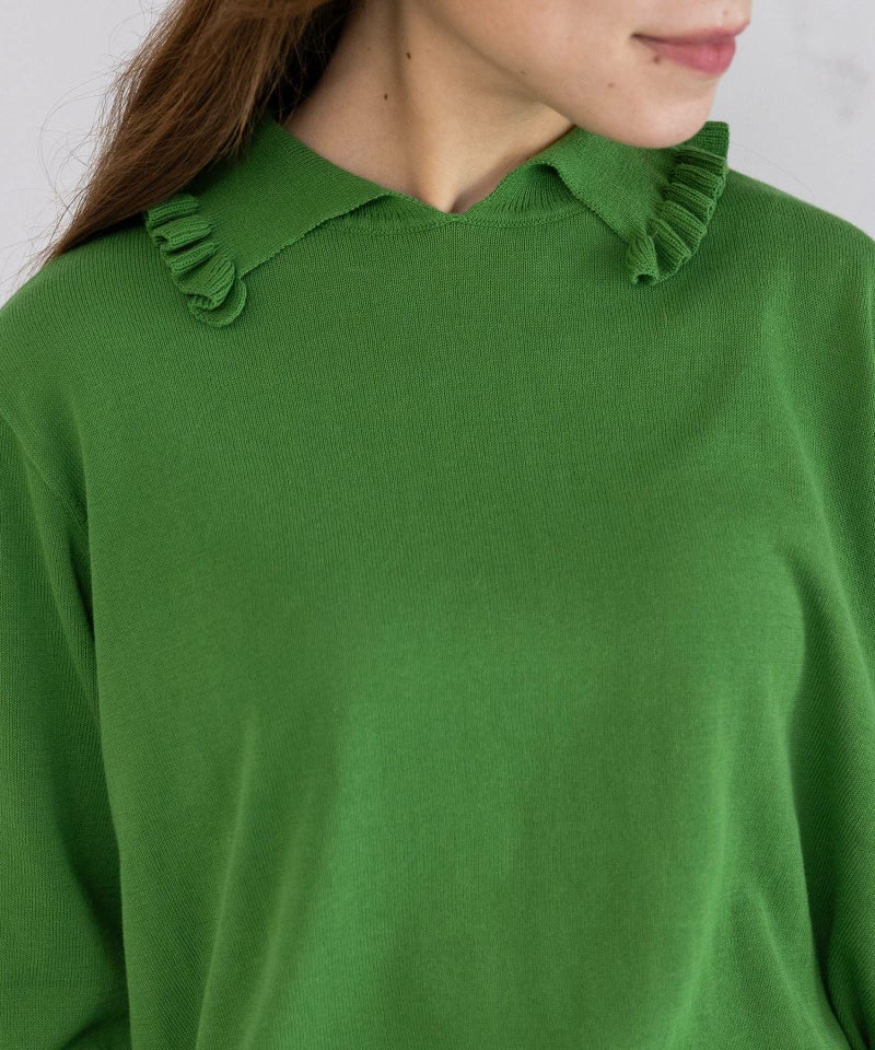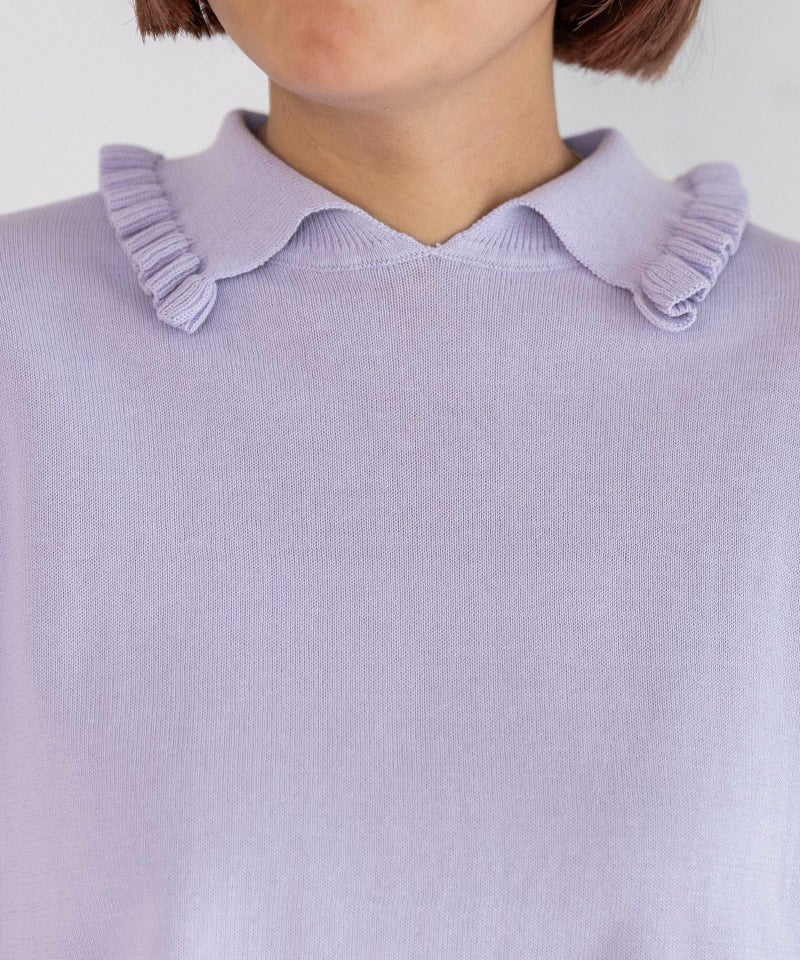 毛羽を抑えた強撚コットンで編み立てた、衿付きのニットプルオーバー。衿周りのフリルデザインがさりげないポイントです。きちんと感もありながら、程よくゆとりを持たせたシルエット。デニムやパンツを合わせたカジュアルスタイルから、スカートを合わせたきれいめスタイルまで幅広く着回し可能です。半端袖なので、ロンTやシャツを重ねたレイヤードスタイルも今っぽく着こなせます。