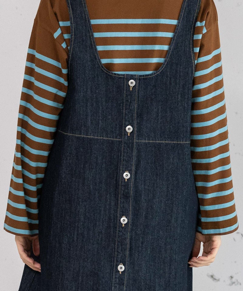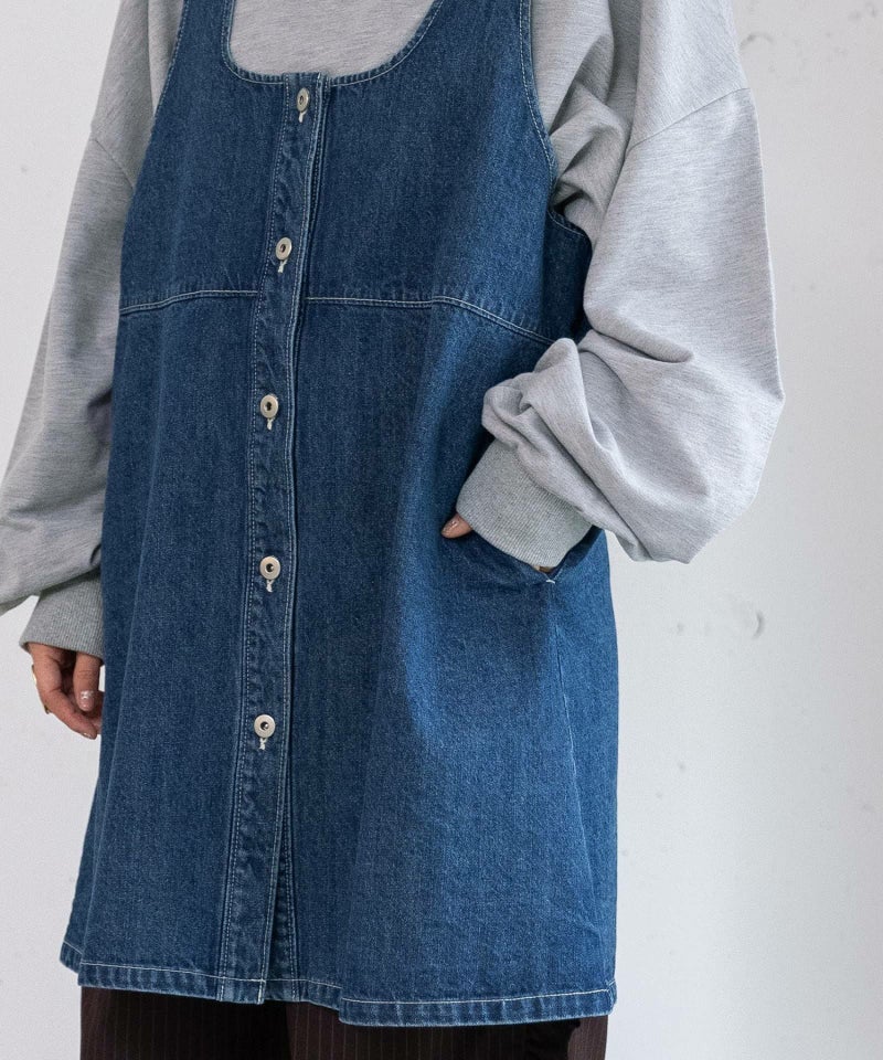 スクエアネックがどこか懐かしい印象の、デニム素材のオーバーベスト。深めのカッティングで、インナーを合わせても子供っぽくならず、すっきりと着こなせます。前後2WAY仕様で、Vネック側を前にした着用も可能。切り替え下にはフレアを入れ、ミニドレスのような雰囲気でも楽しめます。10オンスのデニム生地を使用し、薄手で軽やかな着心地も魅力。着こなし次第でさまざまな表情を見せてくれる、レイヤードが楽しい一枚です。