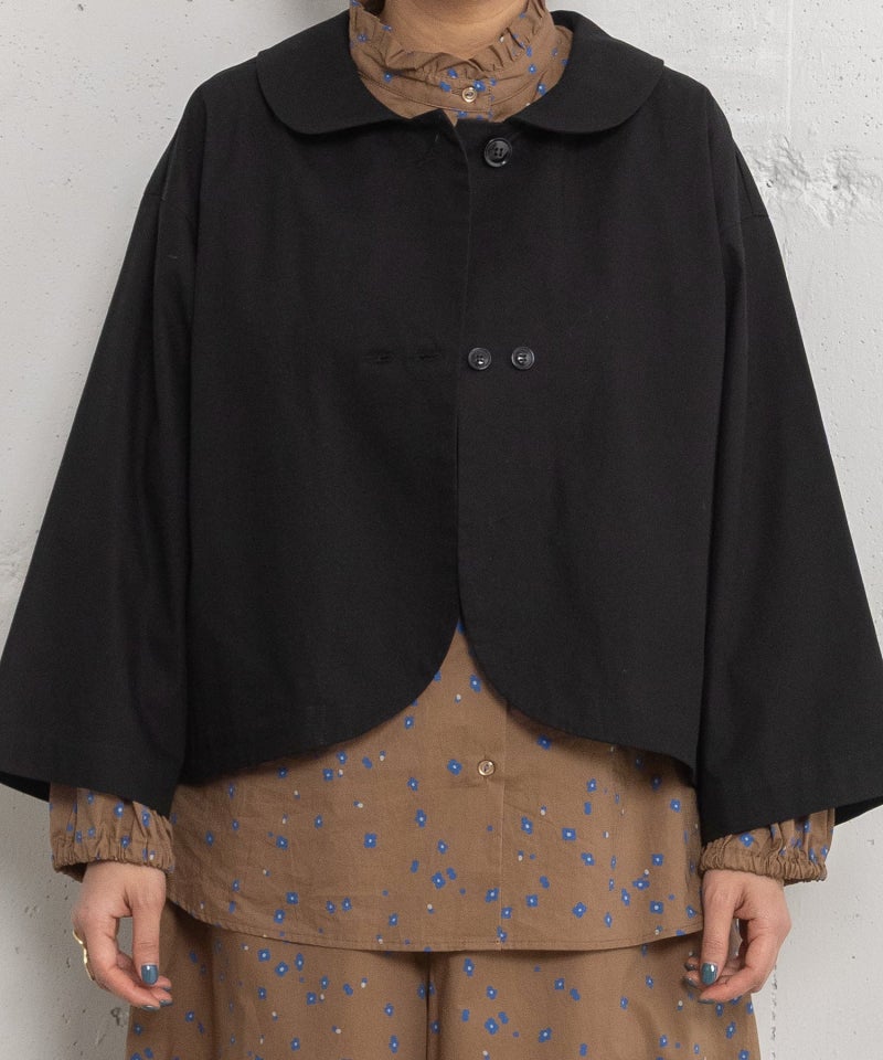 高密度のウェザークロスとデニムで仕立てたジャケット。シワになりにくく、着込むほどに柔らかく馴染んできます。上品な丸衿とダブルのボタンあきもポイント。前後で差をつけたクロップド丈ですっきりと着ていただけます。