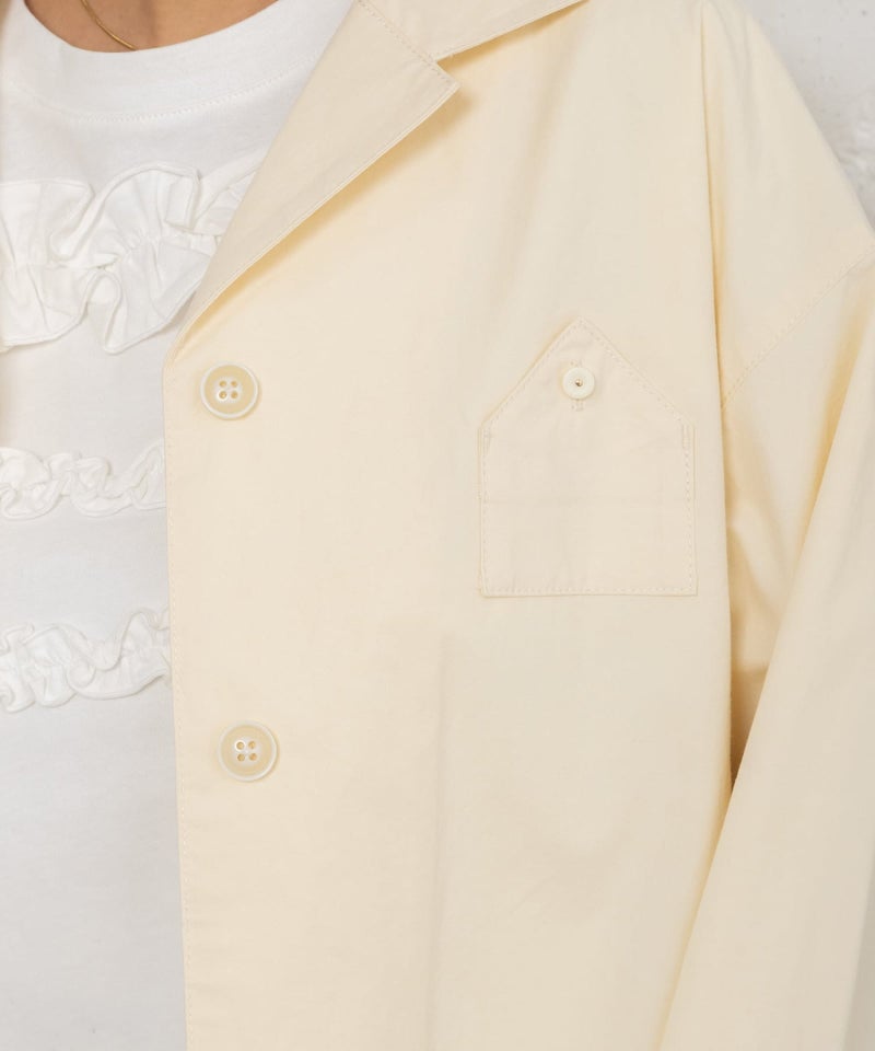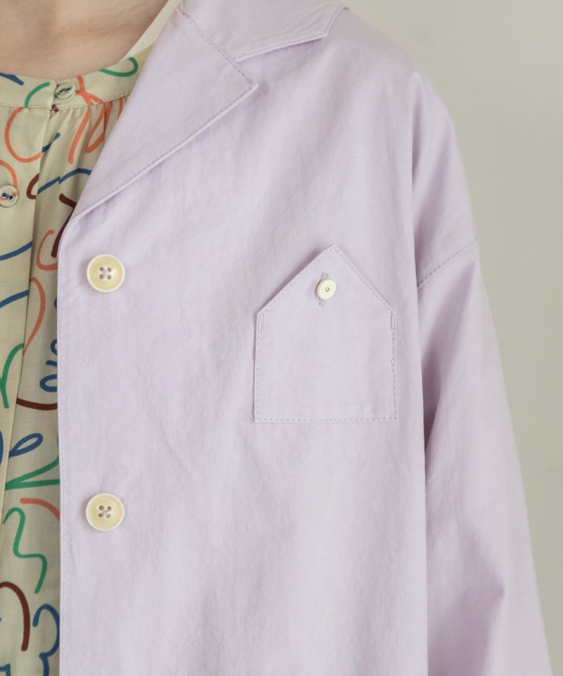 ラフに羽織れるシャツ素材のジャケット。袖口をまくって、よりカジュアルな着こなしも楽しめます。袖口をまくって、よりカジュアルな着こなしも楽しめます。左胸にはお家型のポケットをあしらいました。大きなパッチポケットは、スマートフォンを入れるのにも便利です。