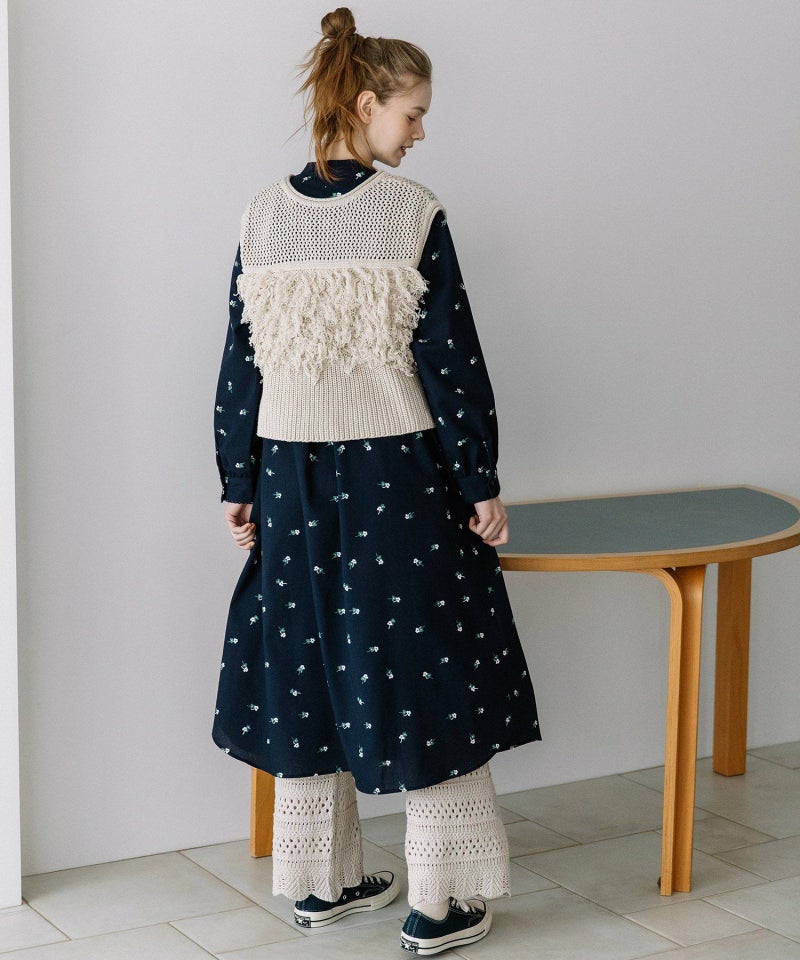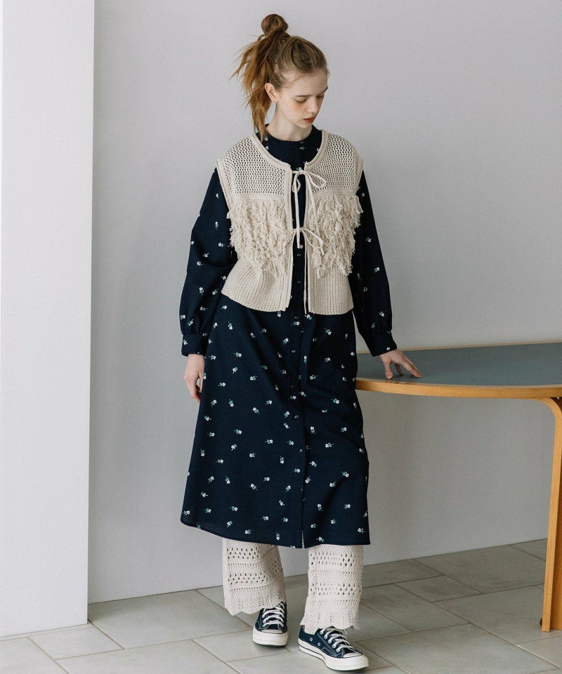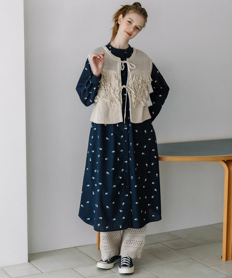 2色のクローバーをランダムにプリントした、オリジナルテキスタイルのワンピース。コットンリネン生地を使用し、ナチュラルな雰囲気に仕上げました。すっきりとしたバンドカラーのデザインで、寒い時期にはタートルネックインナーとのレイヤードもおすすめ。ニットベストやスウェットを重ねたスタイリングも可愛く決まります。前立てと袖口には同色系のトーションレースをあしらい、さりげないアクセントをプラス。両サイドには便利なポケット付きです。