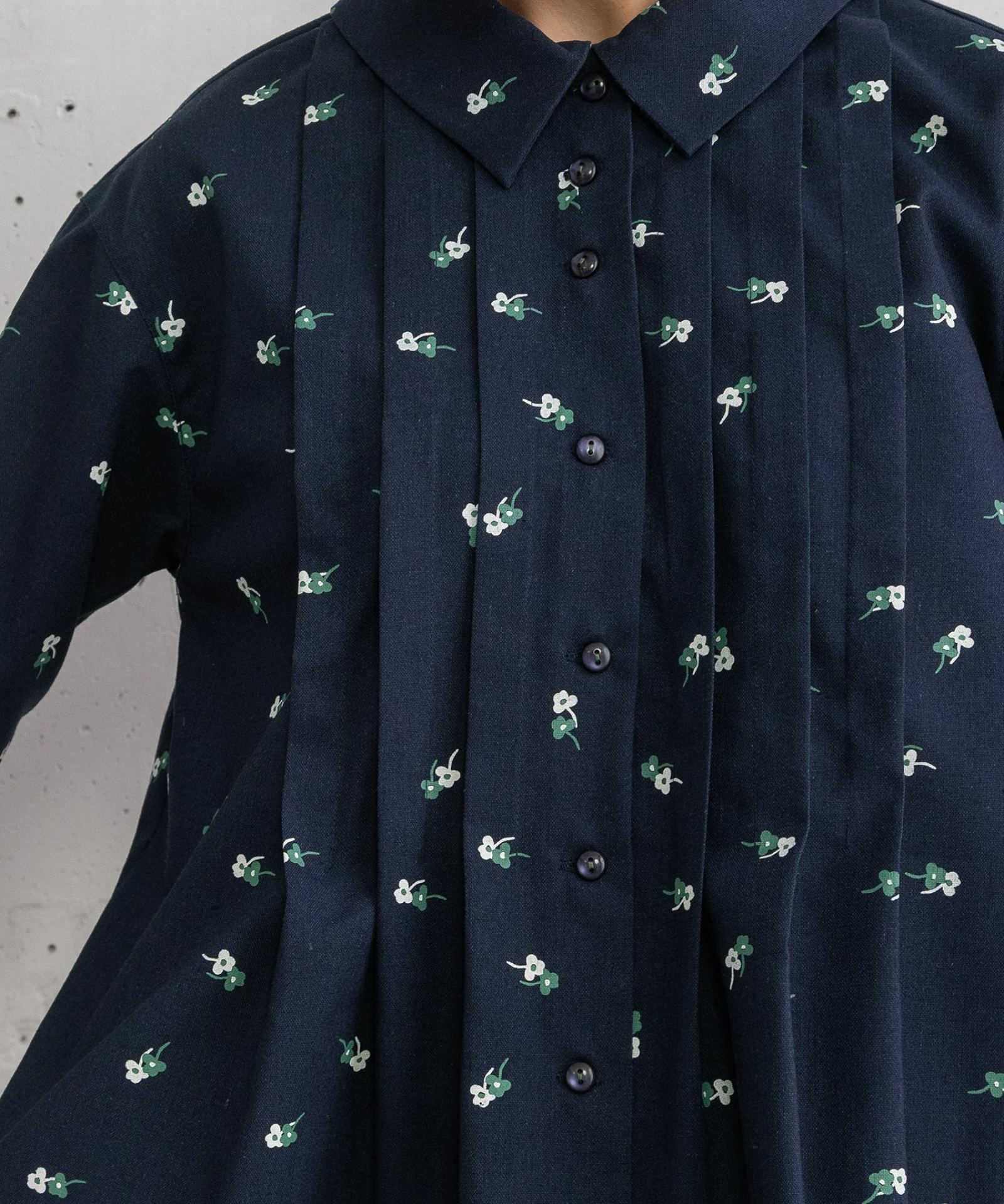 2色のクローバーをランダムにプリントした、オリジナルテキスタイルのブラウス。コットンリネン生地を使用し、ナチュラルな雰囲気に仕上げました。大きめのフラットカラーと、太幅のタックデザインがポイント。タック止まりからふんわりと広がる裾のシルエットも魅力です。袖口には同色系のトーションレースをあしらい、さりげないアクセントをプラスしました。