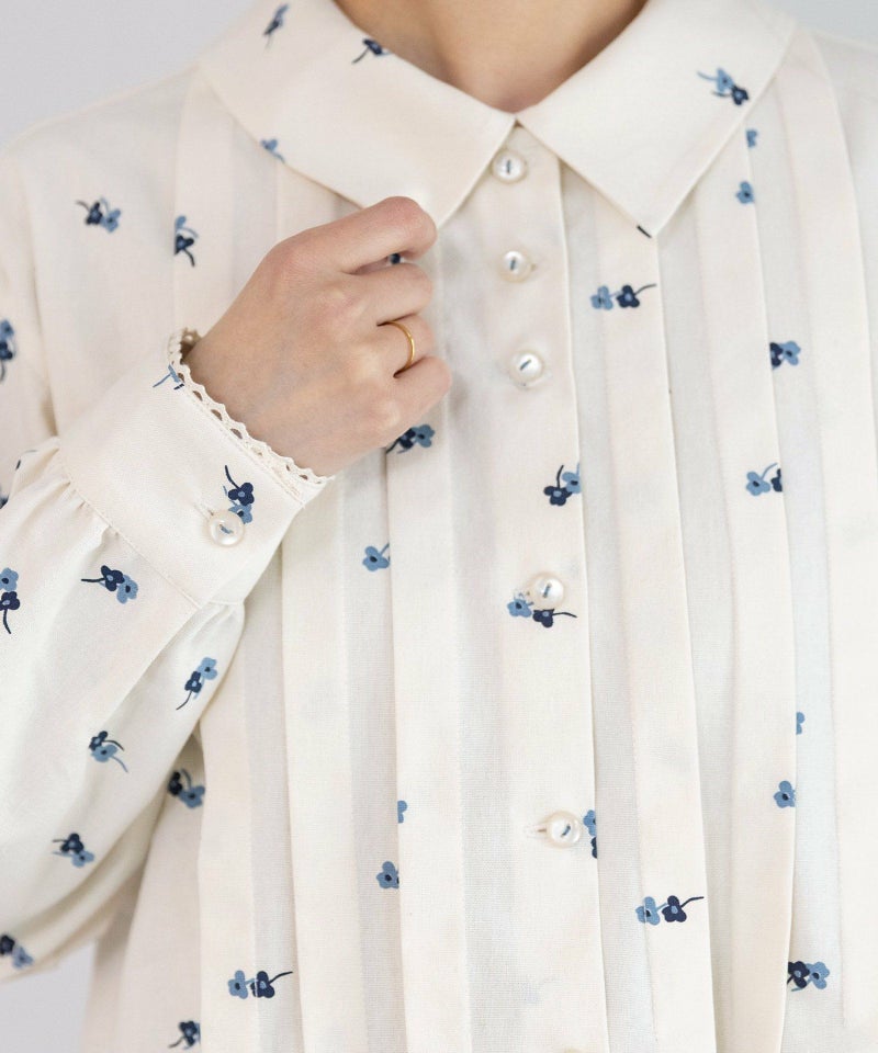 2色のクローバーをランダムにプリントした、オリジナルテキスタイルのブラウス。コットンリネン生地を使用し、ナチュラルな雰囲気に仕上げました。大きめのフラットカラーと、太幅のタックデザインがポイント。タック止まりからふんわりと広がる裾のシルエットも魅力です。袖口には同色系のトーションレースをあしらい、さりげないアクセントをプラスしました。