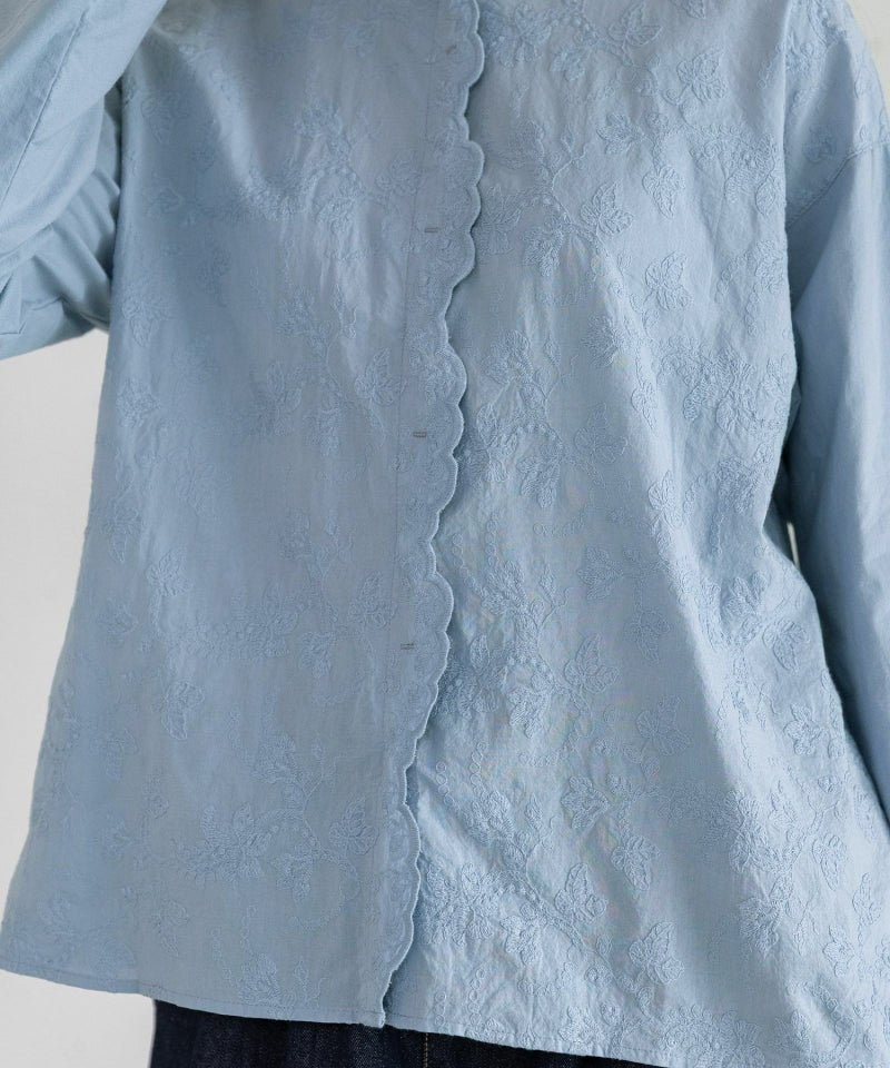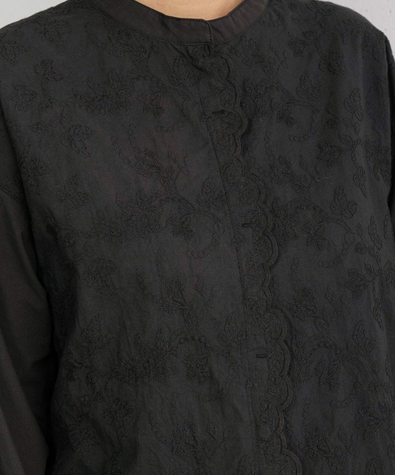 繊細な花柄レースが華やかで、存在感のあるブラウス。衿元はスタンドカラーにすることで、甘さを引き締めたクラシカルな雰囲気に仕上げています。前開きで、羽織としても着用可能。前端のスカラップレース使いがさりげないアクセント。袖口はすとんとしたストレートシルエットなので、まくってカジュアルに着ていただくのもおすすめです。