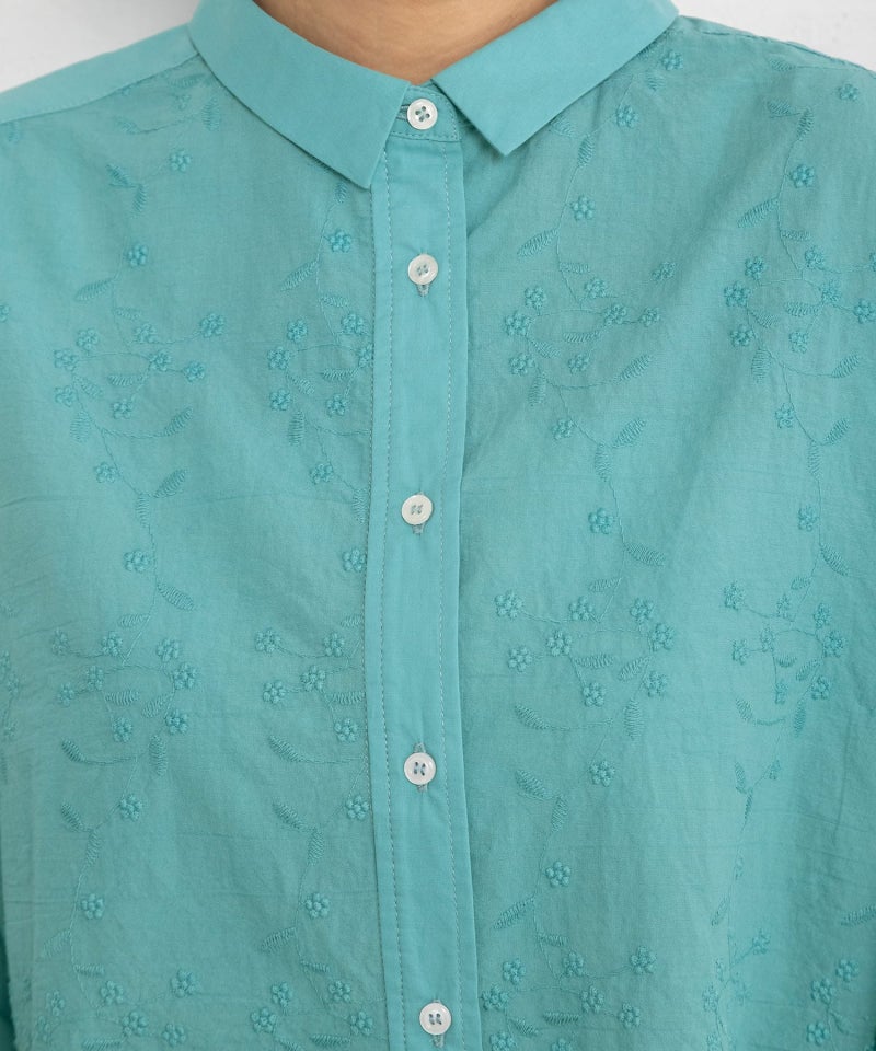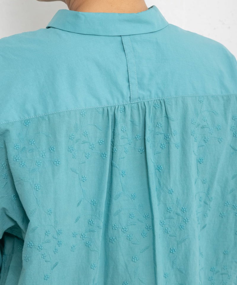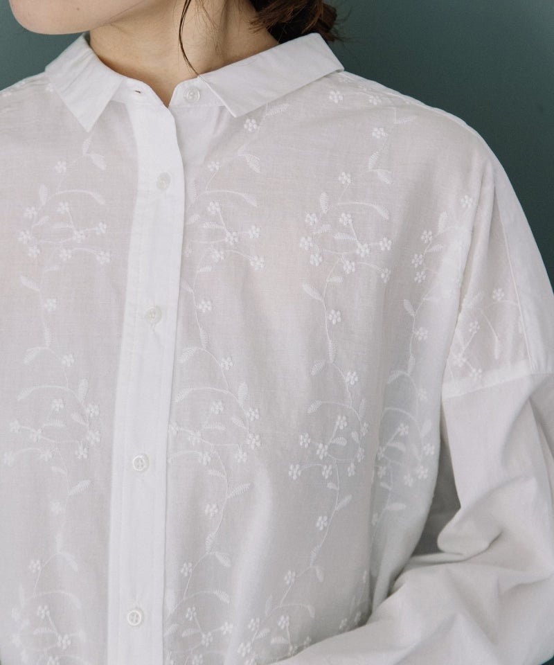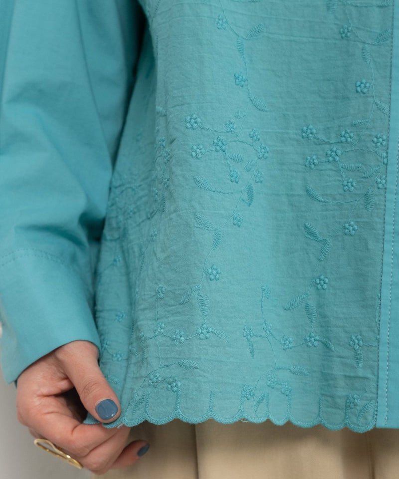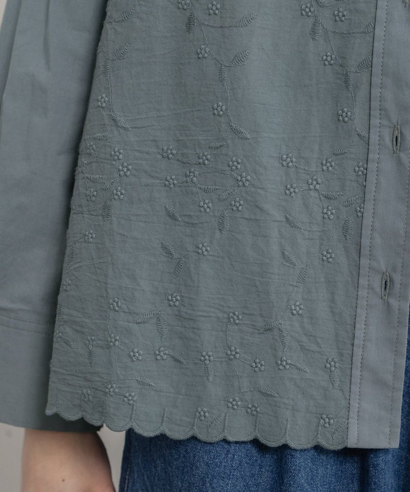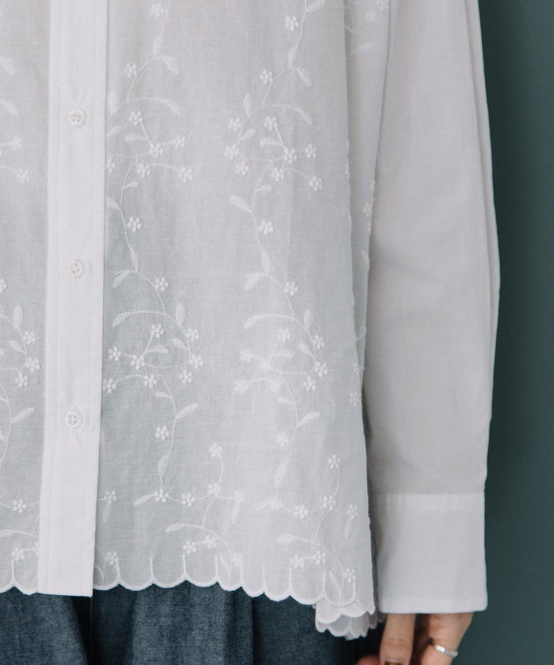 フロント、裾のスカラップ刺繍がポイントのブラウス。レギュラーカラーできちんと感もあります。肌あたりの優しいコットン素材で通年着ていただけます。ジャケットなどの下に重ねて裾をちら見せさせたり、フルオープンで羽織りとしても着用して頂けます。