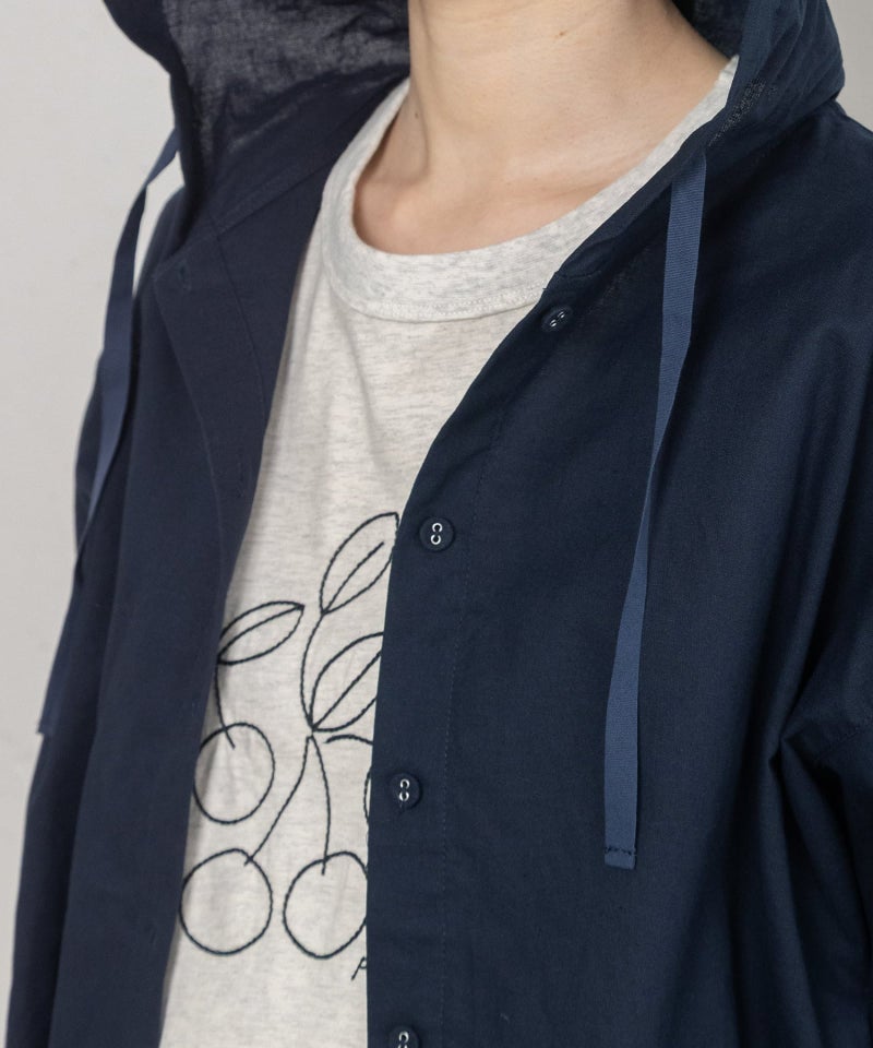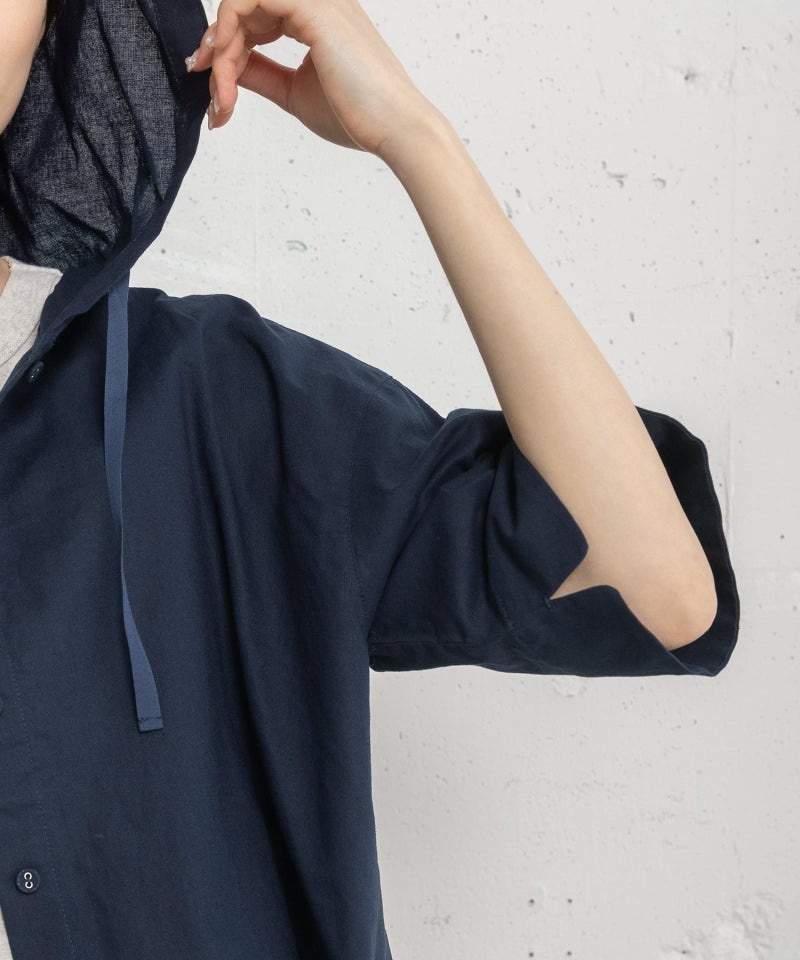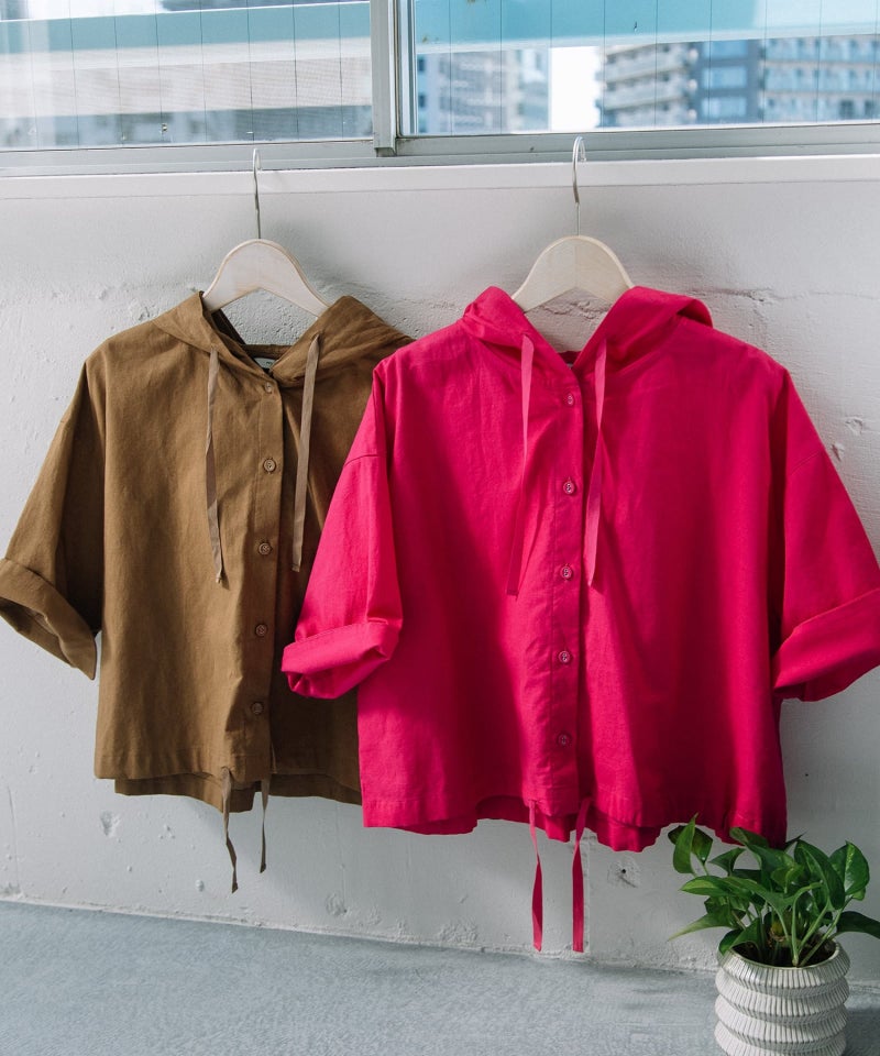 トレンドスタイルに欠かせないクロップド丈のシャツ。フードをつけてカジュアルな雰囲気に仕上げました。コットンリネン素材を使用しているので普段使いにぴったり。Tシャツに羽織ると素材のコントラストが、さりげないアクセントに。フード周りと裾にひもを通しているので、シルエットの調節が可能です。