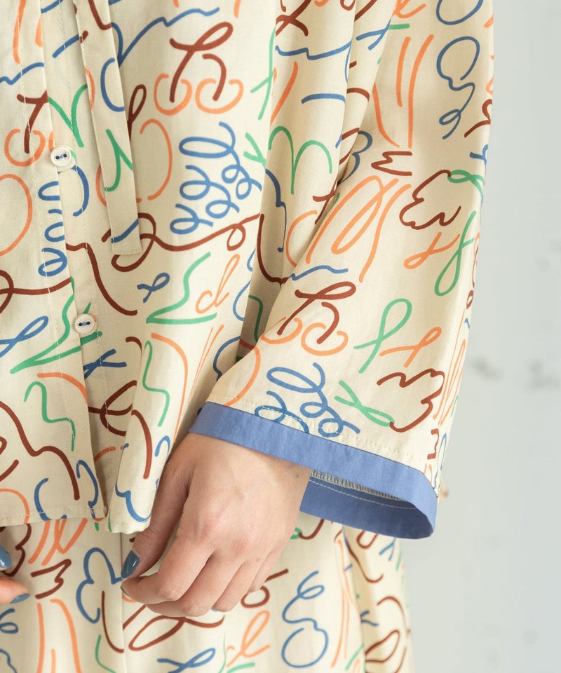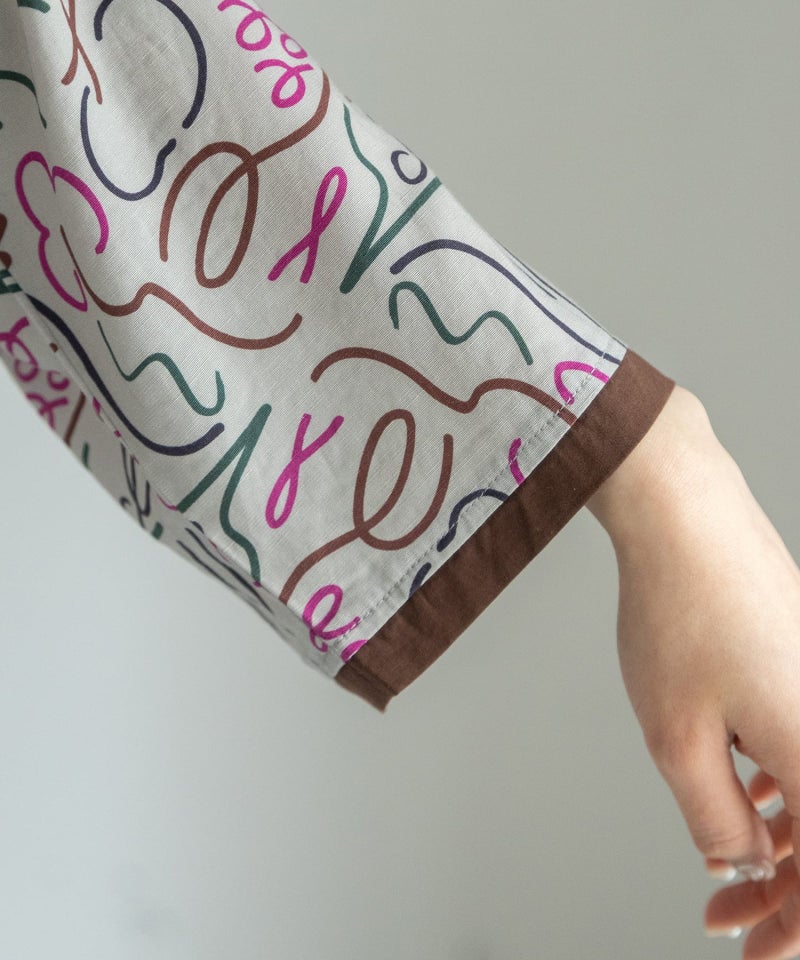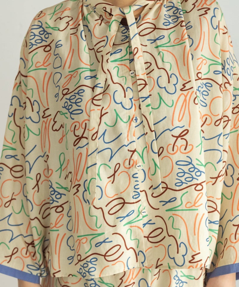 フルーツやロゴを踊るような線で表現したオリジナルテキスタイルのブラウス。さくらんぼやブドウのモチーフに、ブランド名の「p」と「d」の文字をミックスしています。微光沢があり、落ち感のある素材を使用した特別感のあるアイテムです。スタンドカラーから続くリボンディテールがポイントのブラウスは、羽織としても着られます。キャッチーなプリント柄で、1枚でもサマになるデザイン。袖口の配色使いもポイントです。