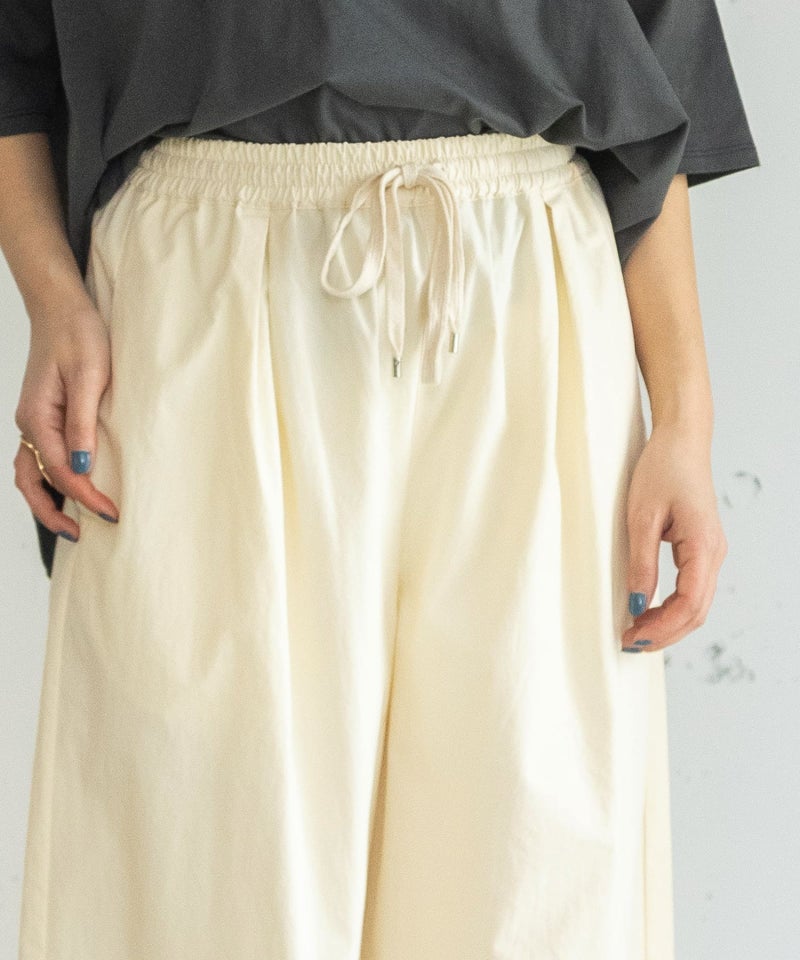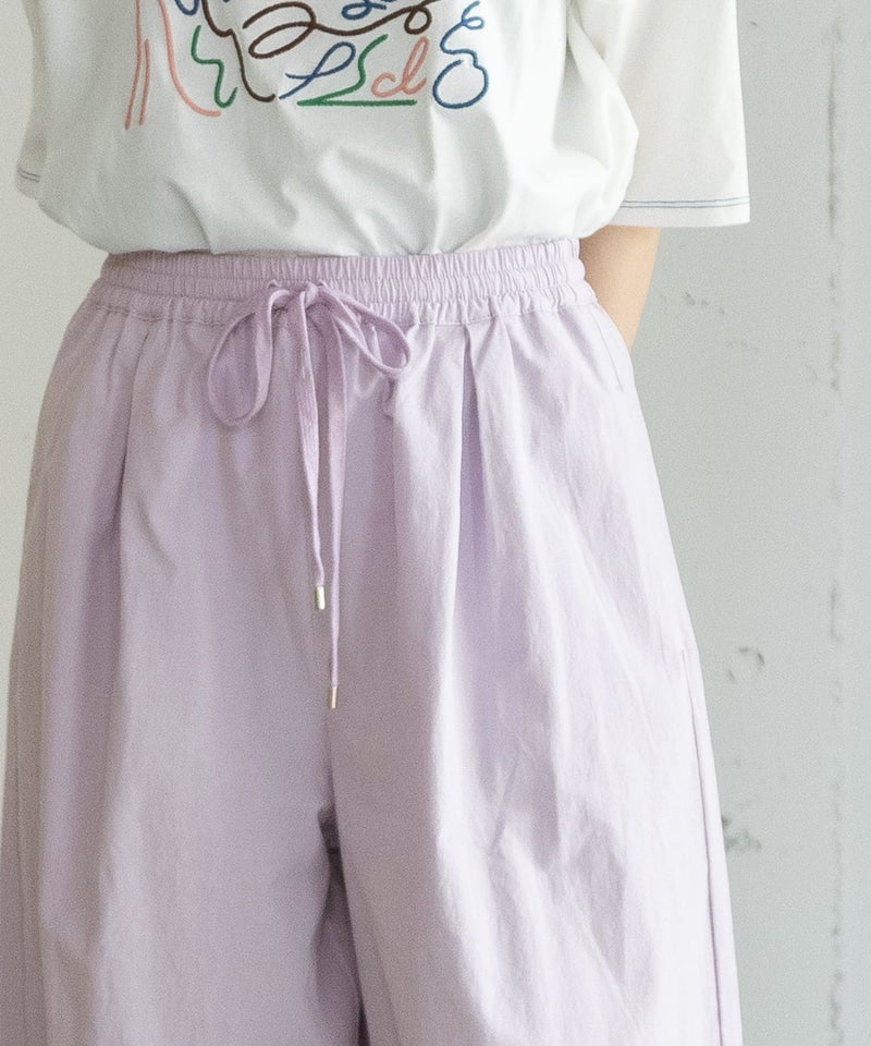 シャツ素材で仕立てたカジュアルな雰囲気のイージーパンツ。ややワイドなシルエットで動きやすく、合わせるトップスを選びません。ウエストはゴム仕様と調整可能な紐つきで楽な履き心地。両サイドポケット付き。